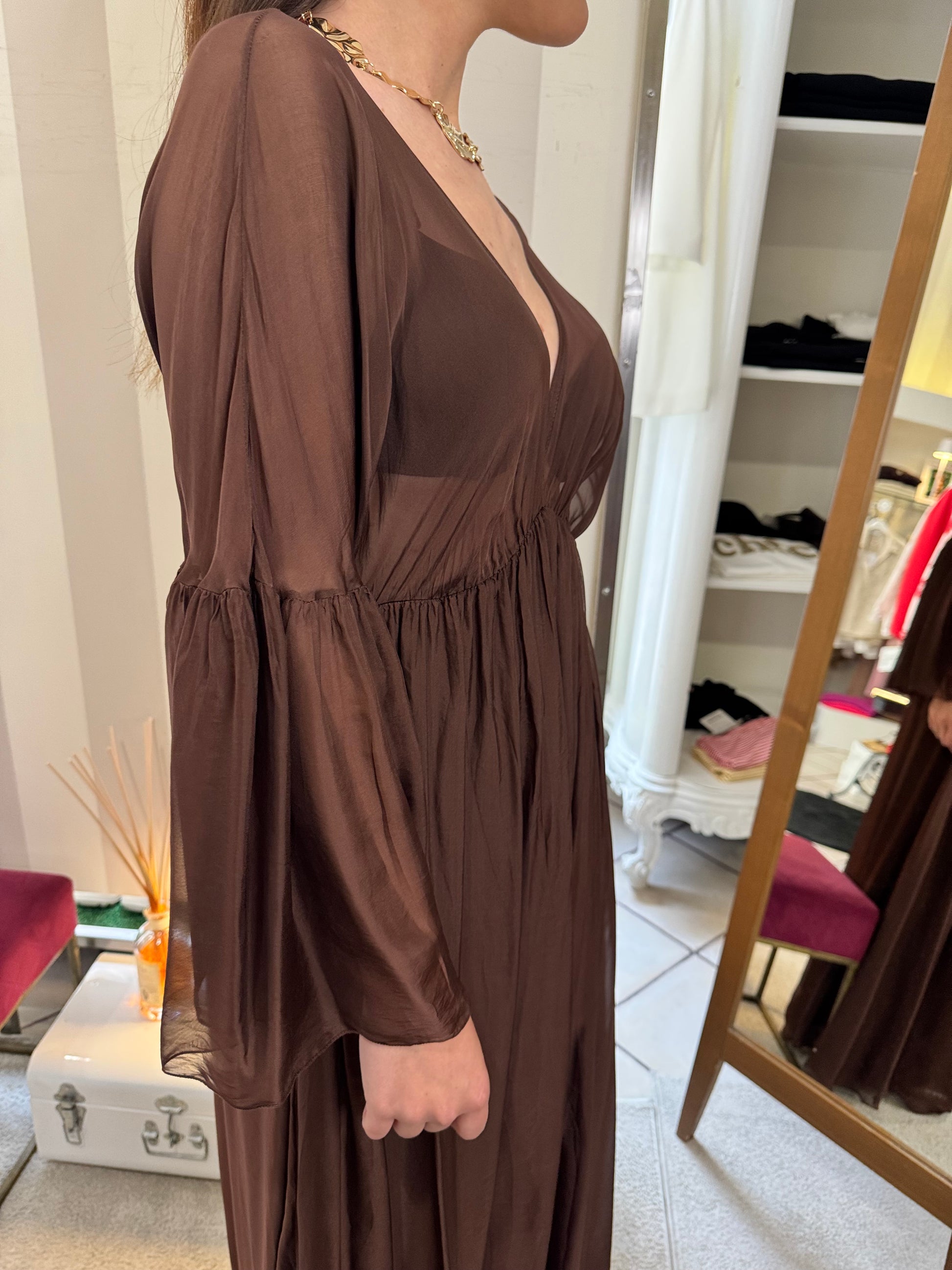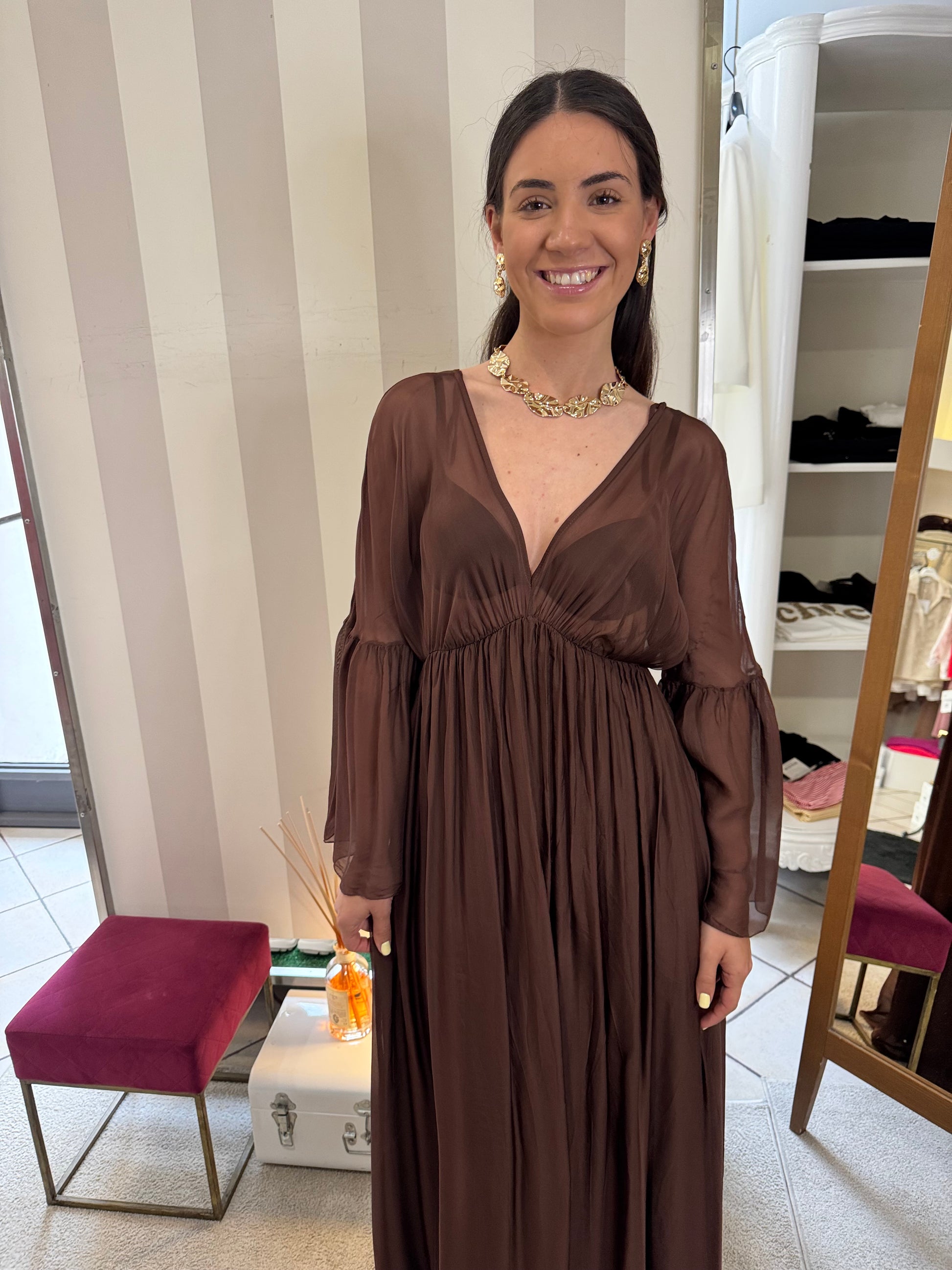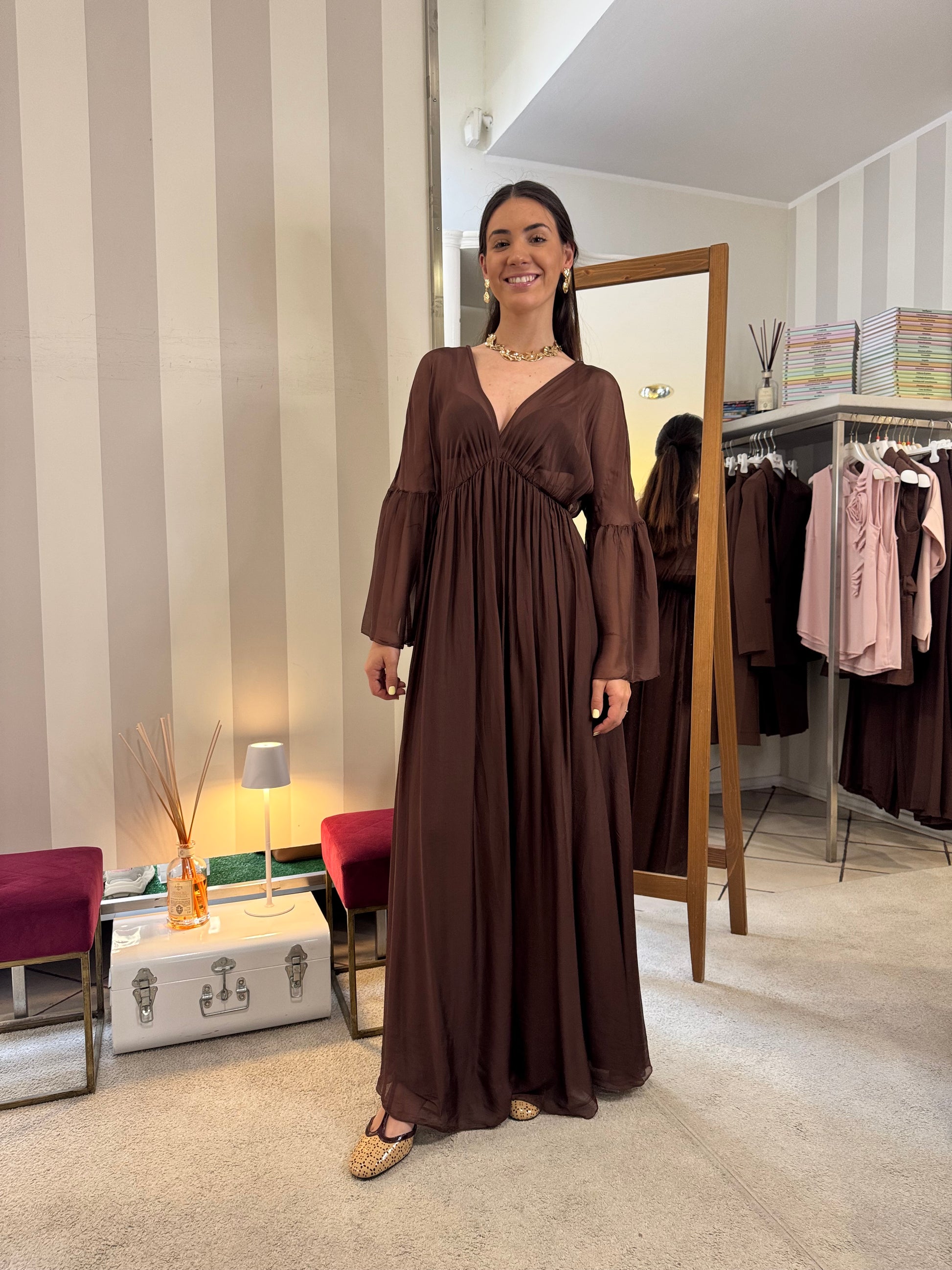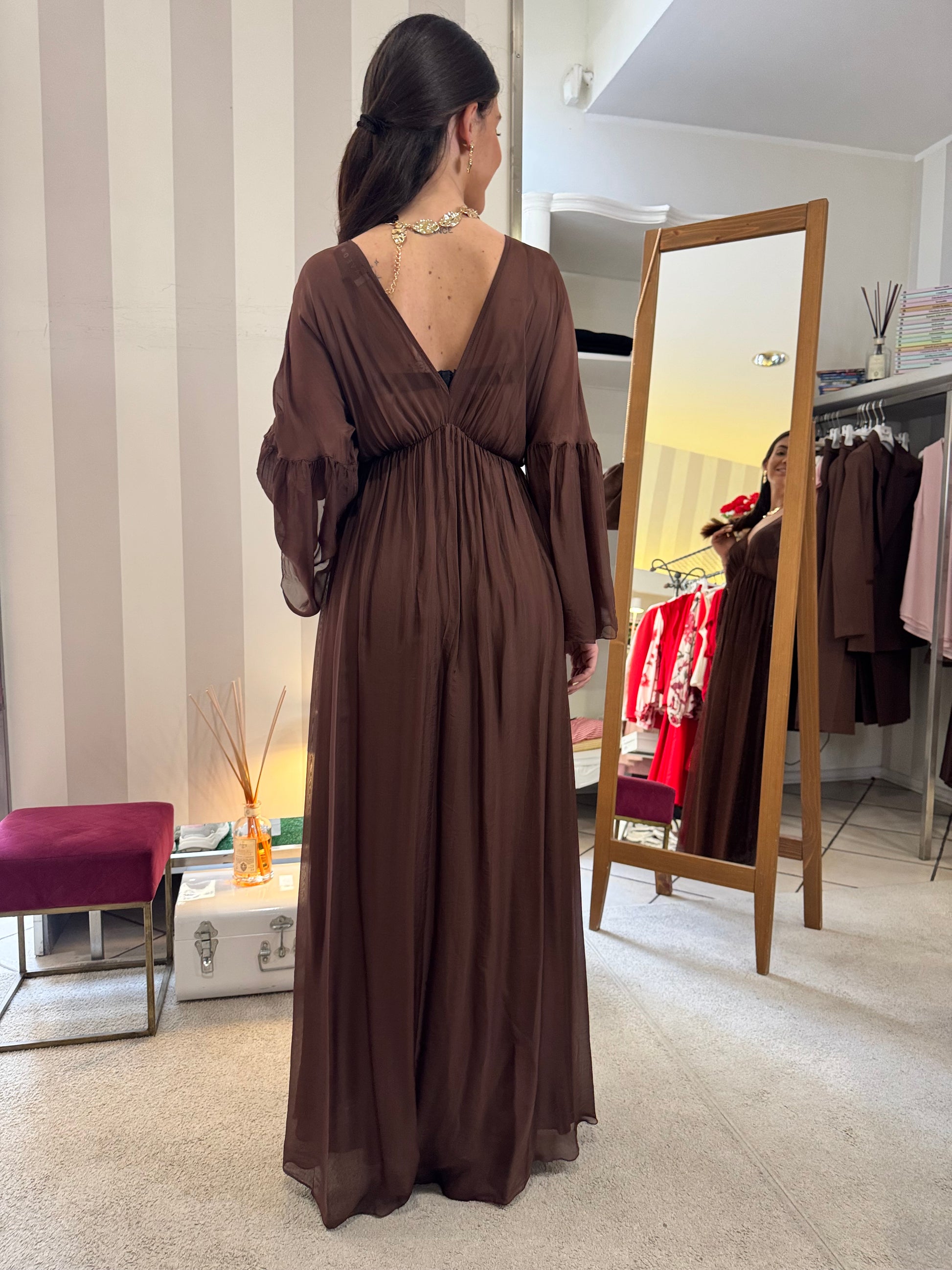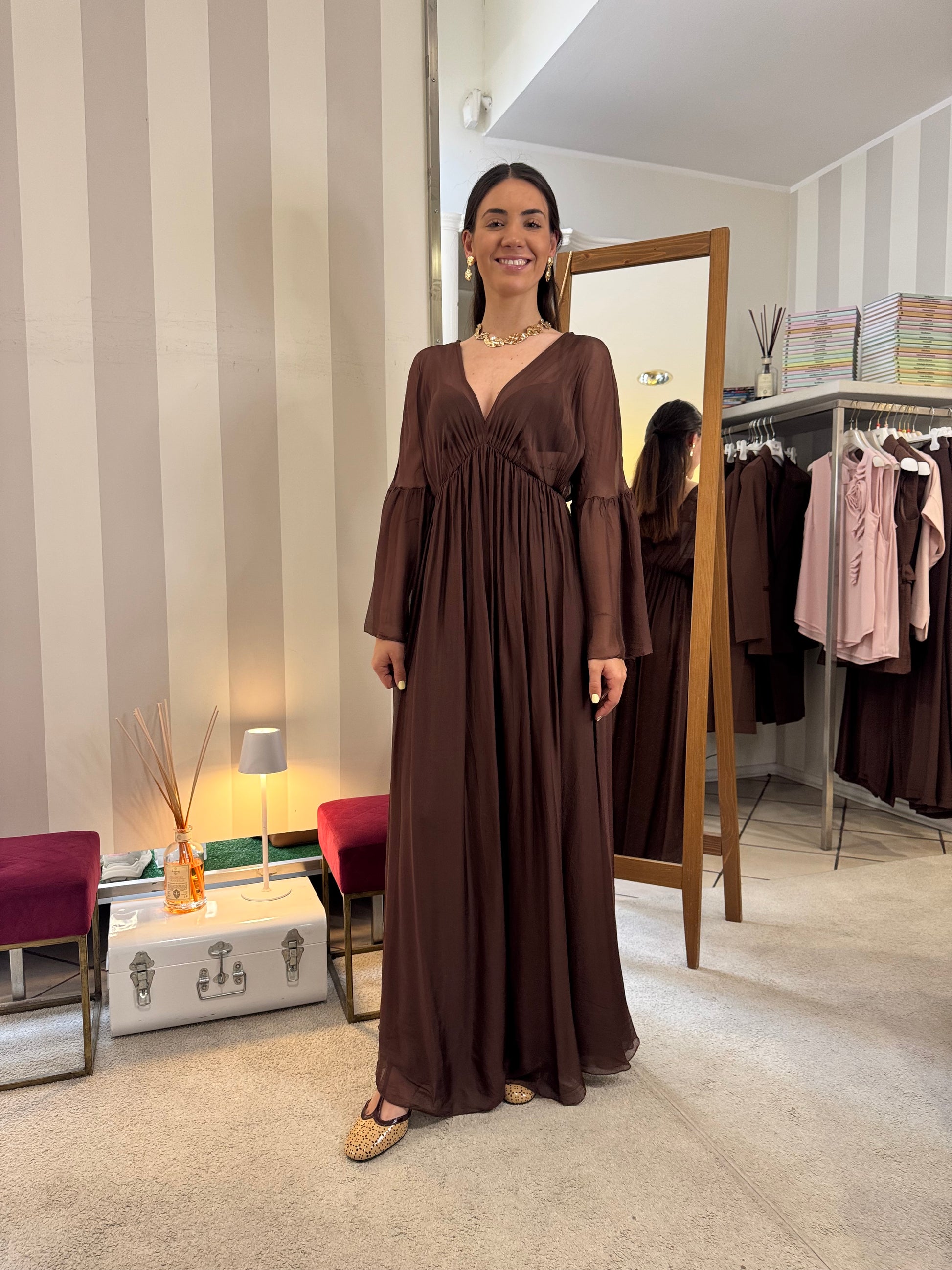 Descrizione: abito lungo in seta con manica a campana,taglio impero sul seno,scollo a V profondo,con sottogonna in cotone lunga
