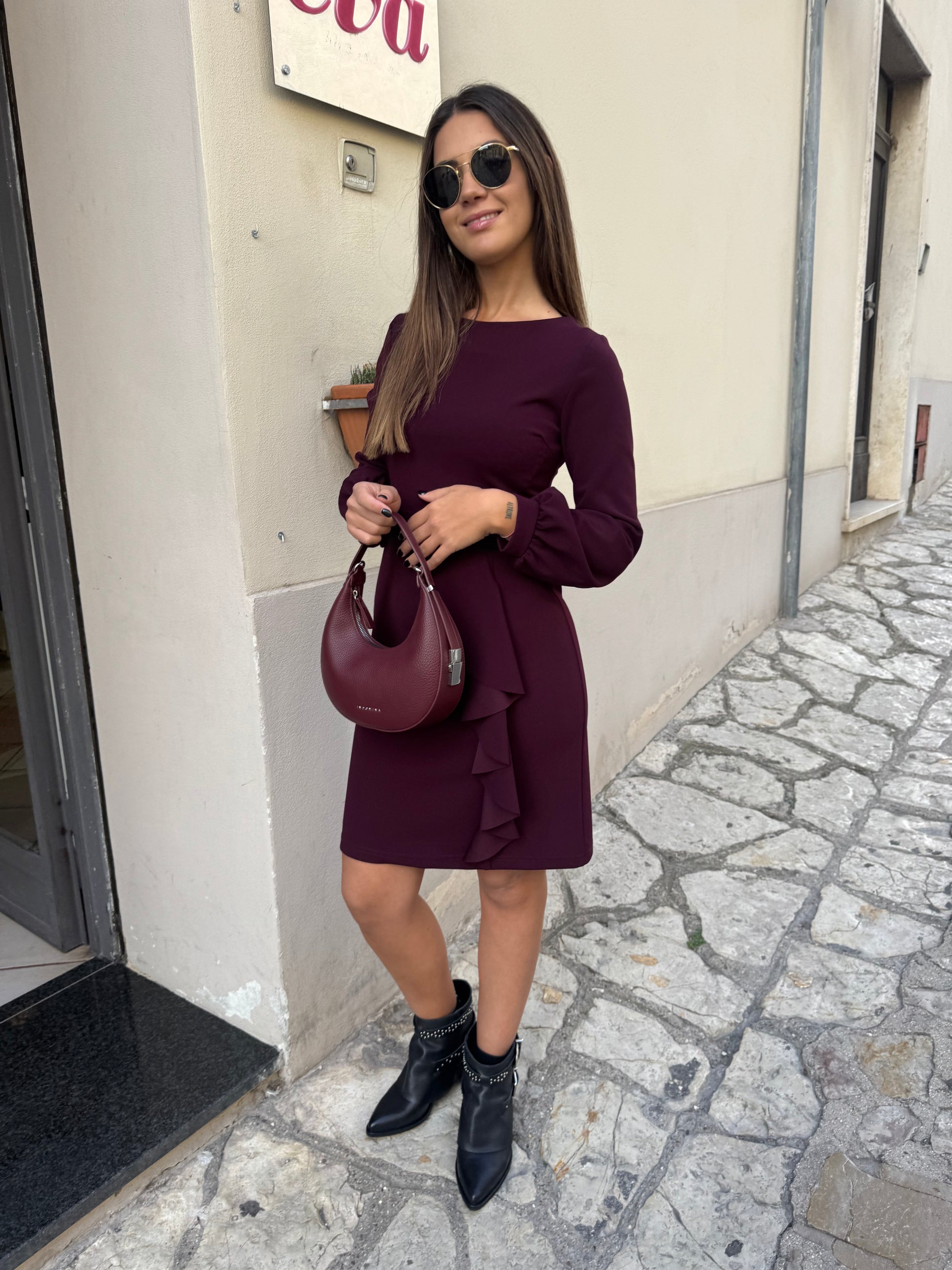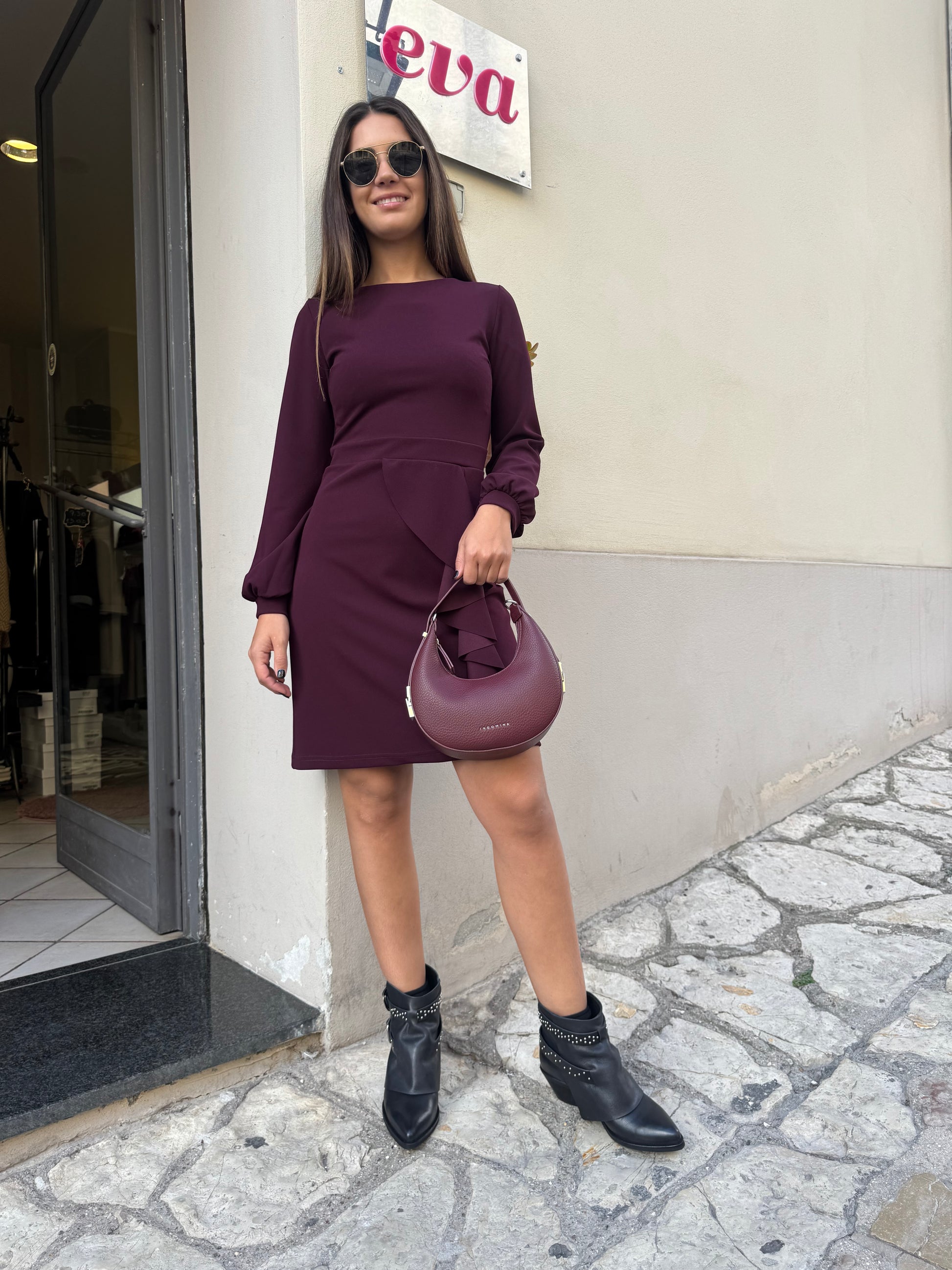 Descrizione: Abito a tubino con manica lunga, taglio in vita e volant sulla gonna