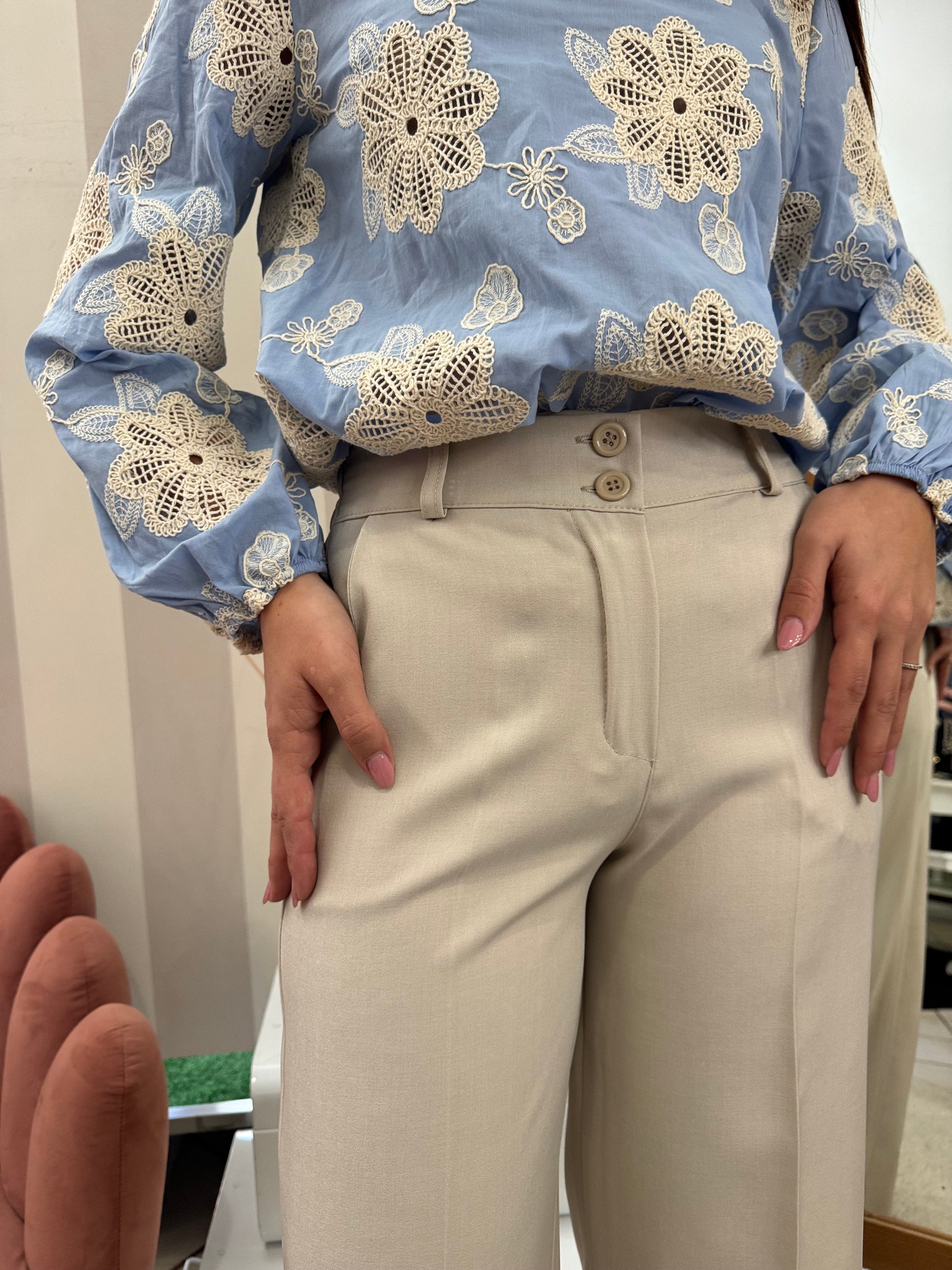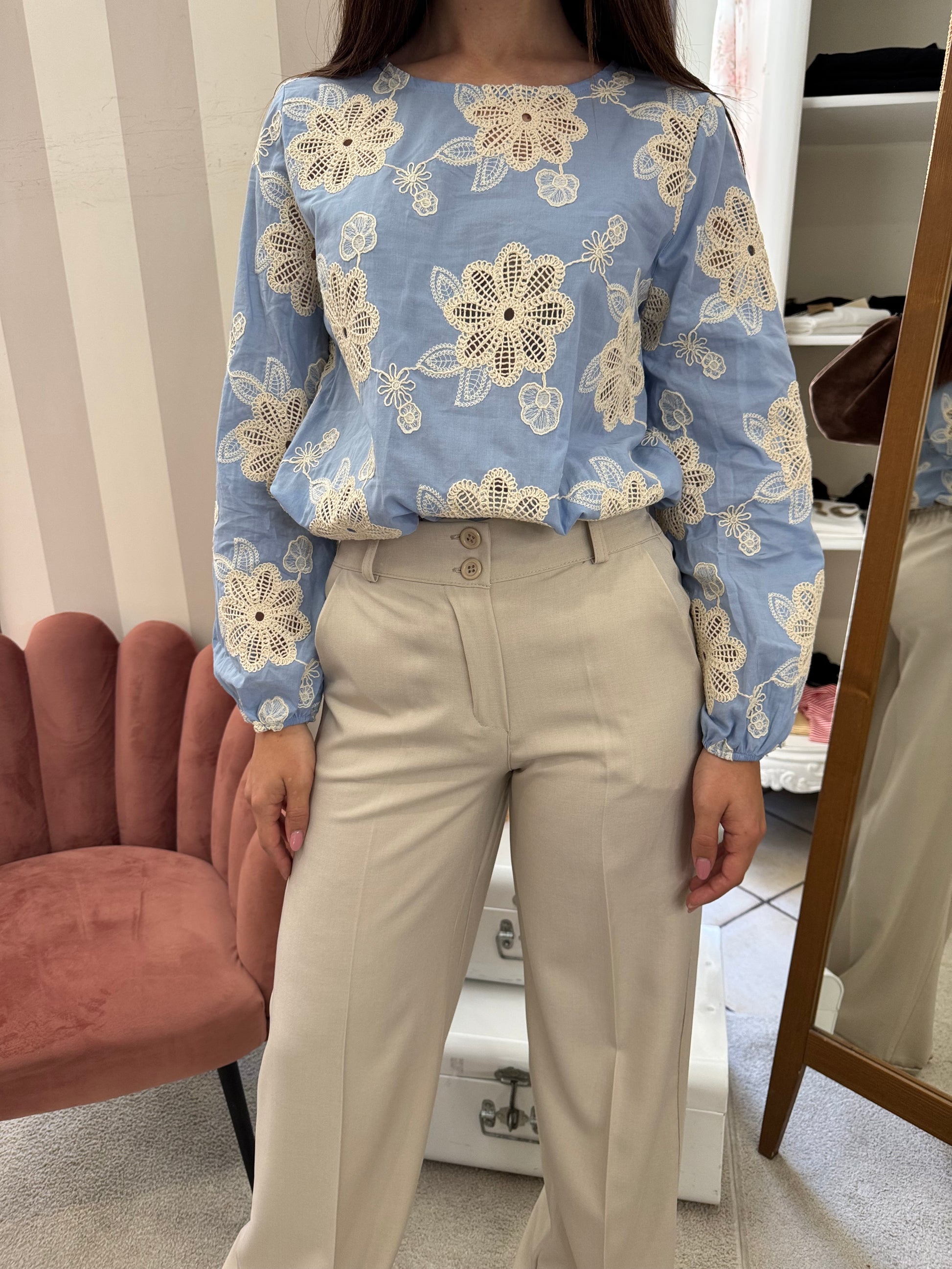Descrizione: Blusa con fiori ricamati in macrame, girocollo,elastico sul fondo della manica