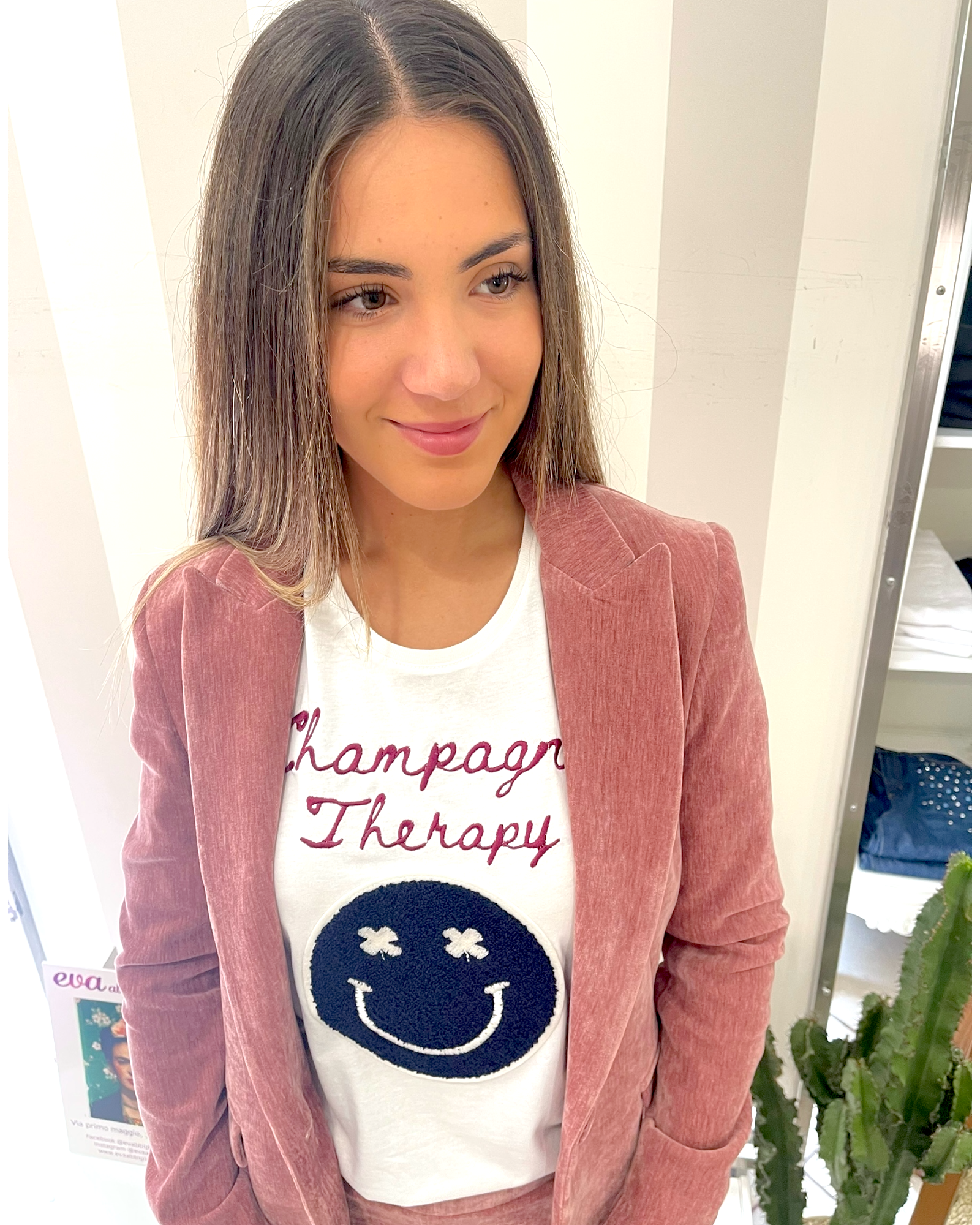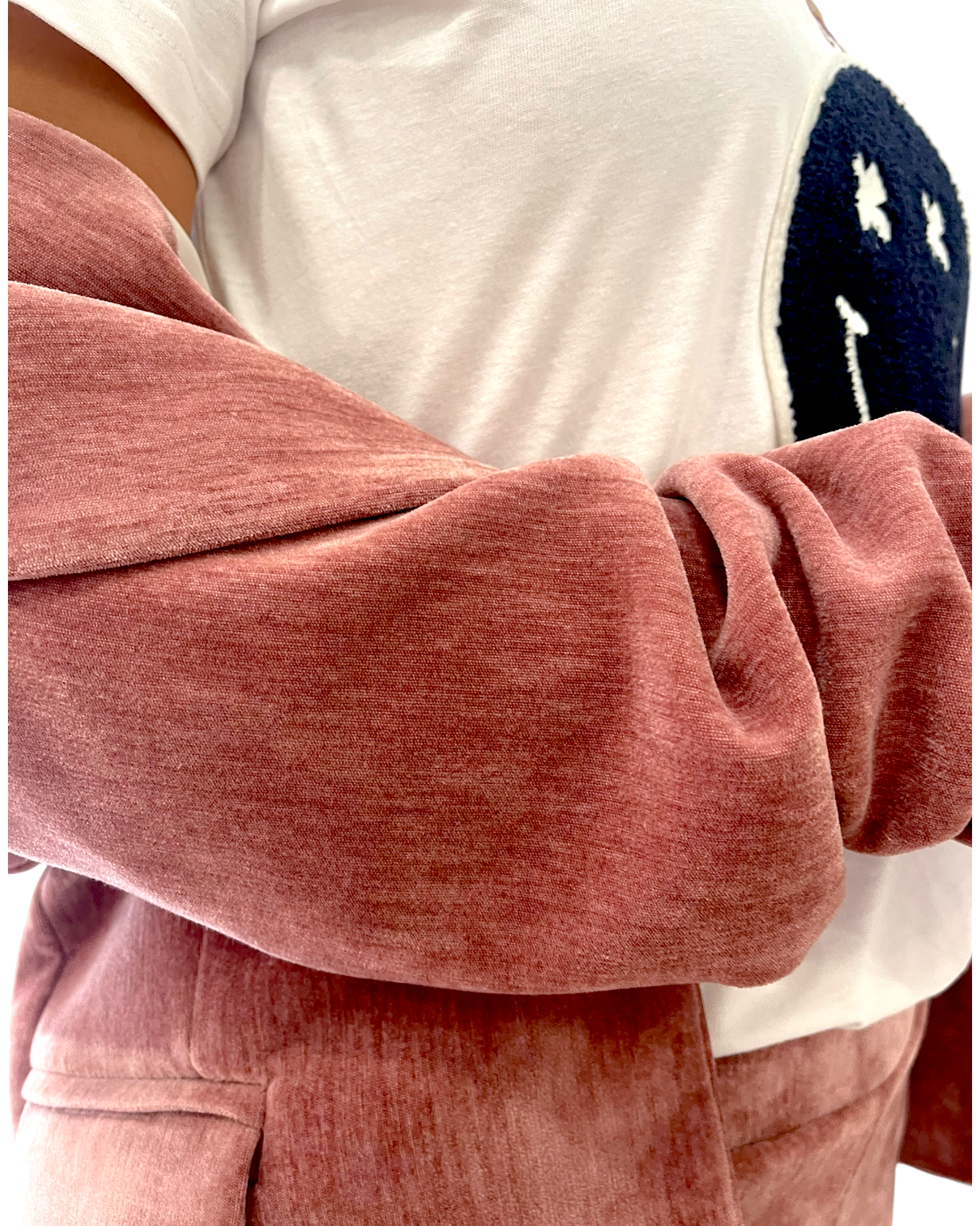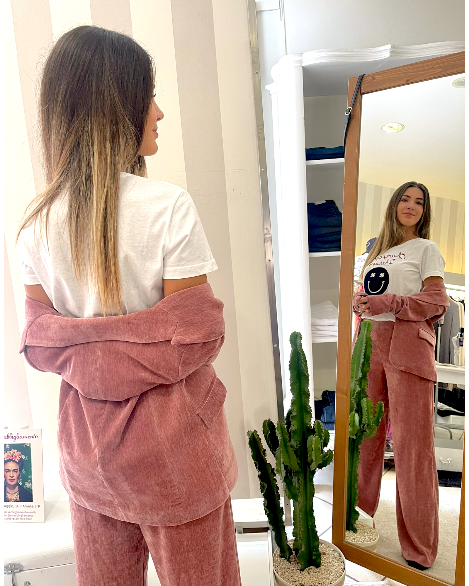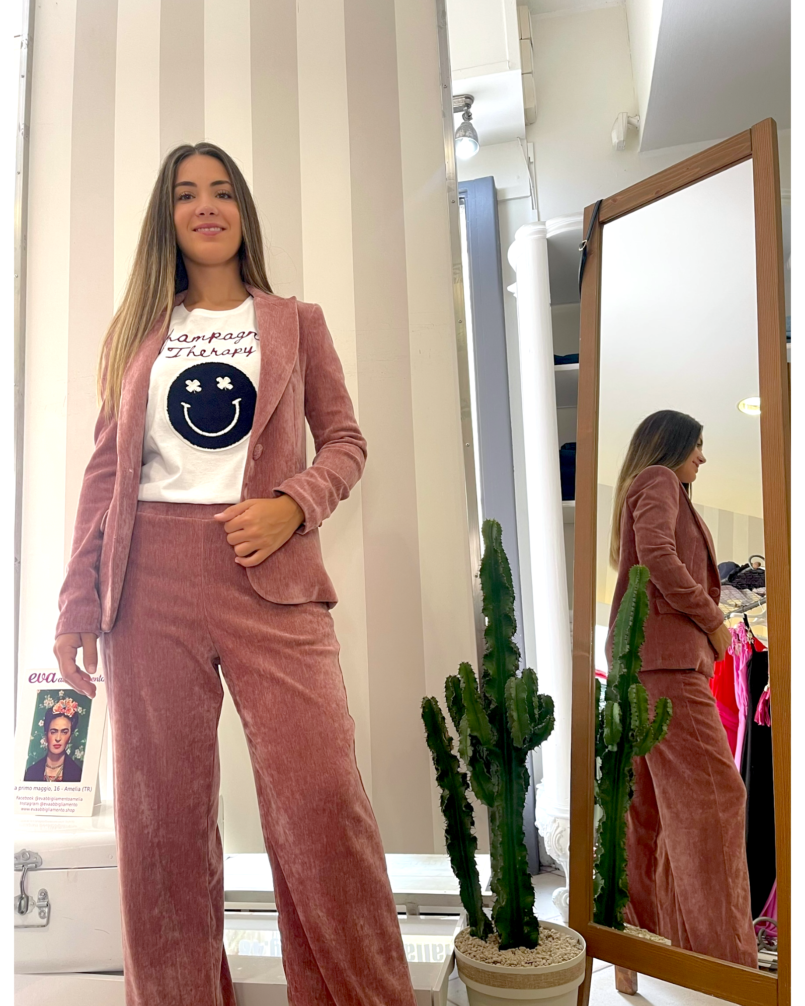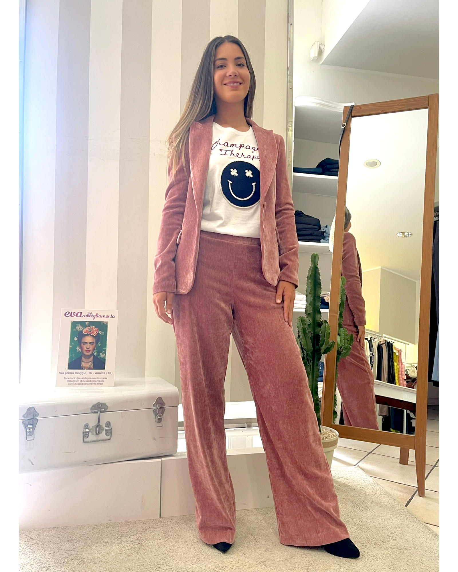 Descrizione: Completo in velluto liscio Kontatto, composto da giacca taglio lungo con un bottone e pantalone gamba ampia con elastico posteriore e tasche frontali.