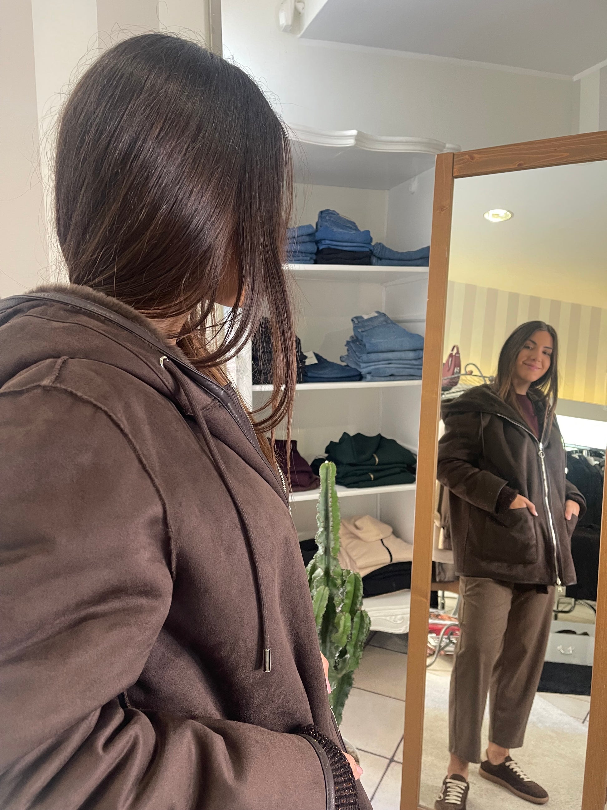 Descrizione: Cappotto due in uno,eco montone da un lato ed eco pelliccia dall’altro,chiusura con zip e due tasche (su entrambi i lati),cappuccio