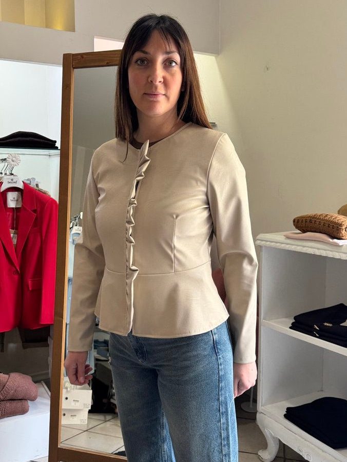 Descrizione: Giacchina in ecopelle con rouches sul davanti,chiusura con zip,taglio corto