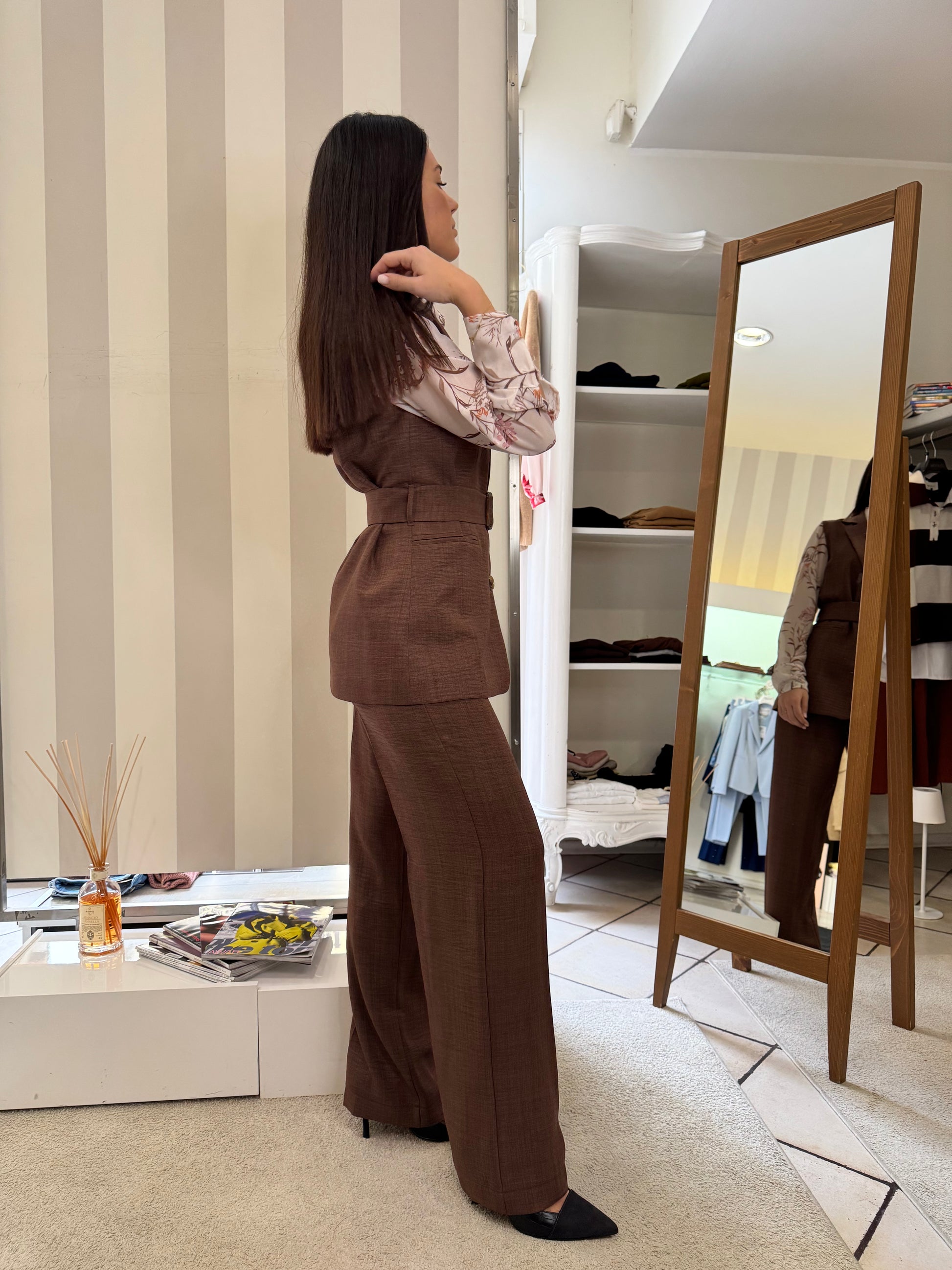 Descrizione: Gilet dal taglio lungo, chiusura doppiopetto e cinta in vita