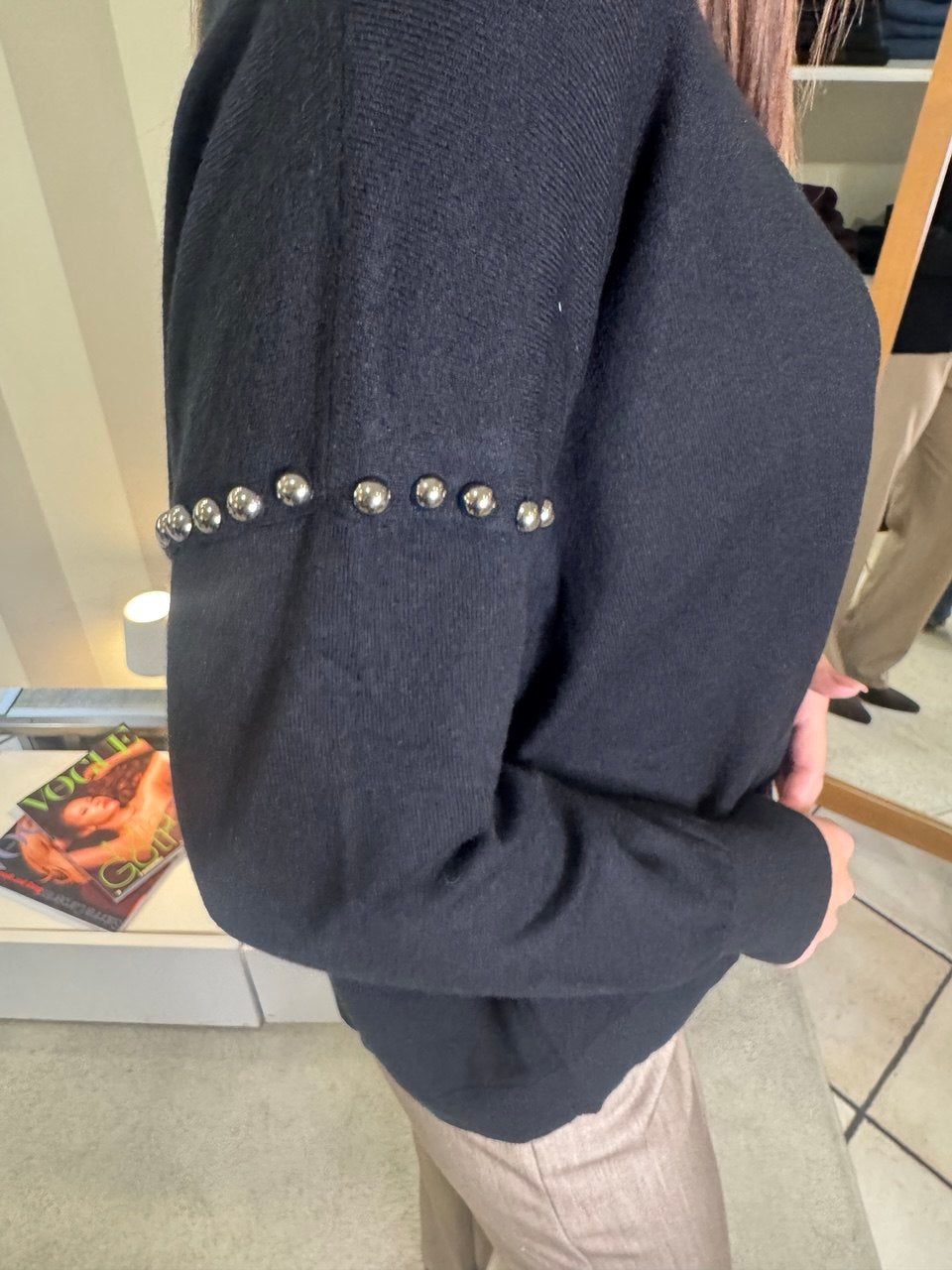 Maglia girocollo a scatoletta, con applicazioni di piccole borchiette colore brunito sul davanti e sulle maniche, polsino largo