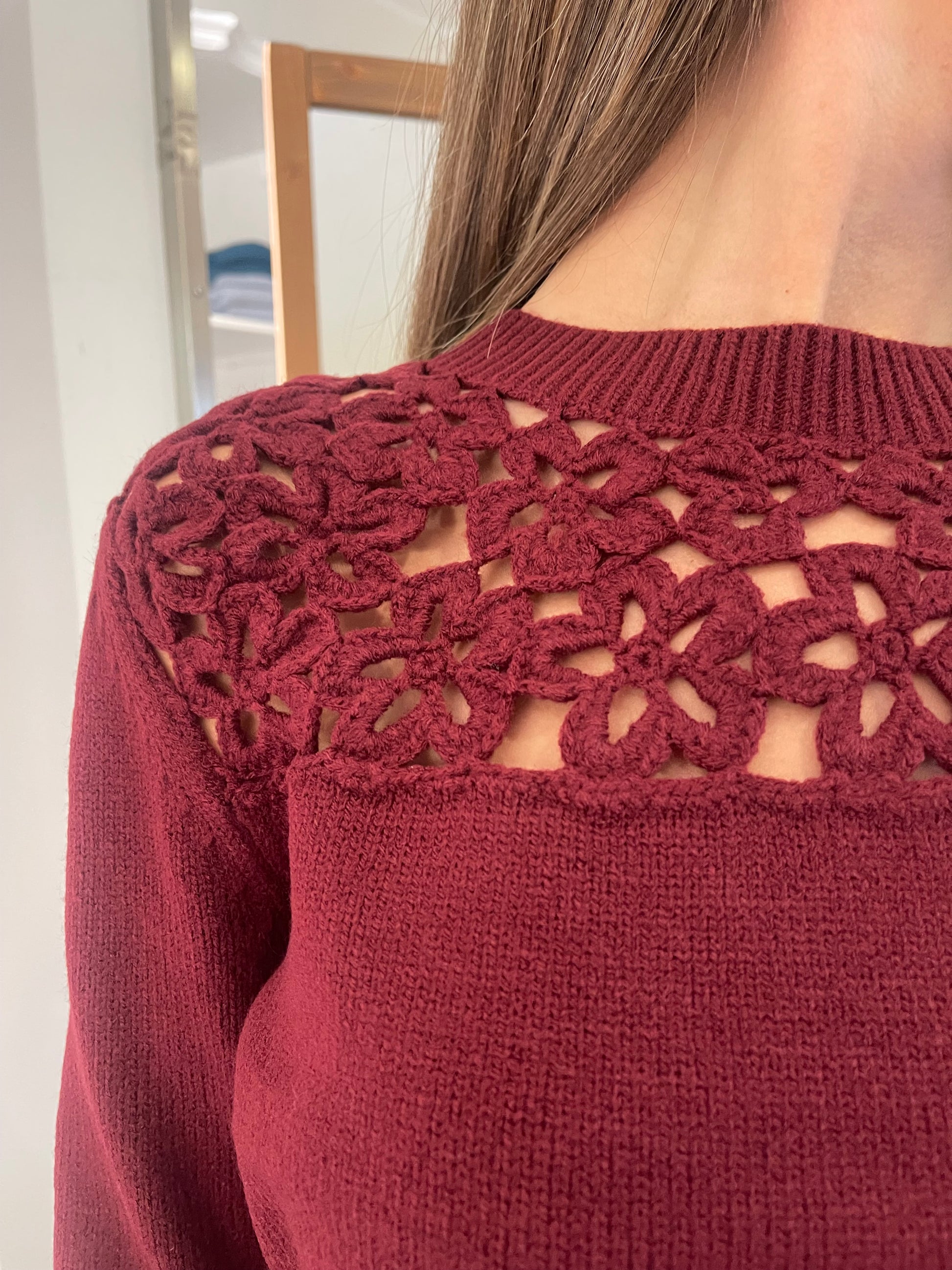 Descrizione: Maglia girocollo con ricamo motivo fiori,taglio dritto,cannolette sui polsini e sul fondo