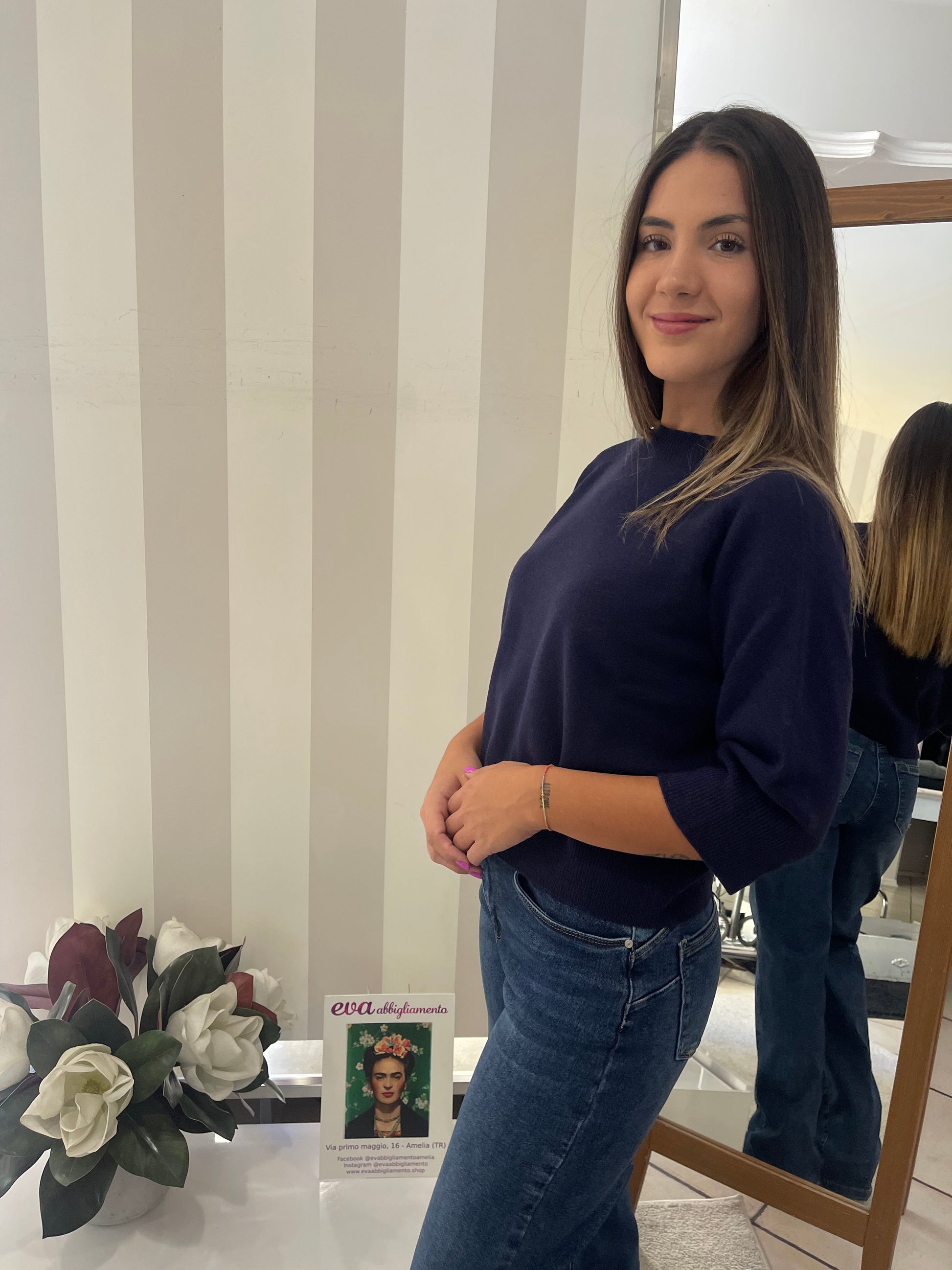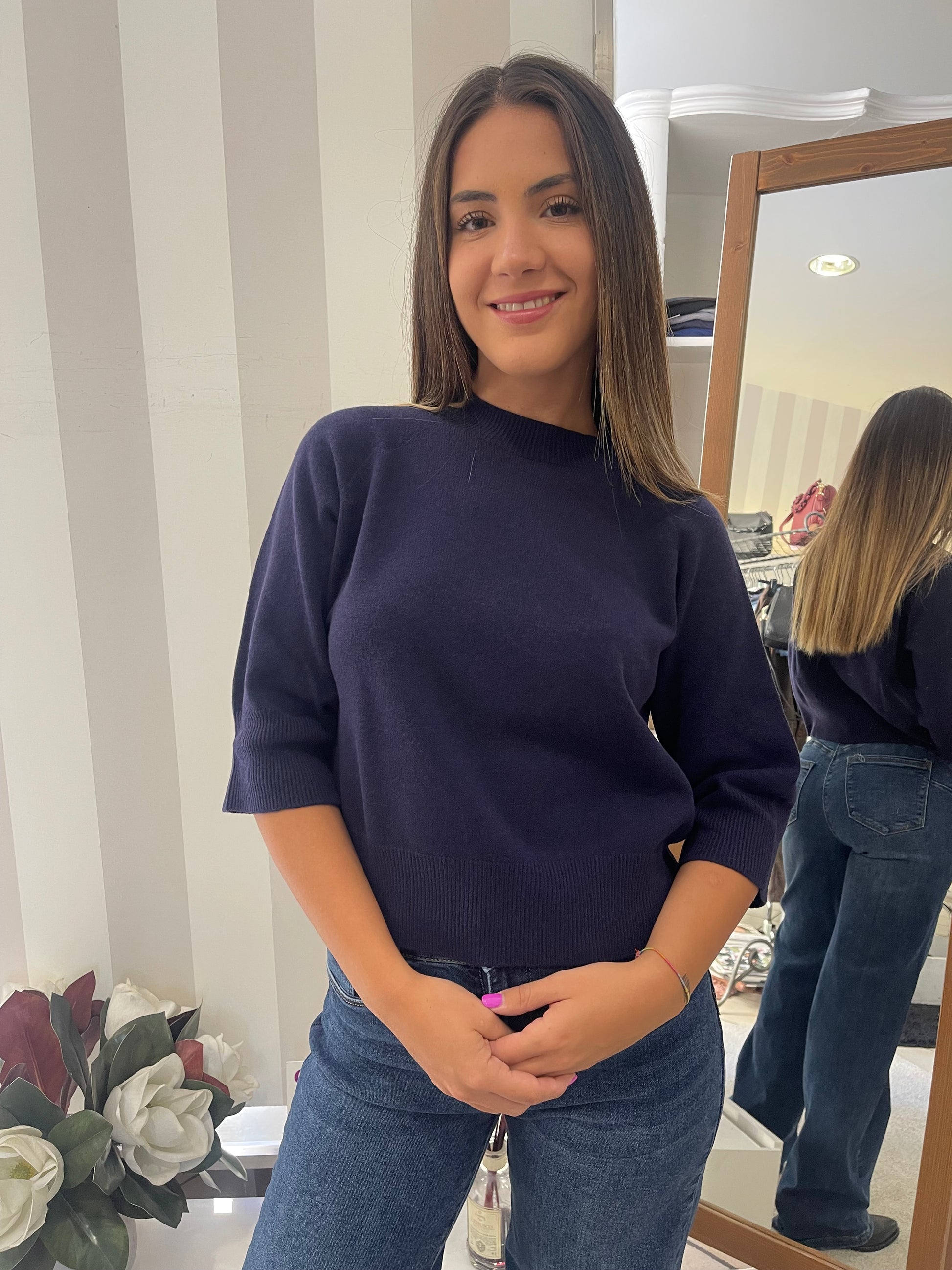 Descrizione: Maglia manica 3/4 girocollo, colore blu, in lana vergine, corto