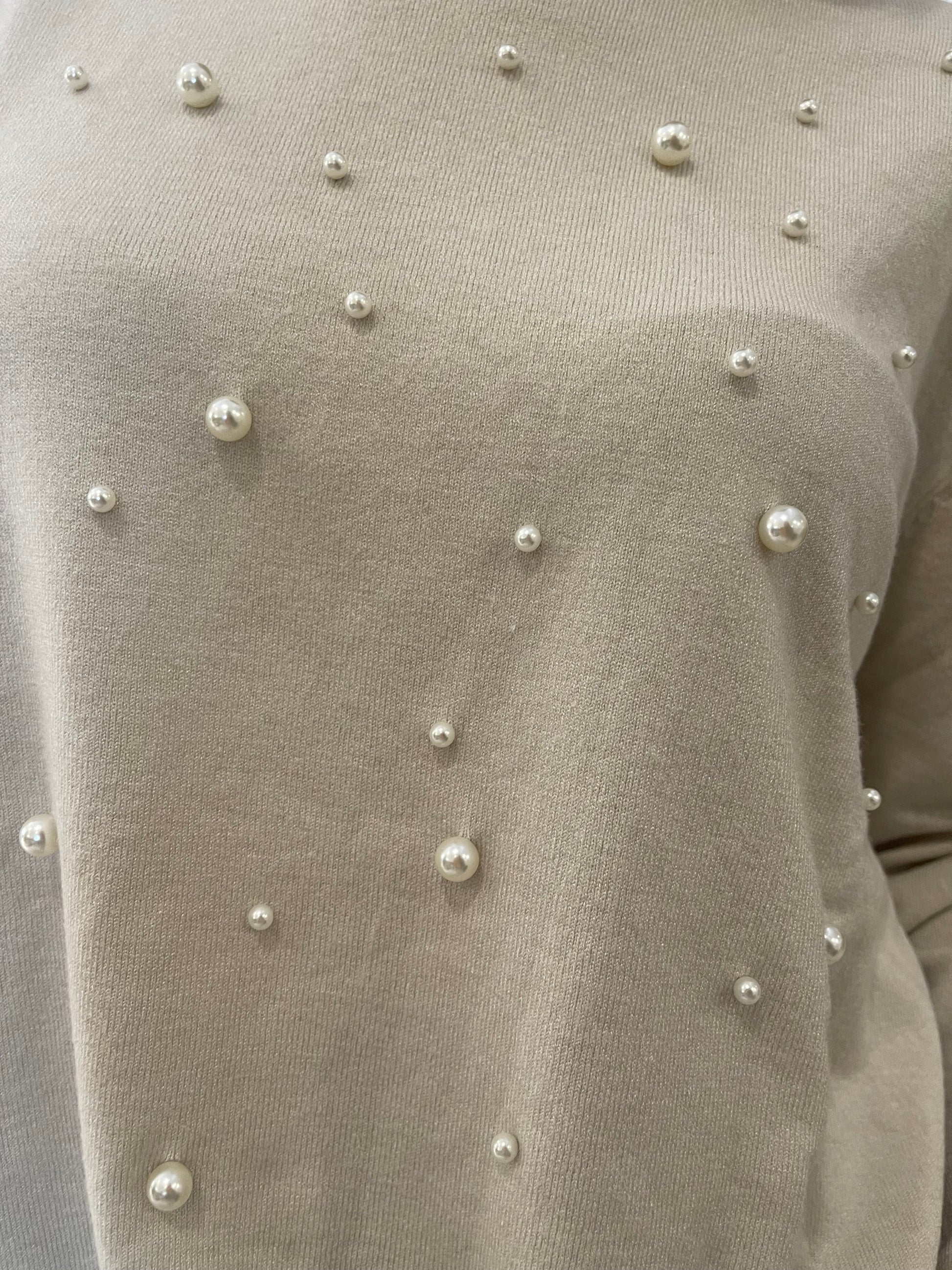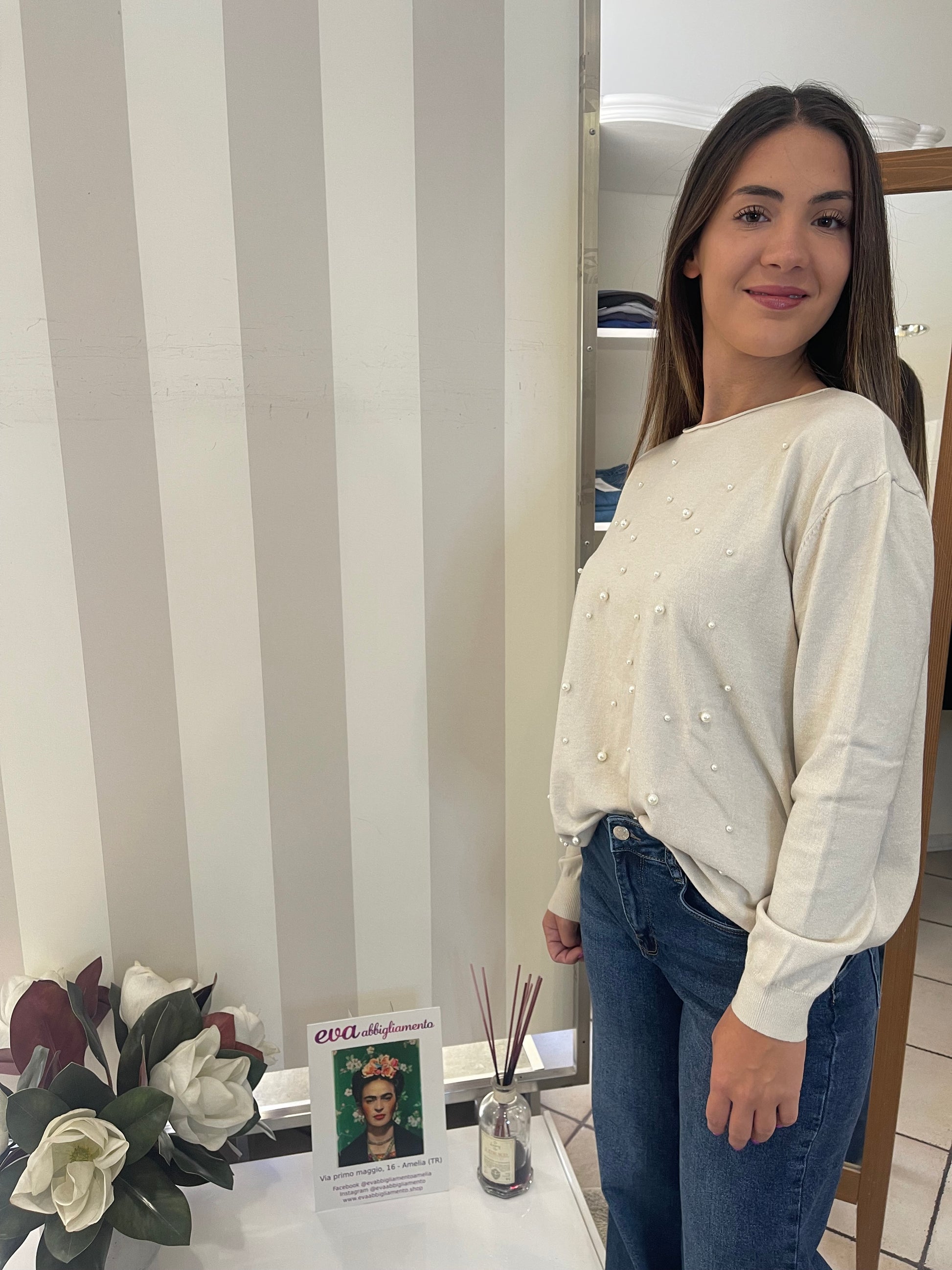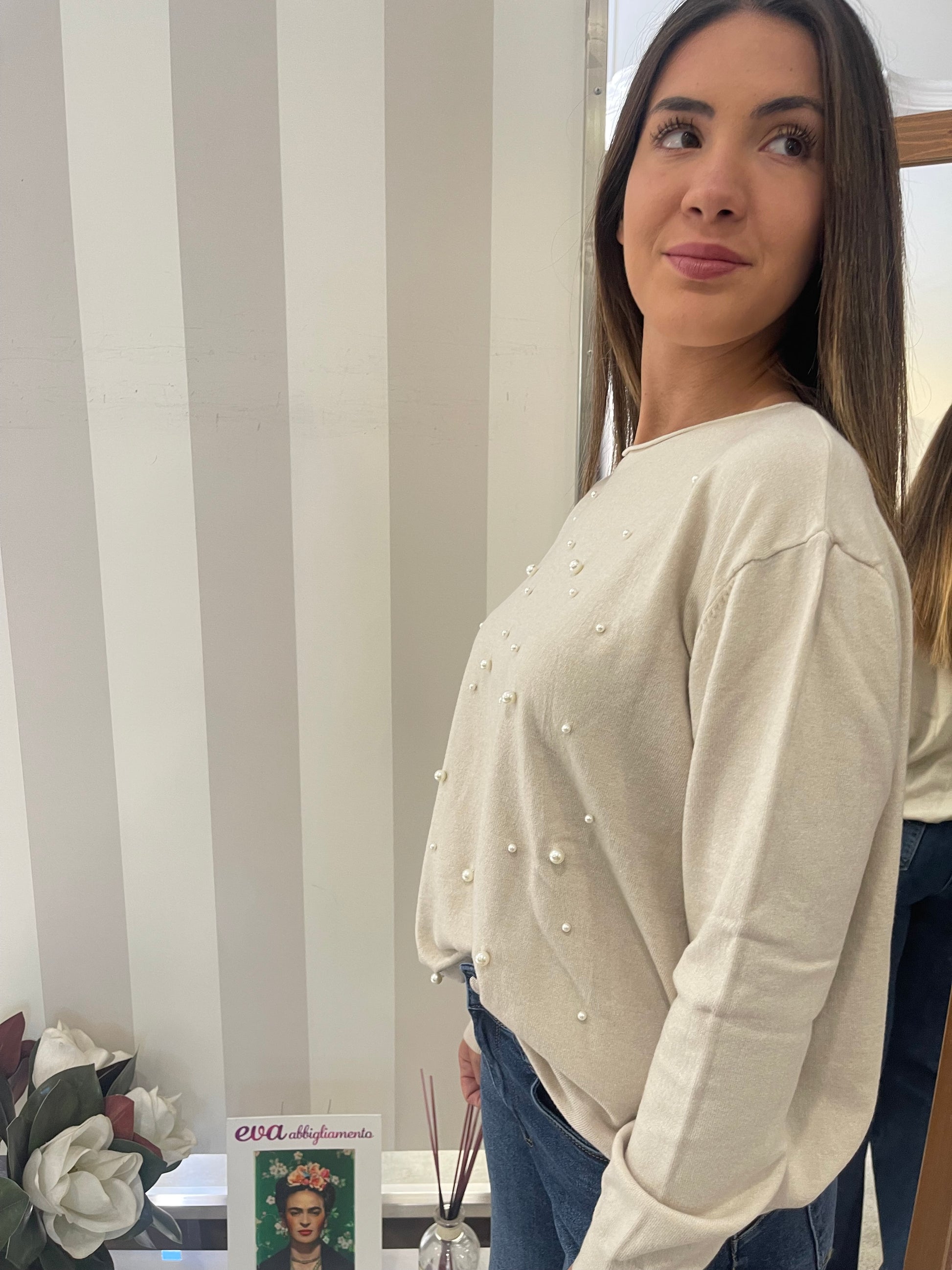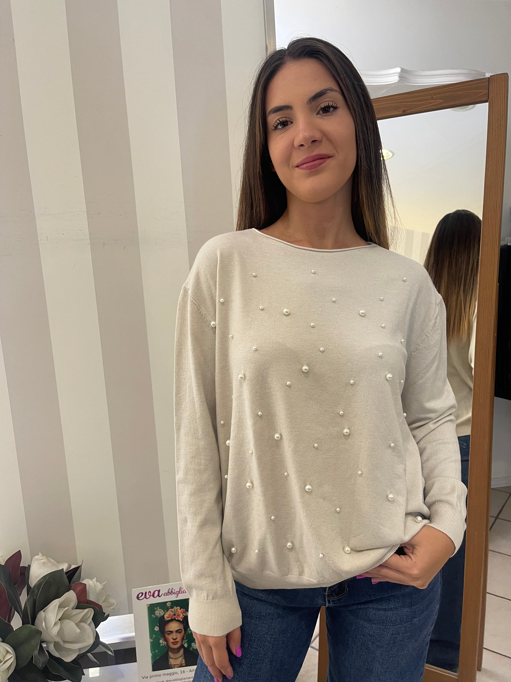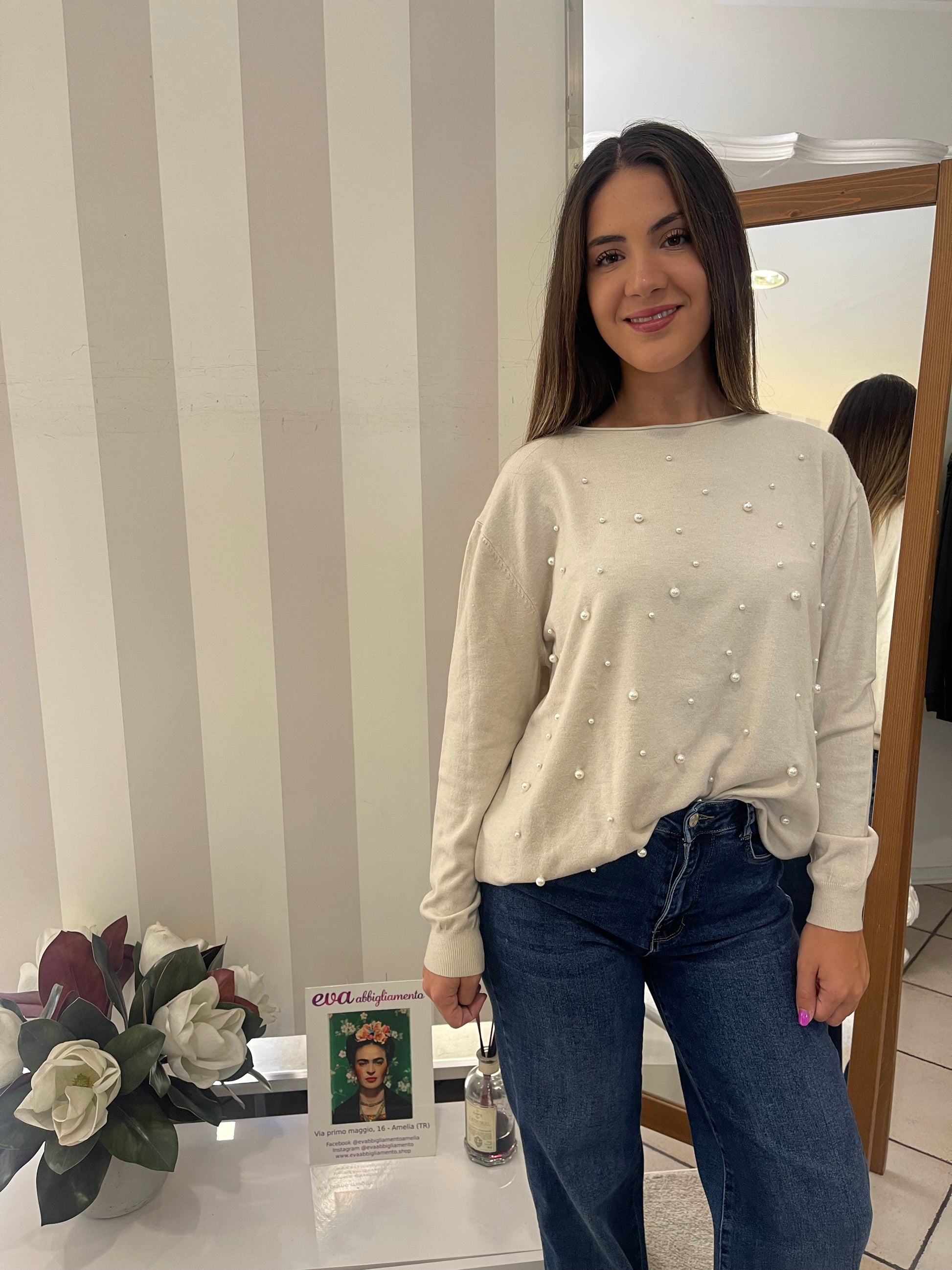 Descrizione: maglia manica lunga con perline colore bianco applicate, scollo giro largo, spalla scesa,taglio ampio.