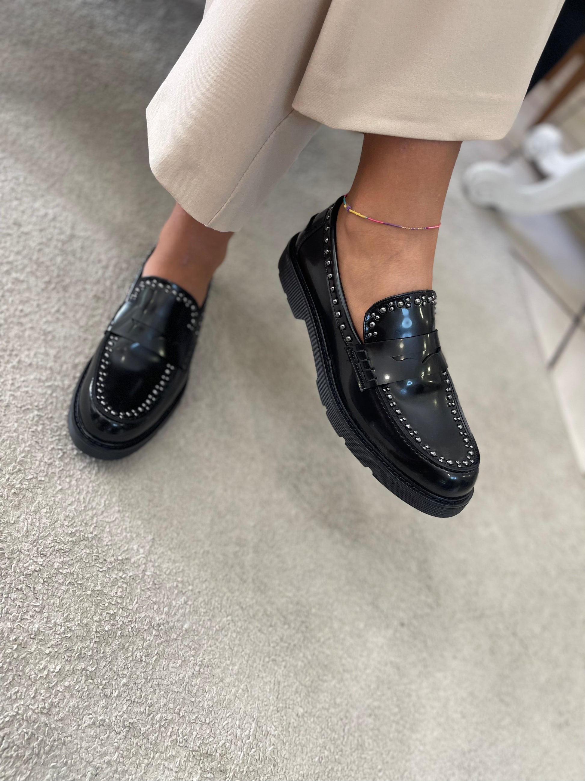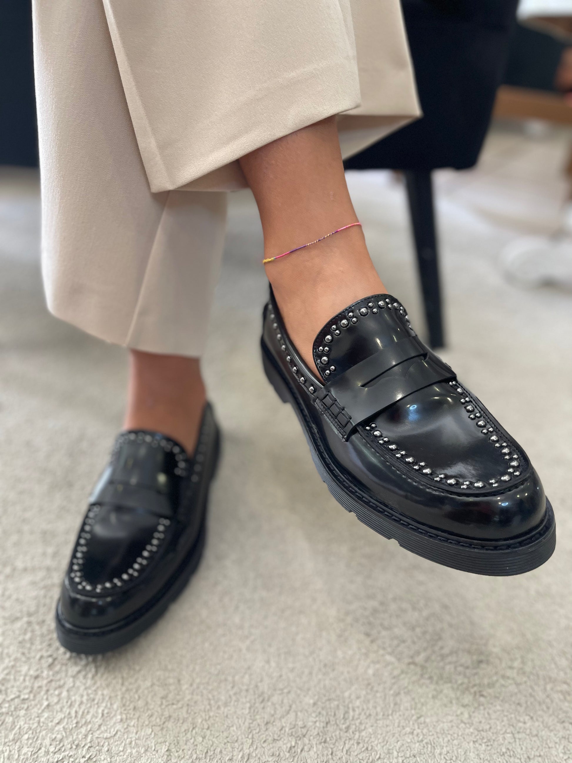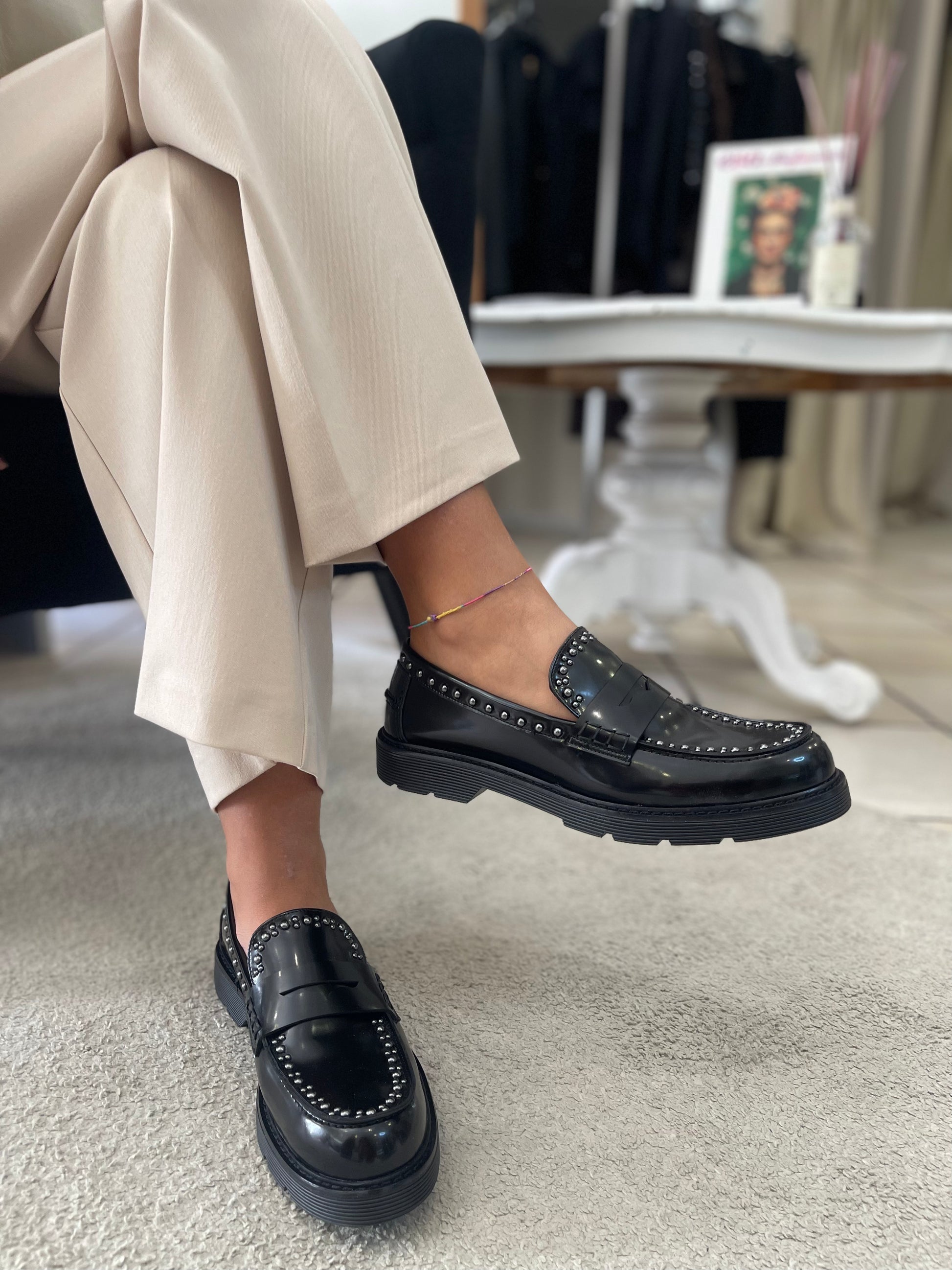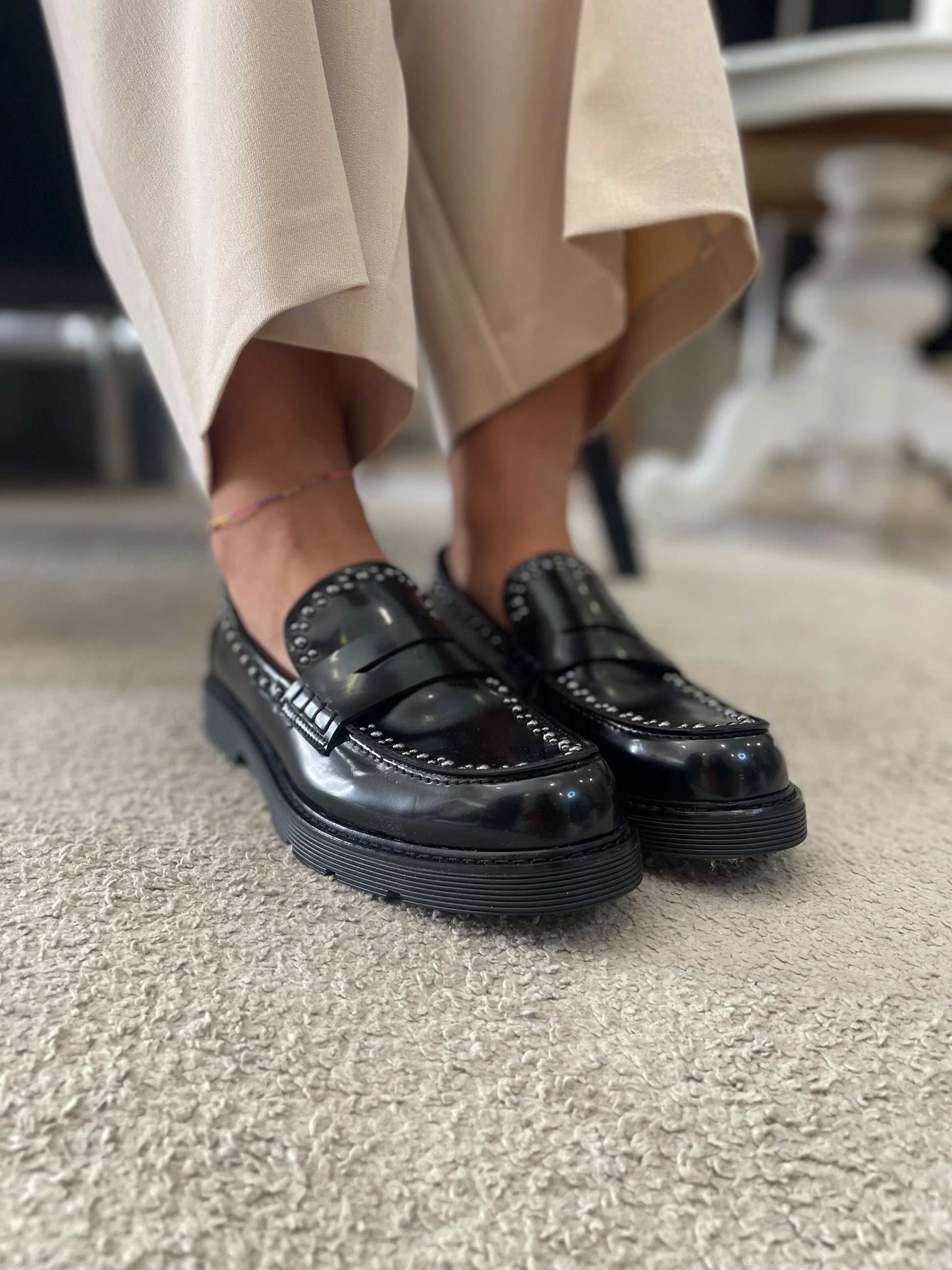 Descrizione: Mocassino in pelle con piccoli dettagli colore acciaio. Made in Italy