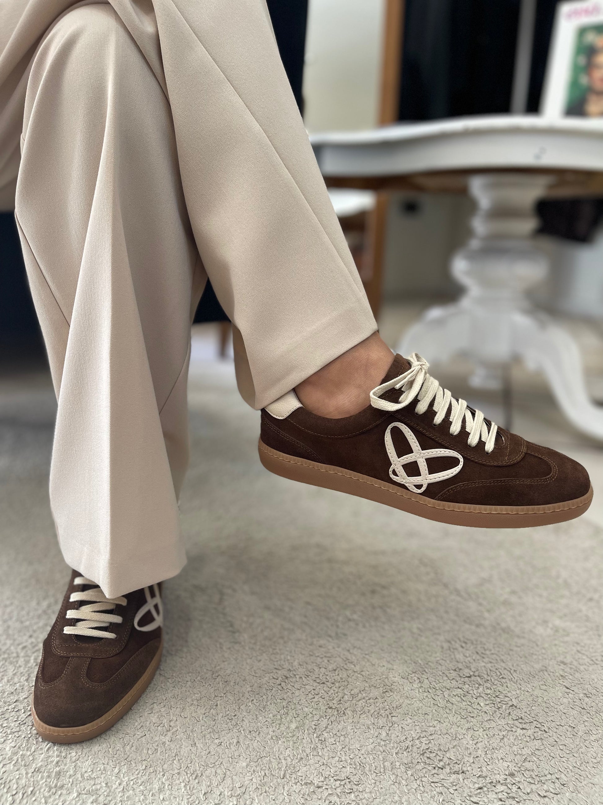 Descrizione: Sneakers in crosta alpaca, dettaglio dorato sui lati esterni e copri tallone pelle colore burro. Fondo piatto in gomma colore beige. Made in Italy.