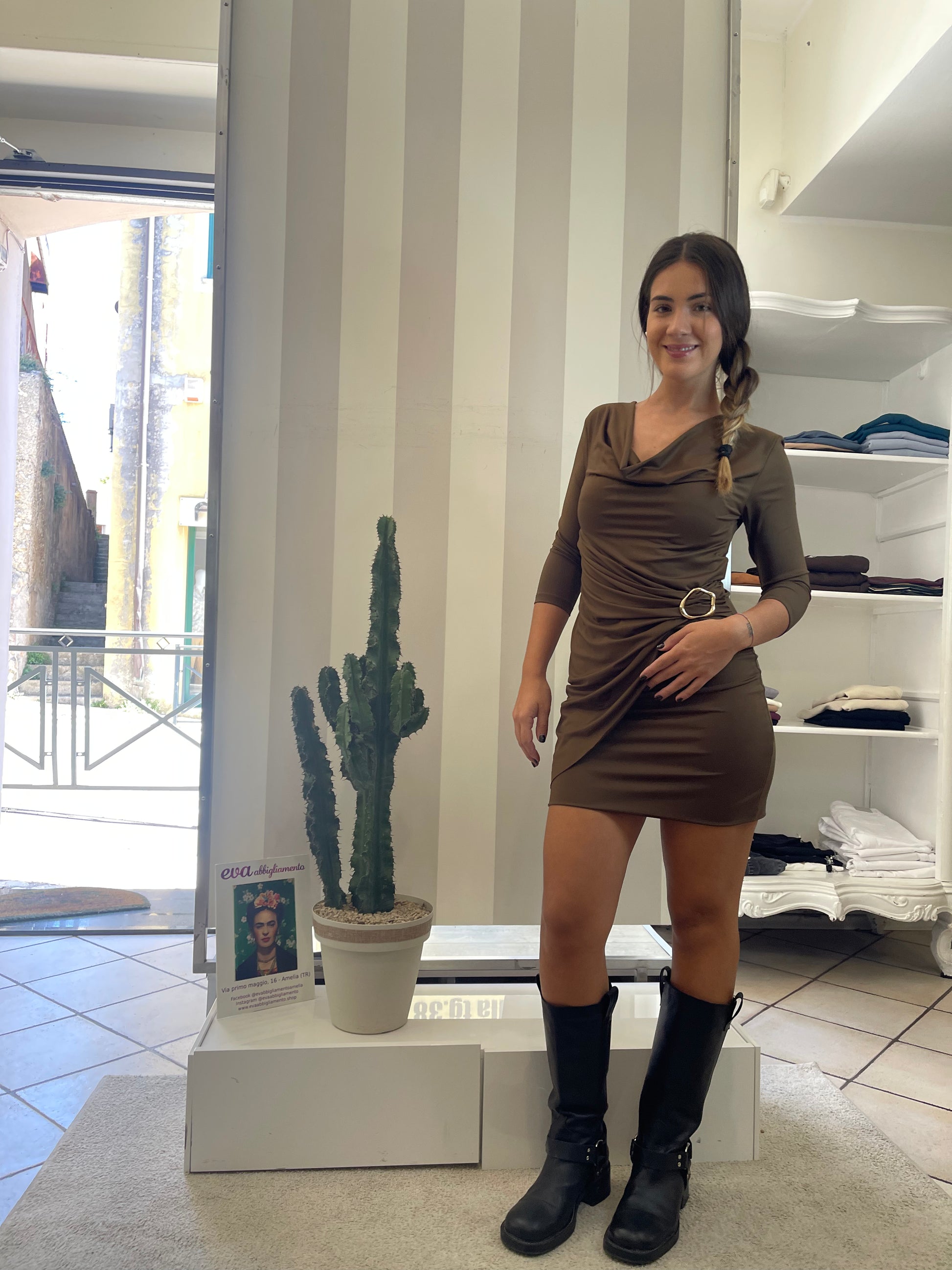 Descrizione: Abito corto con drappeggio frontale e accessorio in vitaminica 3/4, colore marrone moro.