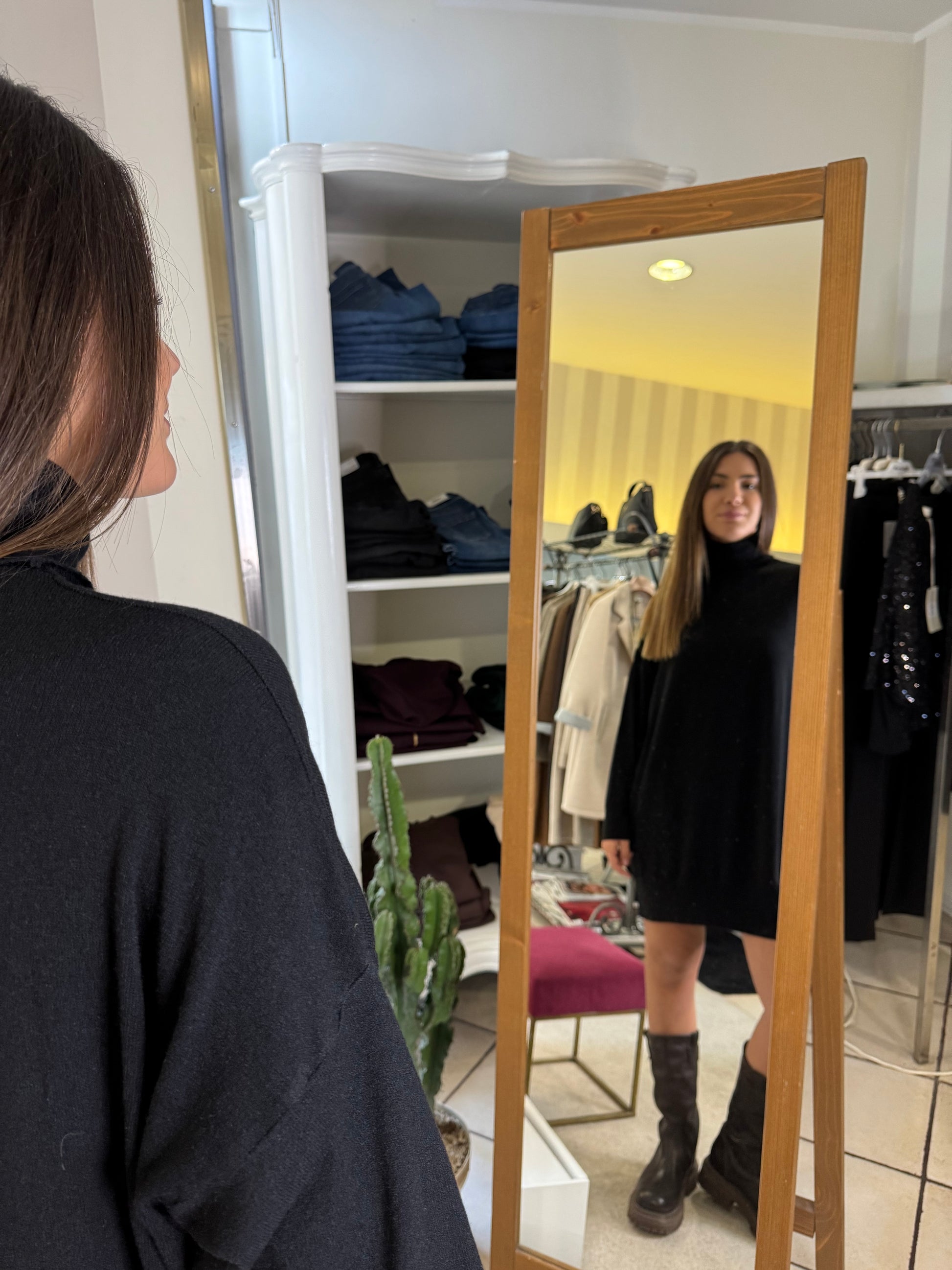 Descrizione: Abito in maglia, collo alto, morbido e caldo, lunghezza dalla spalla 85 cm; puo essere indossato come abito o come maxi maglia
