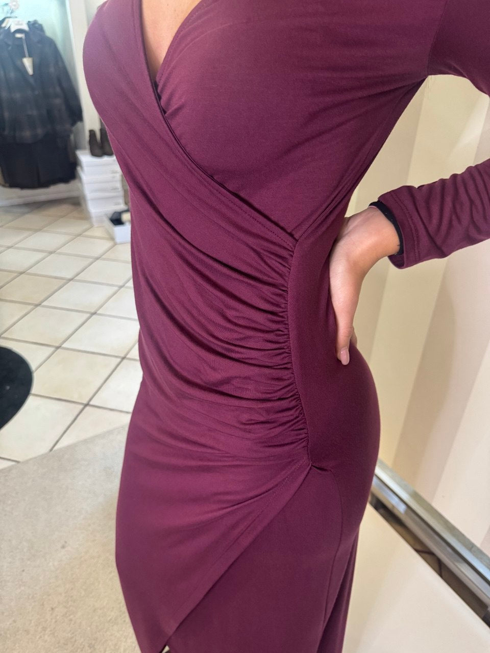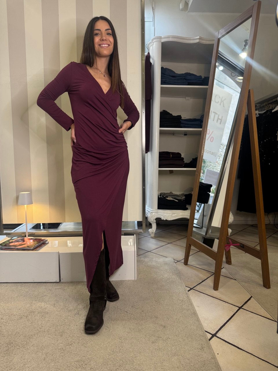 Descrizione: Abito lungo con drappeggio sul davanti, scollo a V profondo
