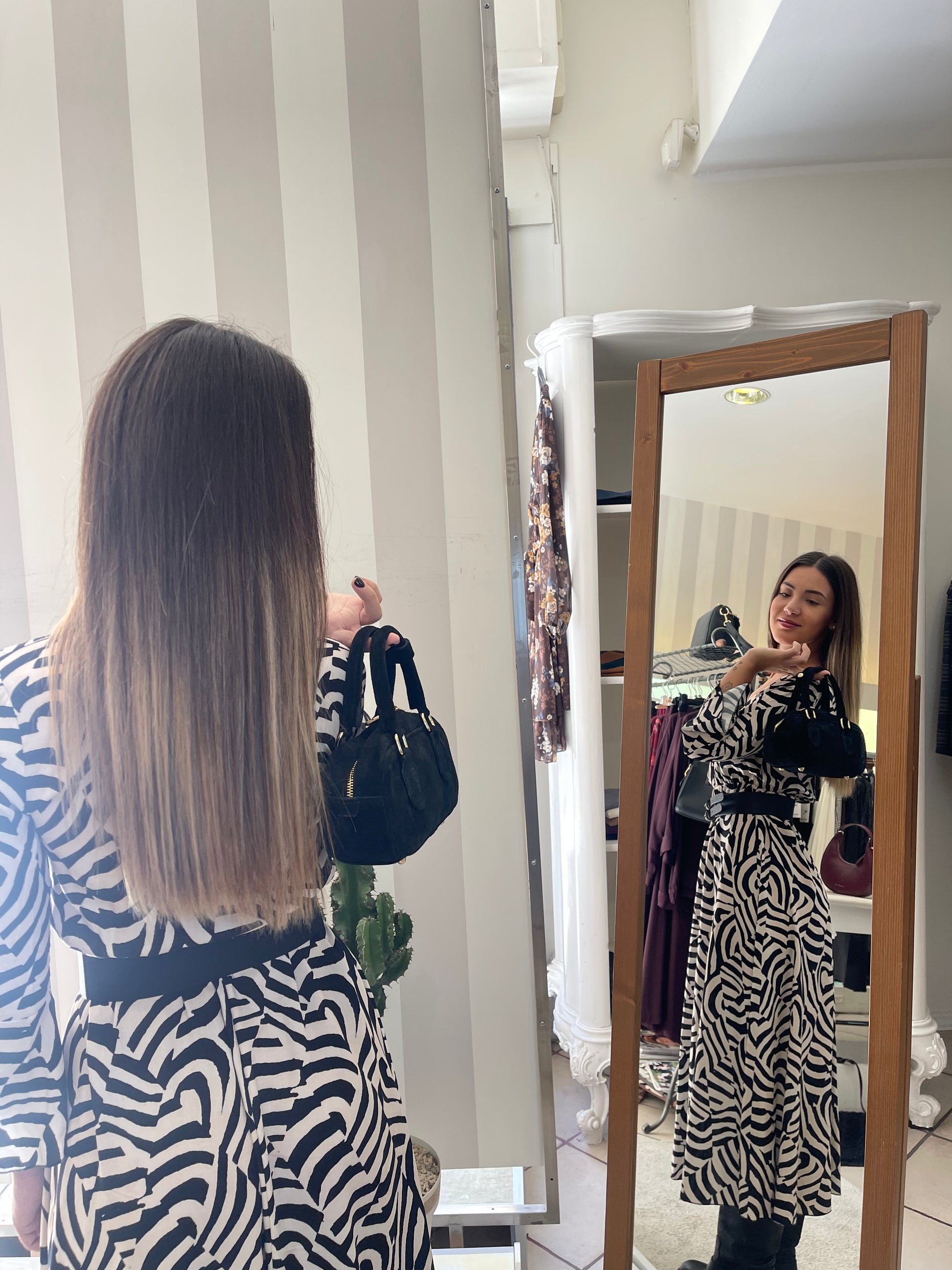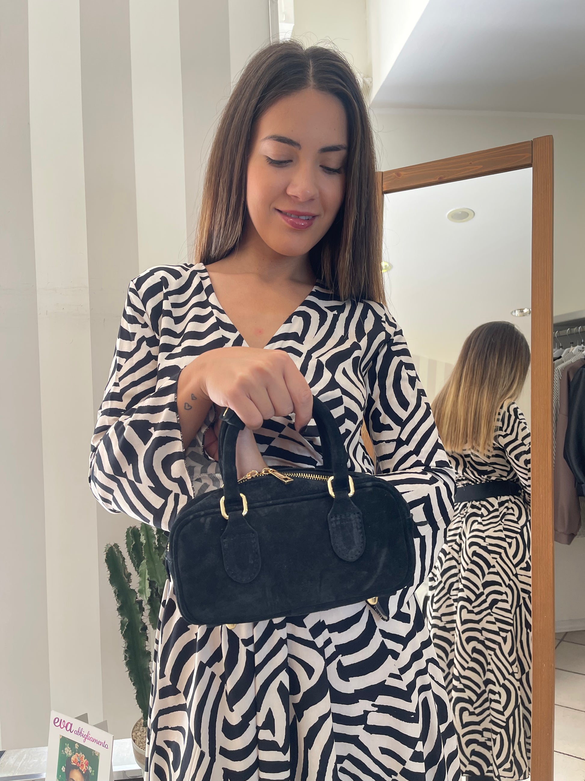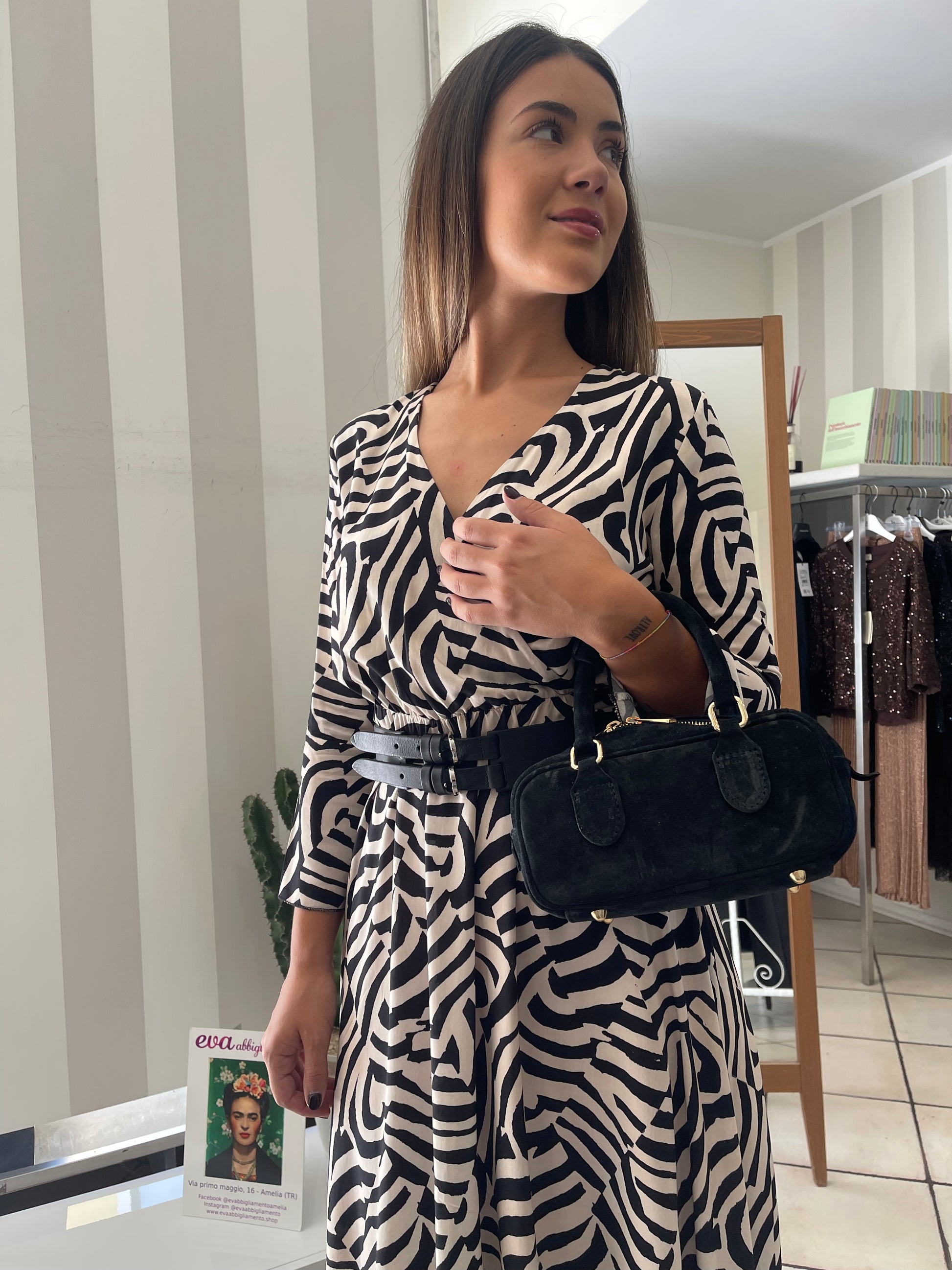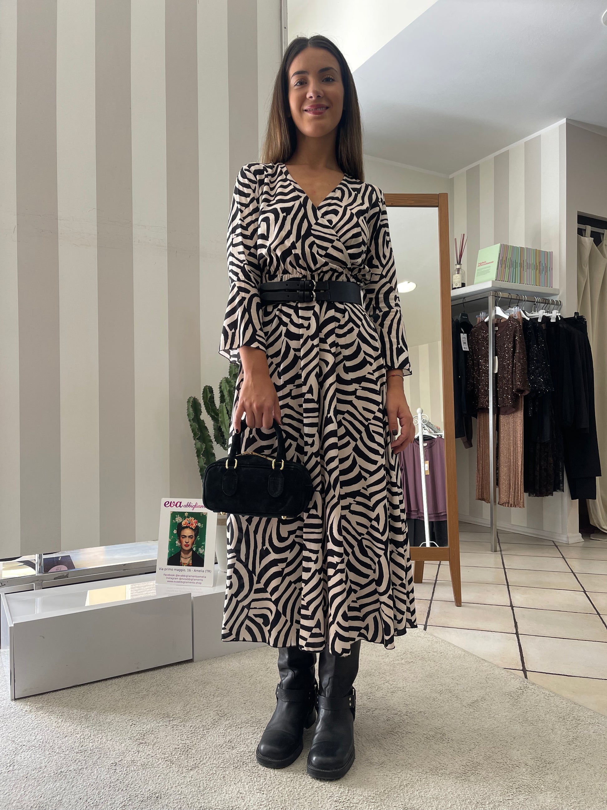 Descrizione: Abito lungo a fantasia, con manica 3/4, gonna ampia e cintura in vita.