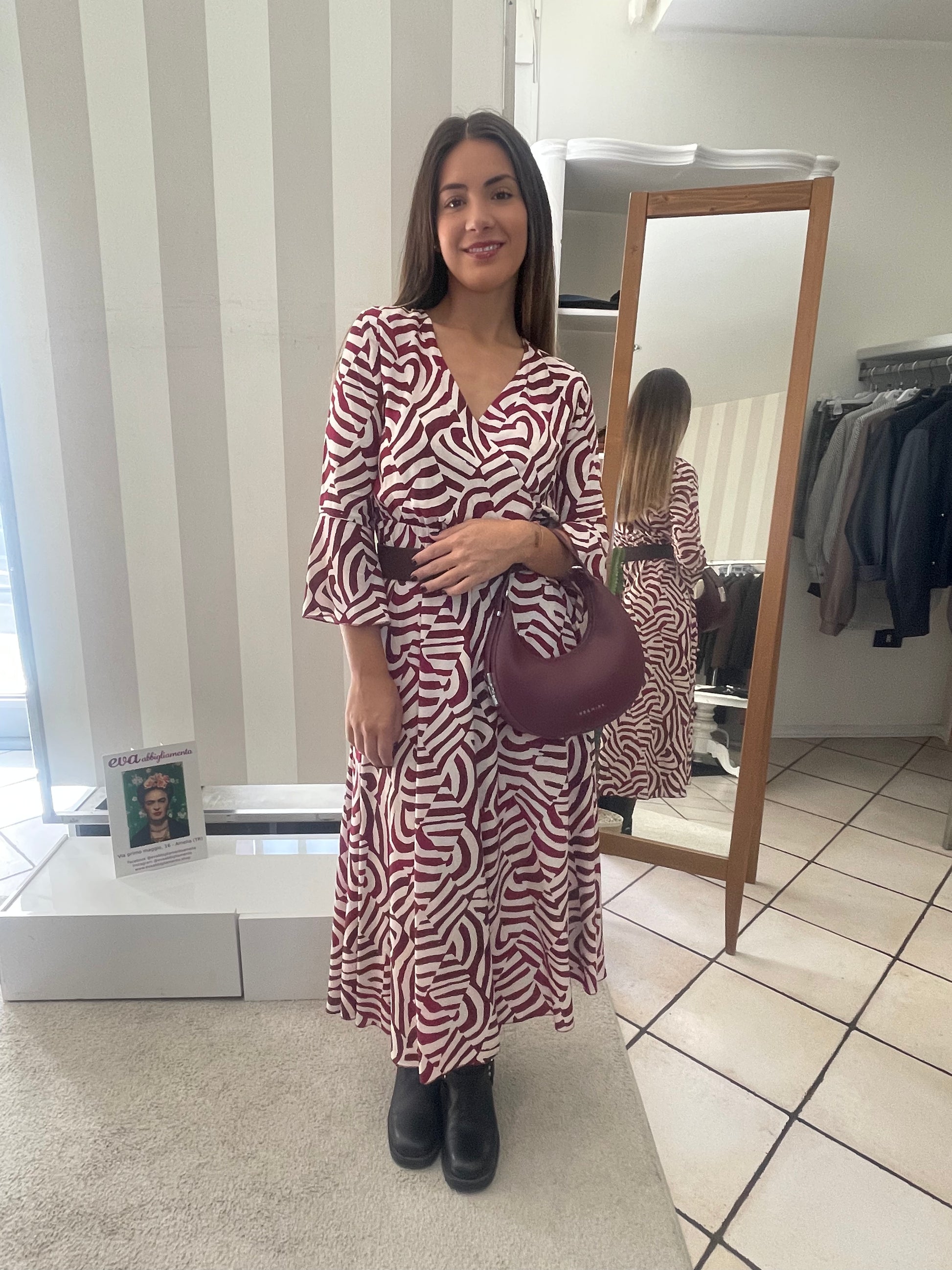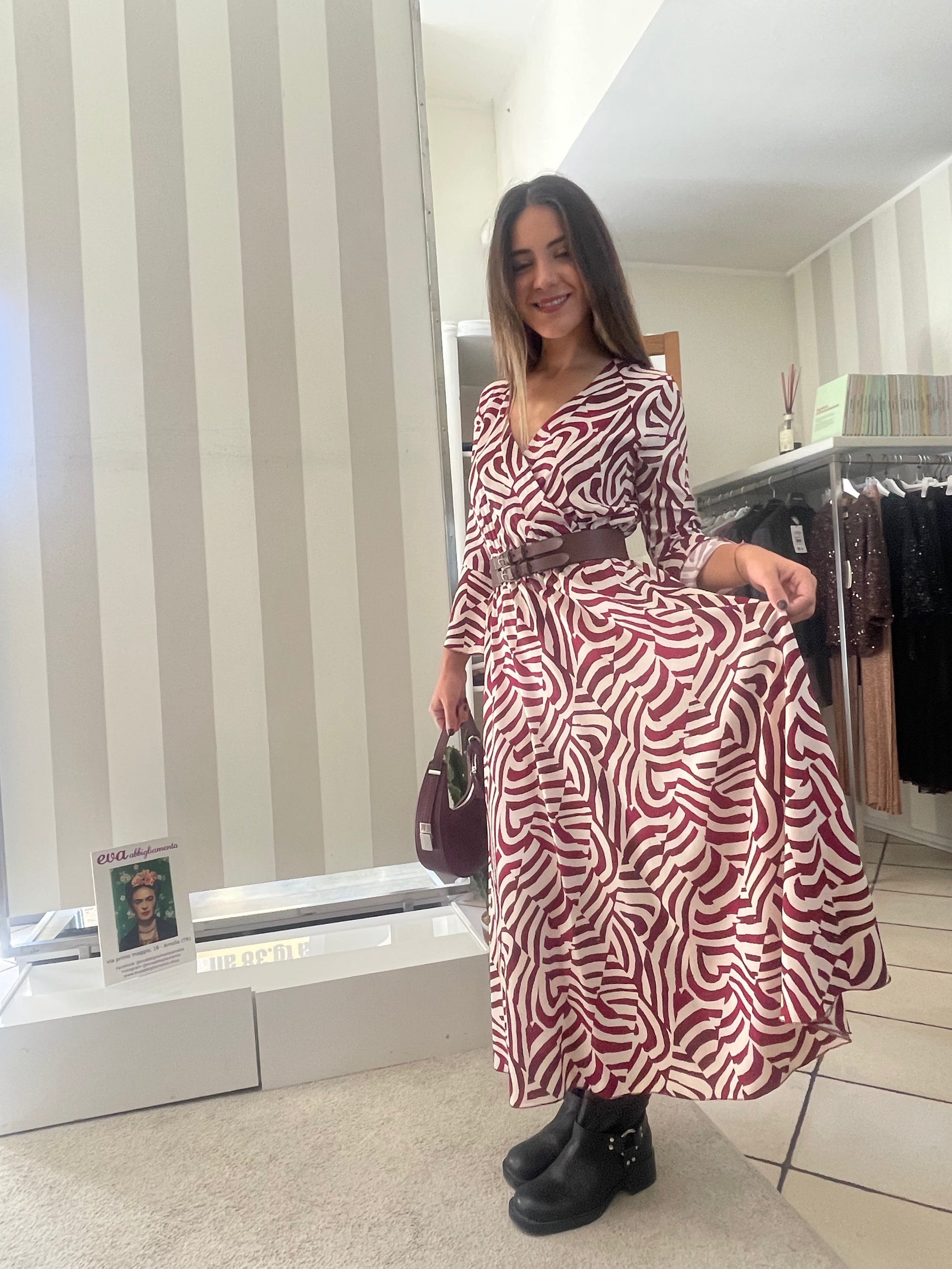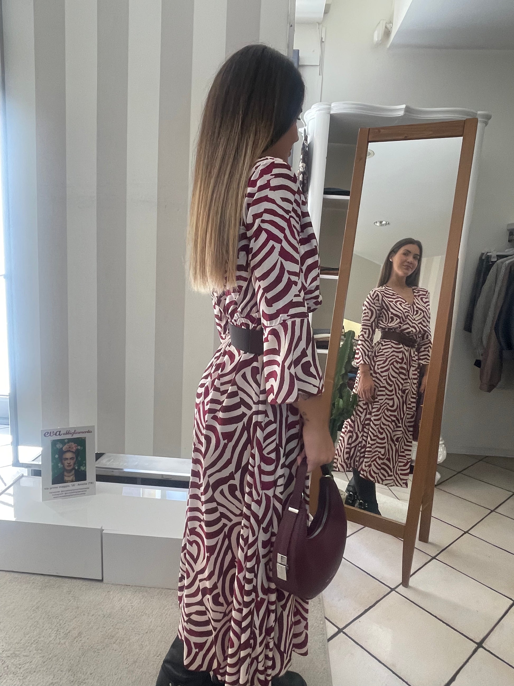 Descrizione: Abito lungo a fantasia, con manica 3/4, gonna ampia e cintura in vita.