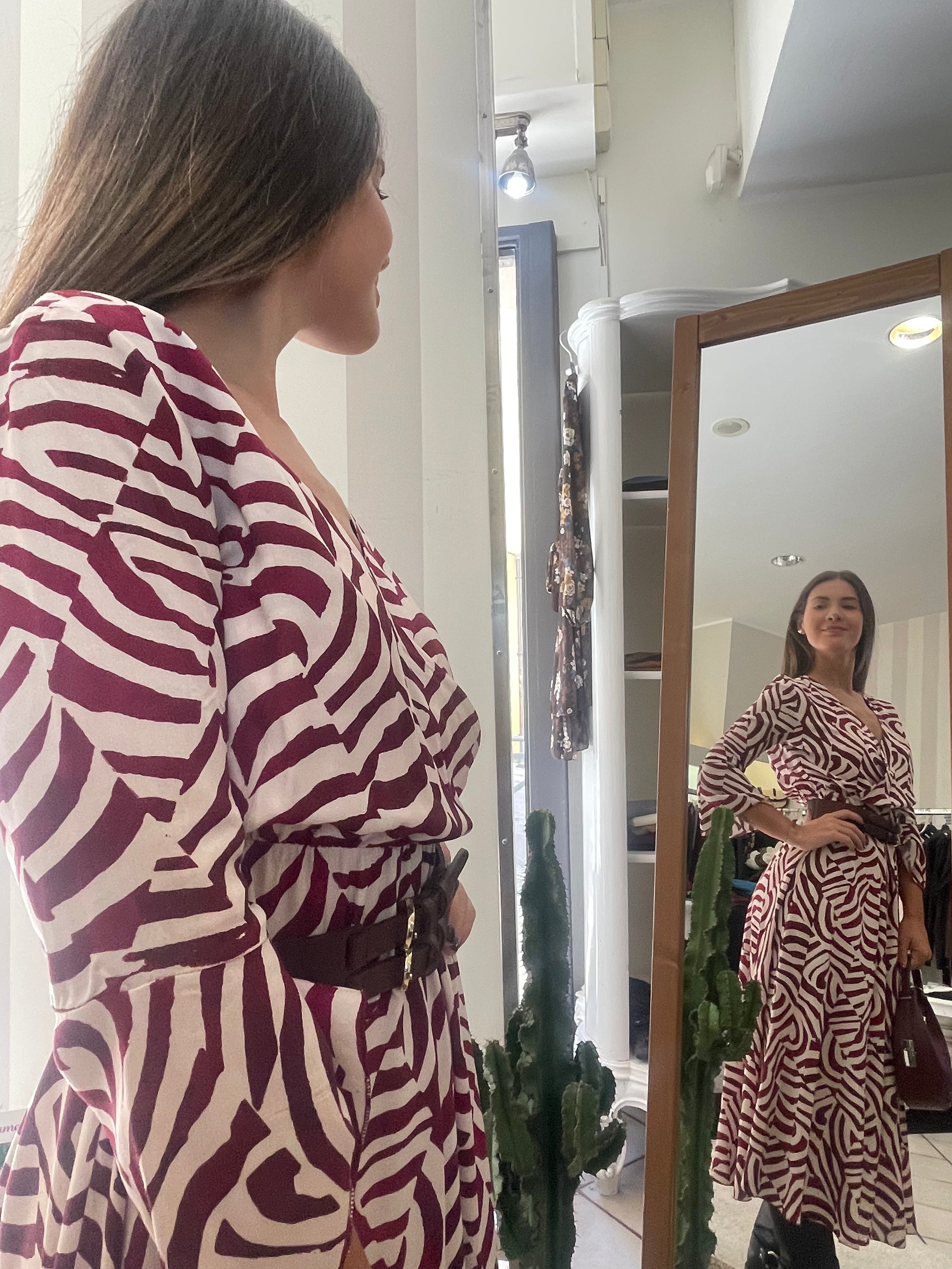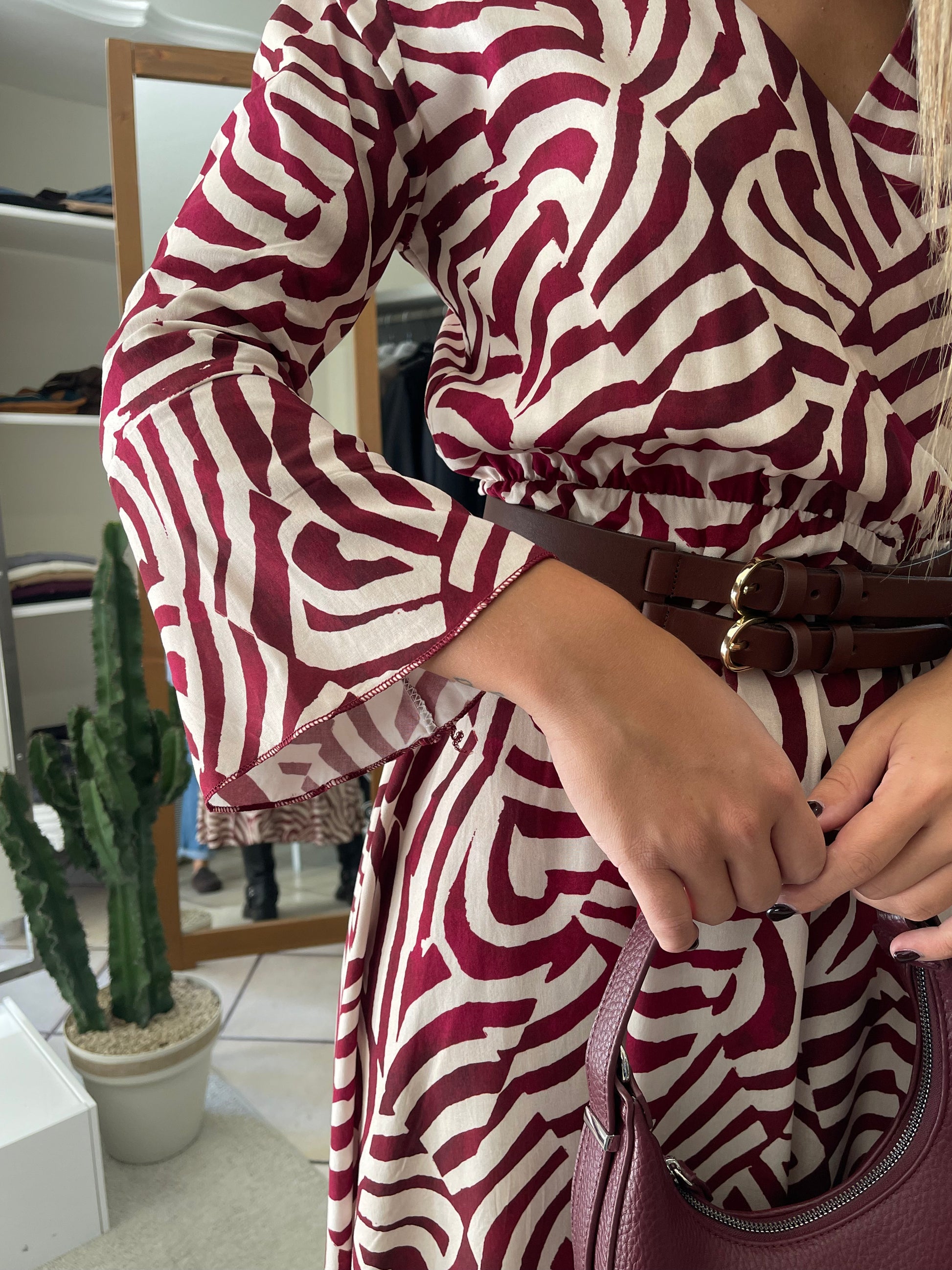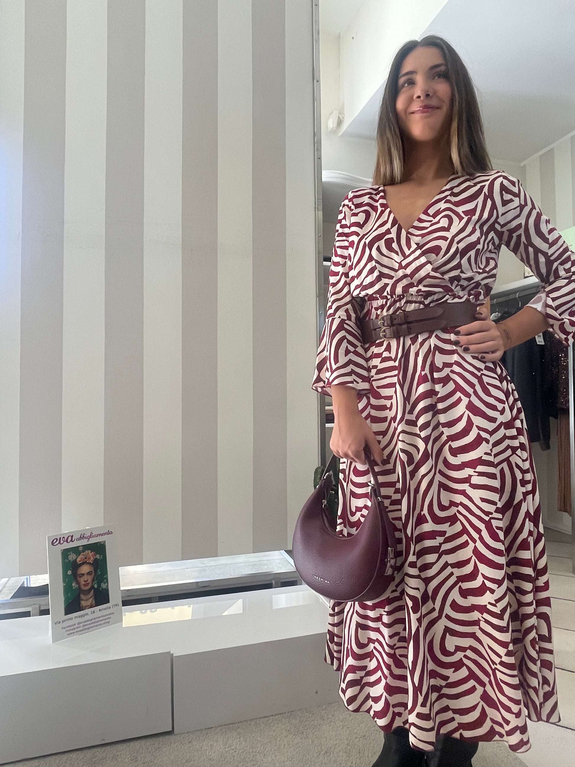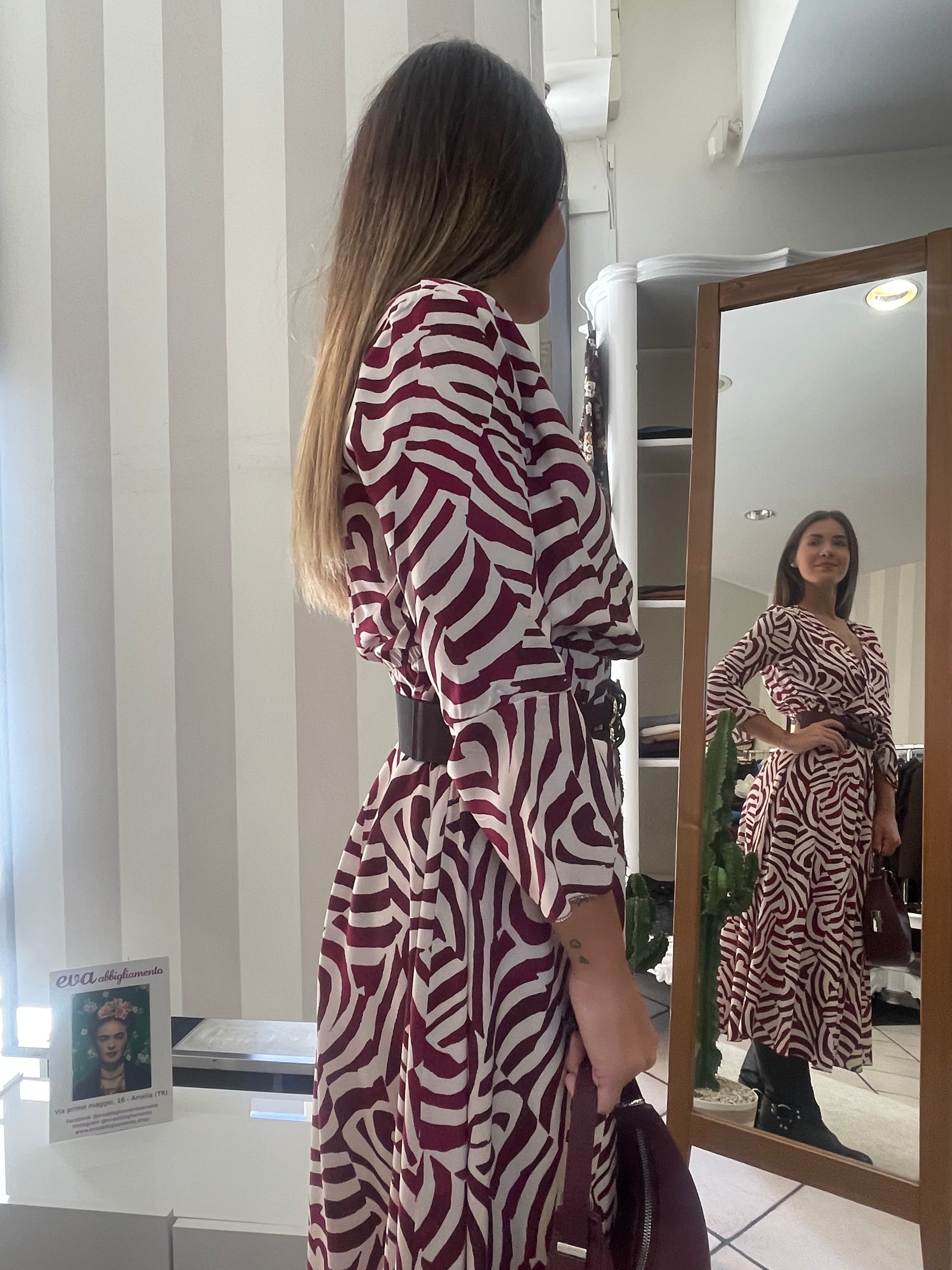 Descrizione: Abito lungo a fantasia, con manica 3/4, gonna ampia e cintura in vita.