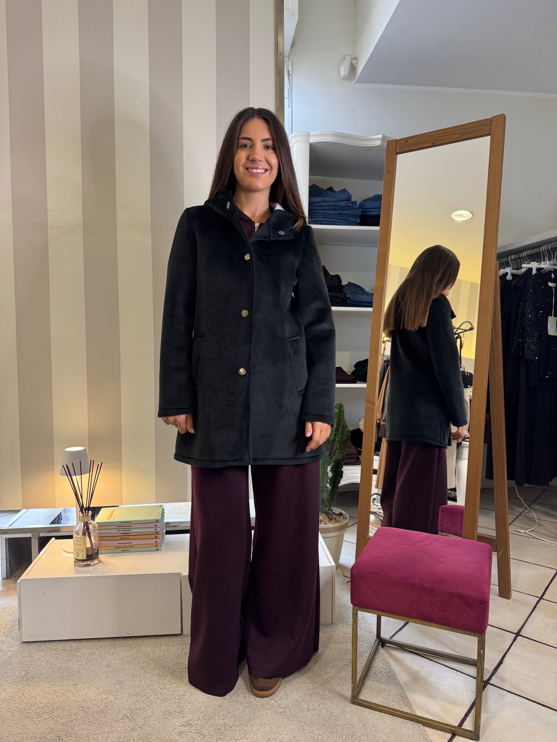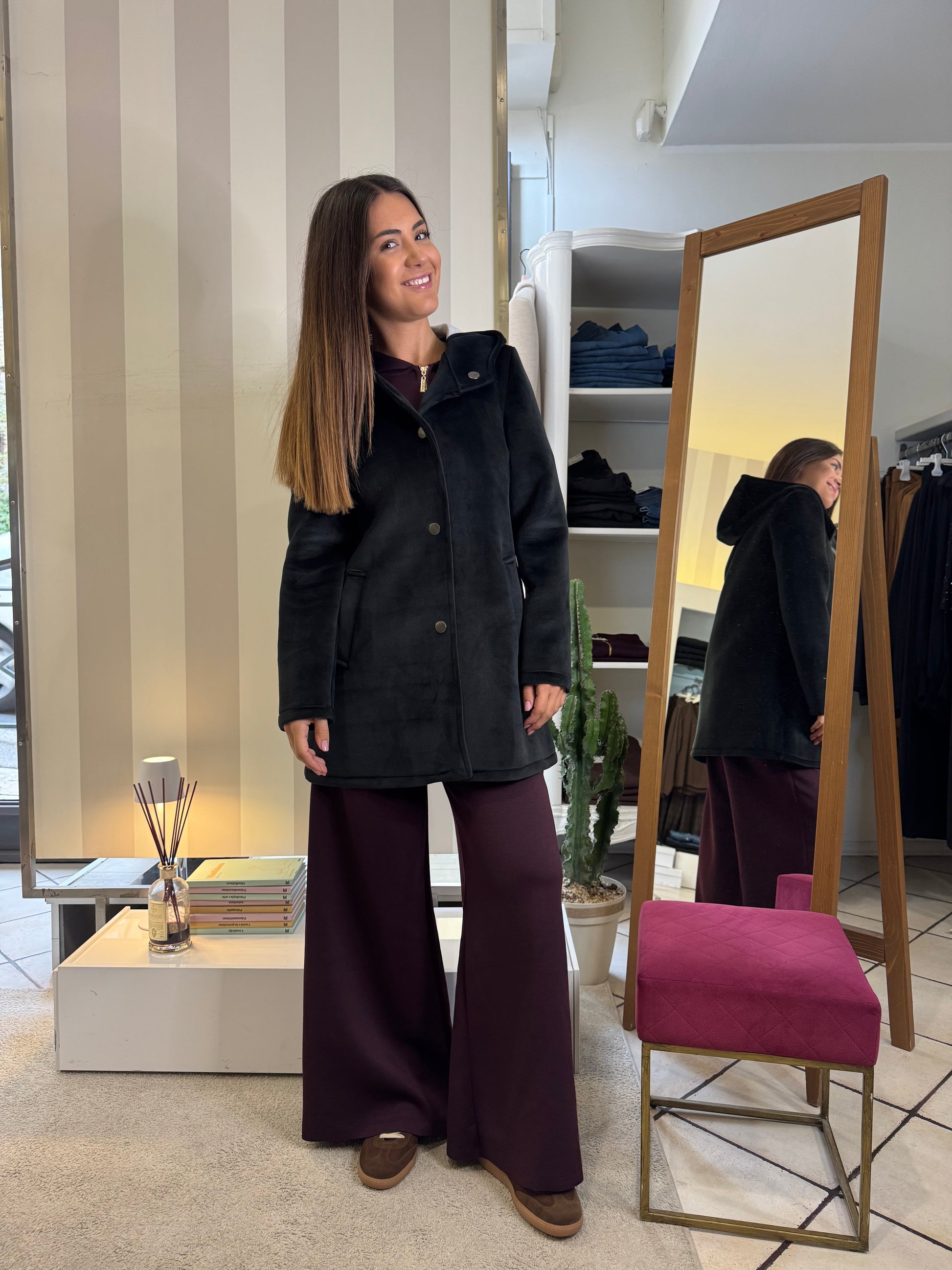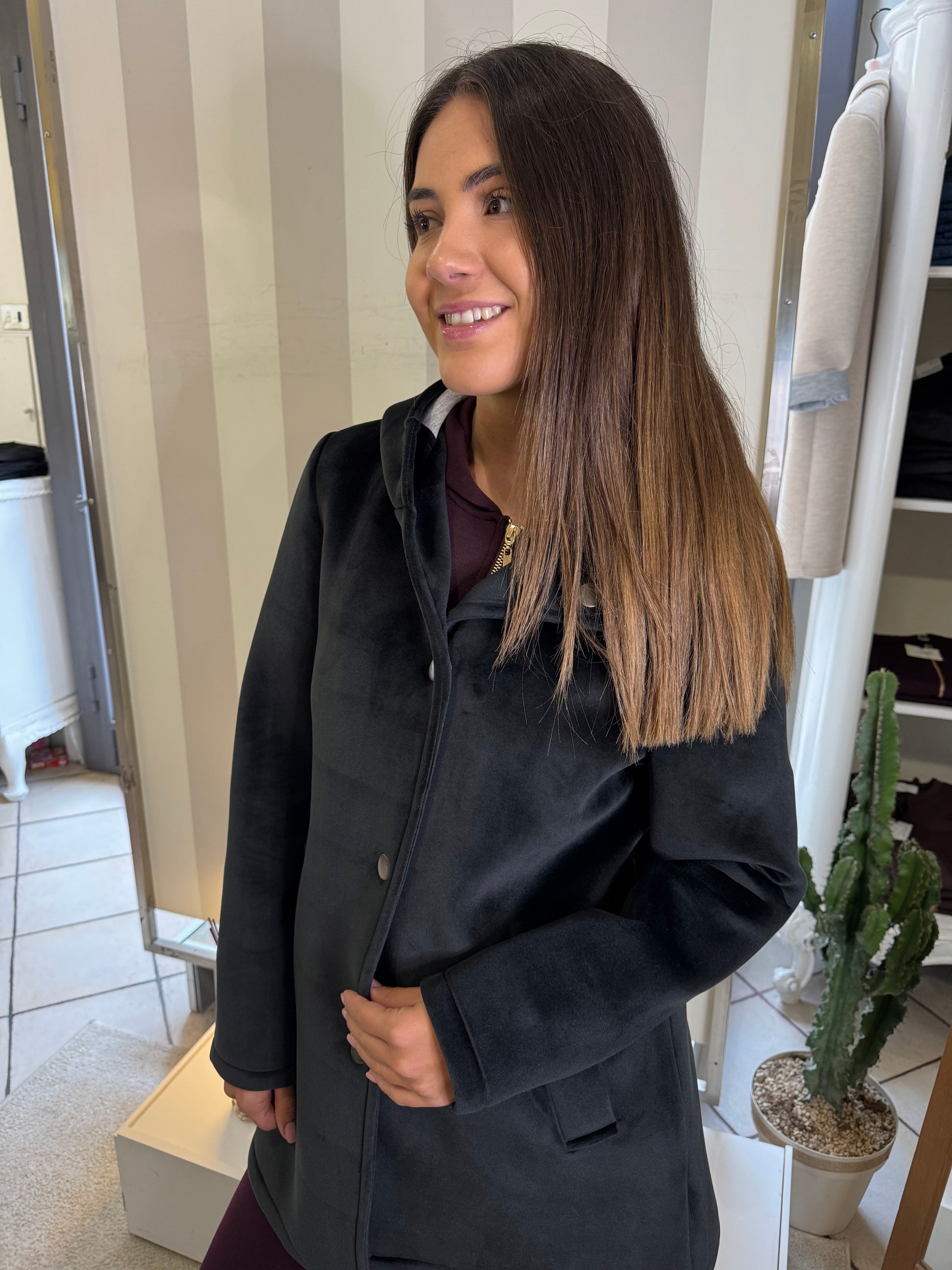 Descrizione: Cappottino in velluto liscio, chiusura con 4 bottoni automatici, cappuccio e tasche.