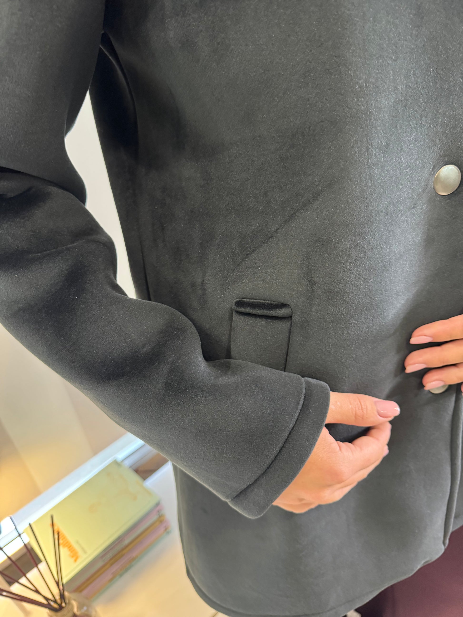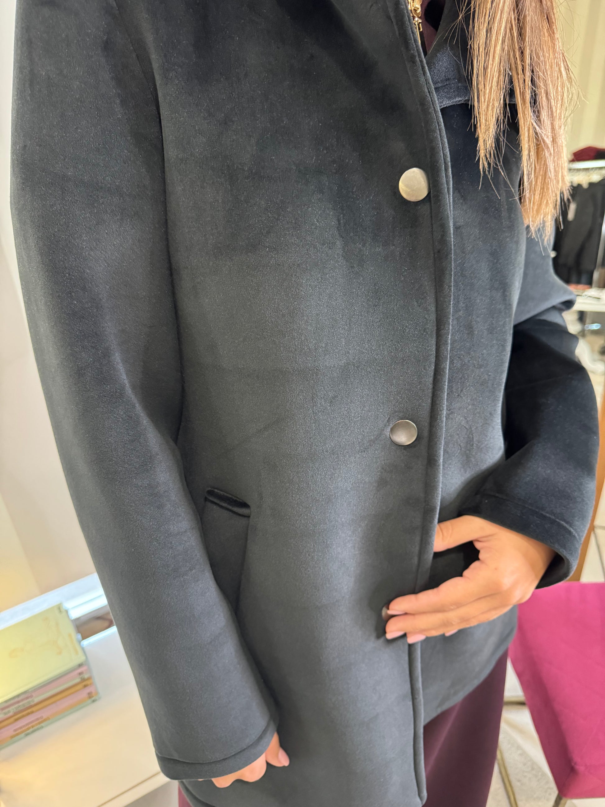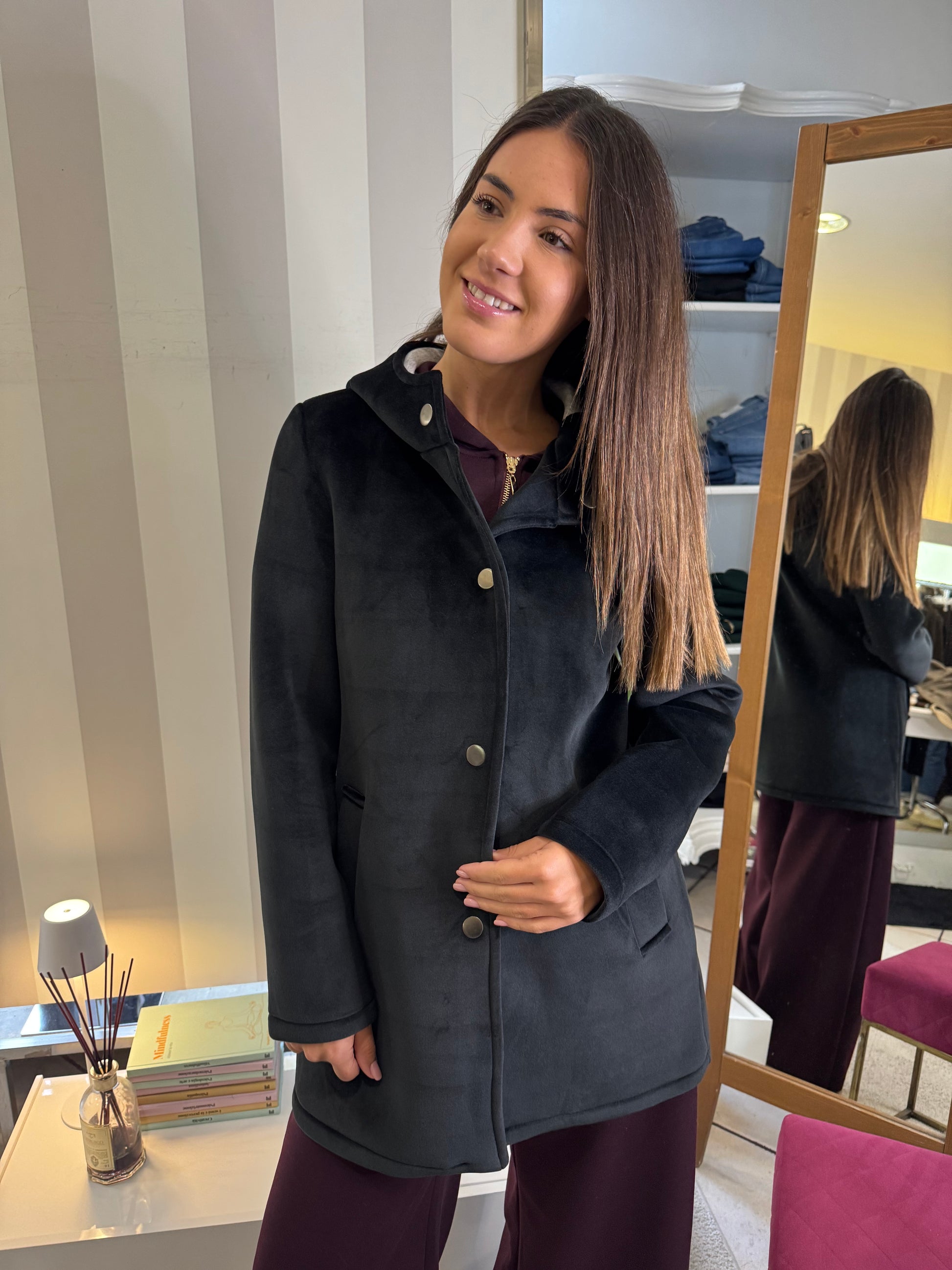 Descrizione: Cappottino in velluto liscio, chiusura con 4 bottoni automatici, cappuccio e tasche.
