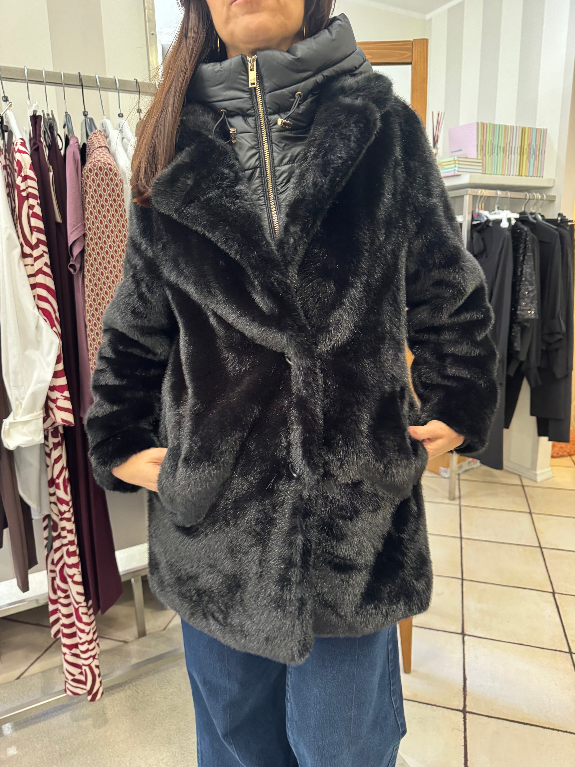 Descrizione: cappottino in ecopelliccia con cappuccio rimovibile, chiusura due bottoni e zip.