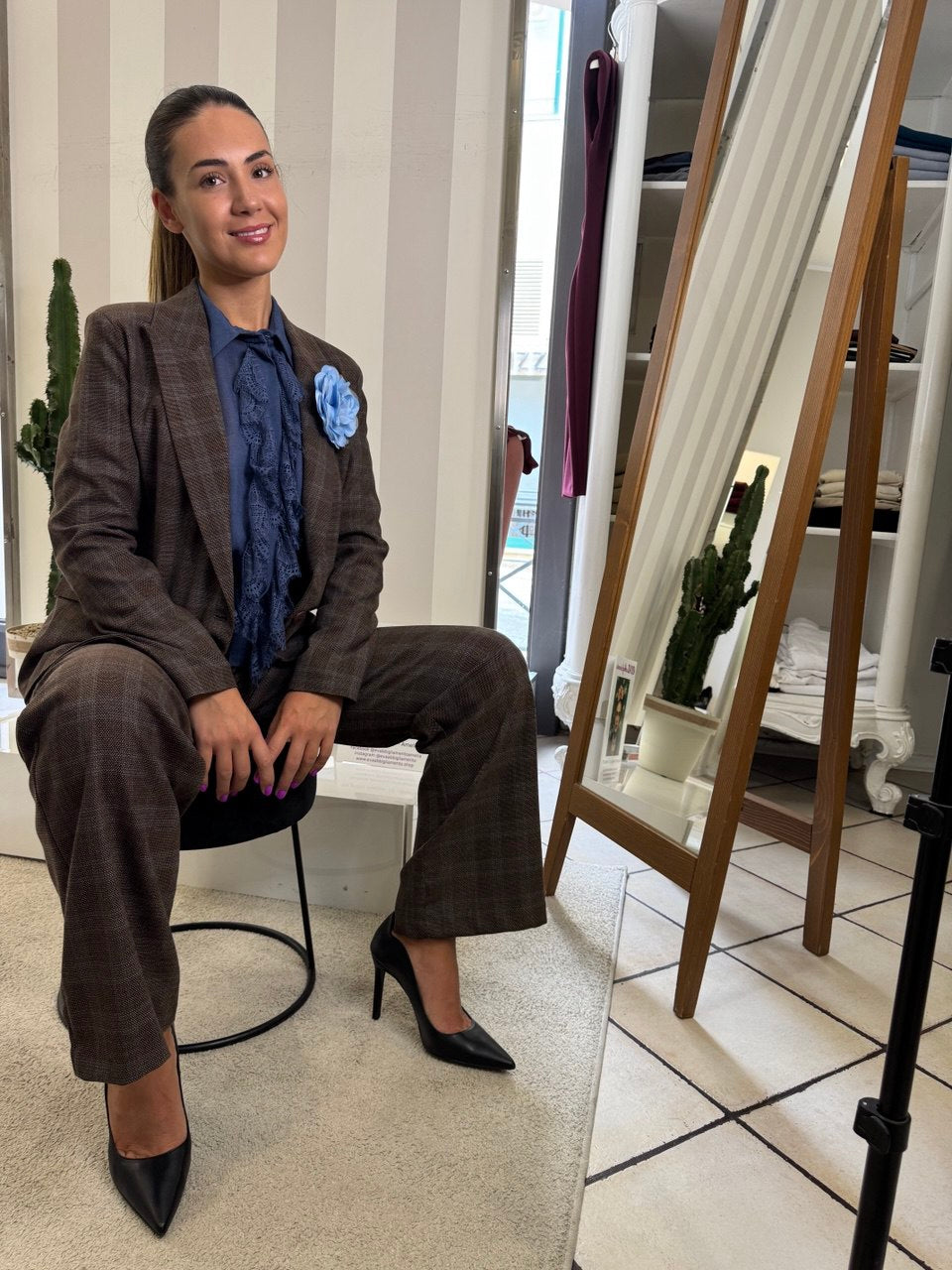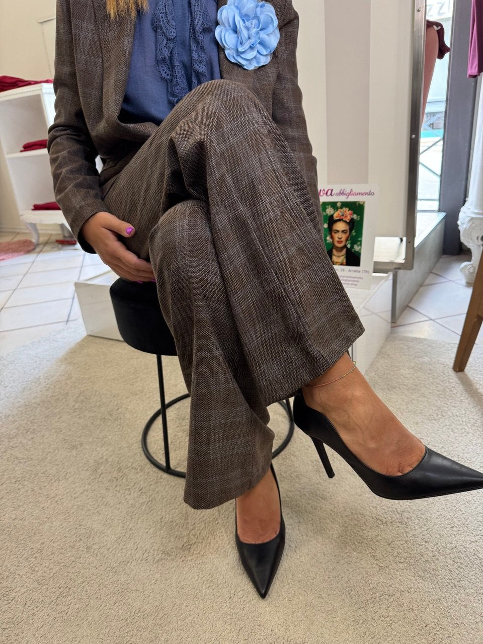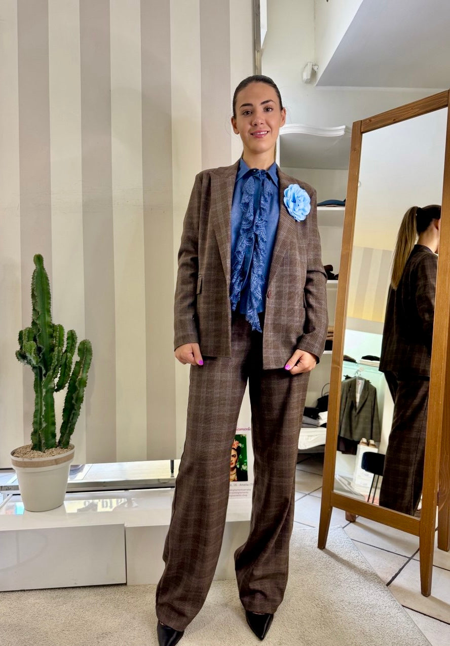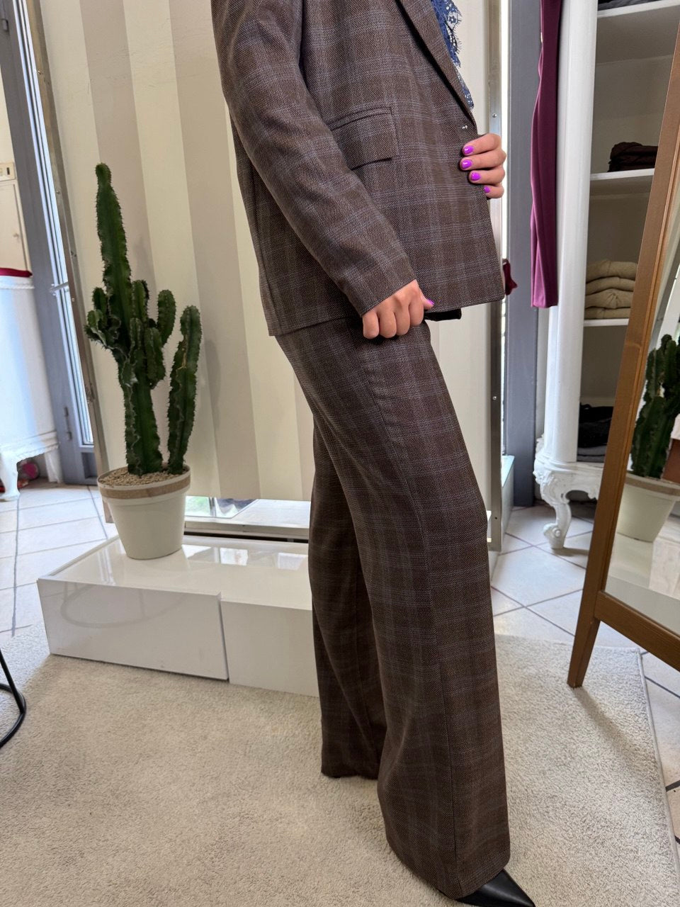 Completo composto da giacca lunga e pantalone gamba ampia a quadri,fondo marrone quadri celesti