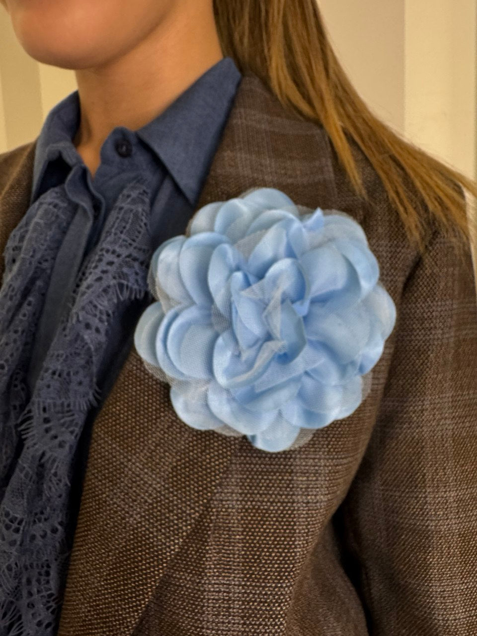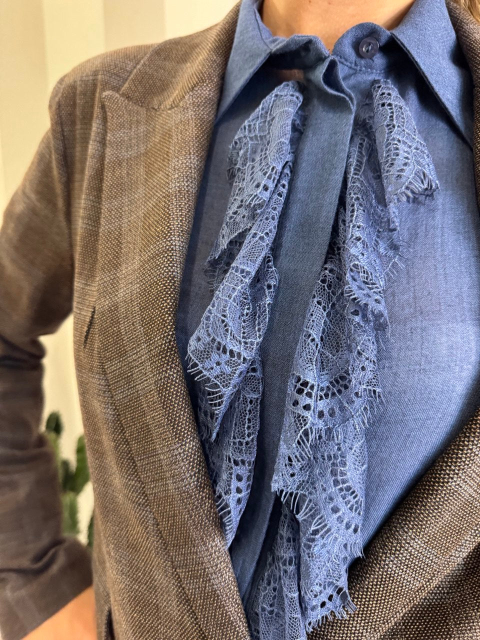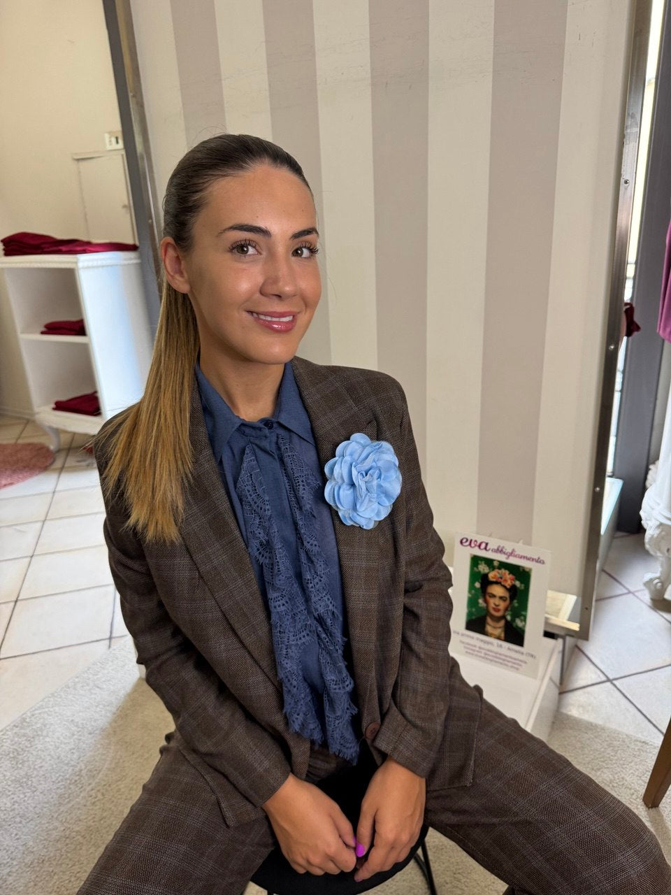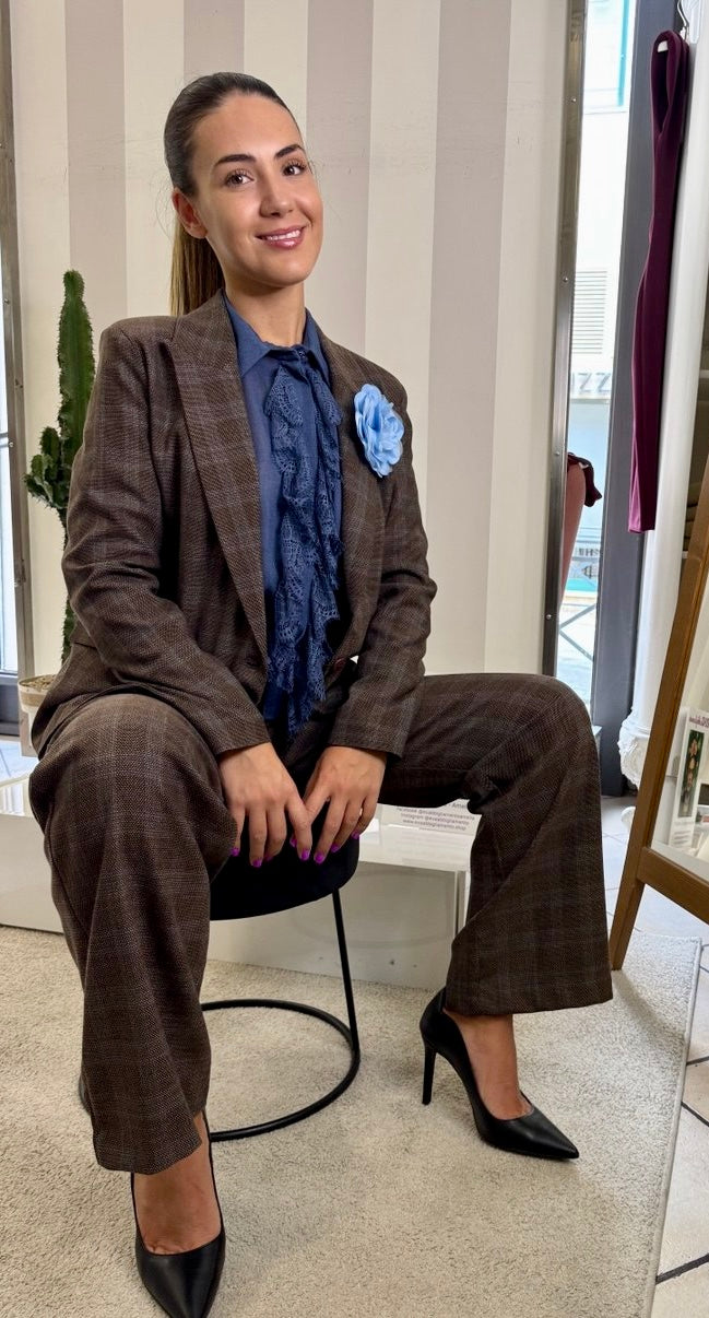 Completo composto da giacca lunga e pantalone gamba ampia a quadri,fondo marrone quadri celesti