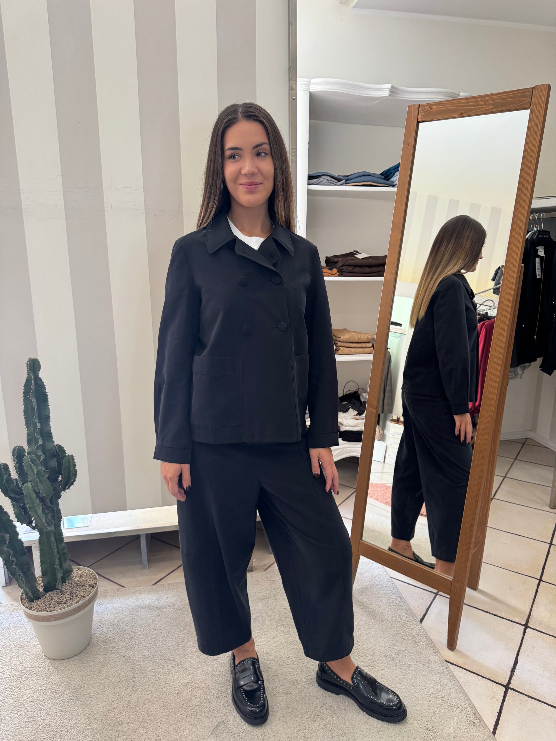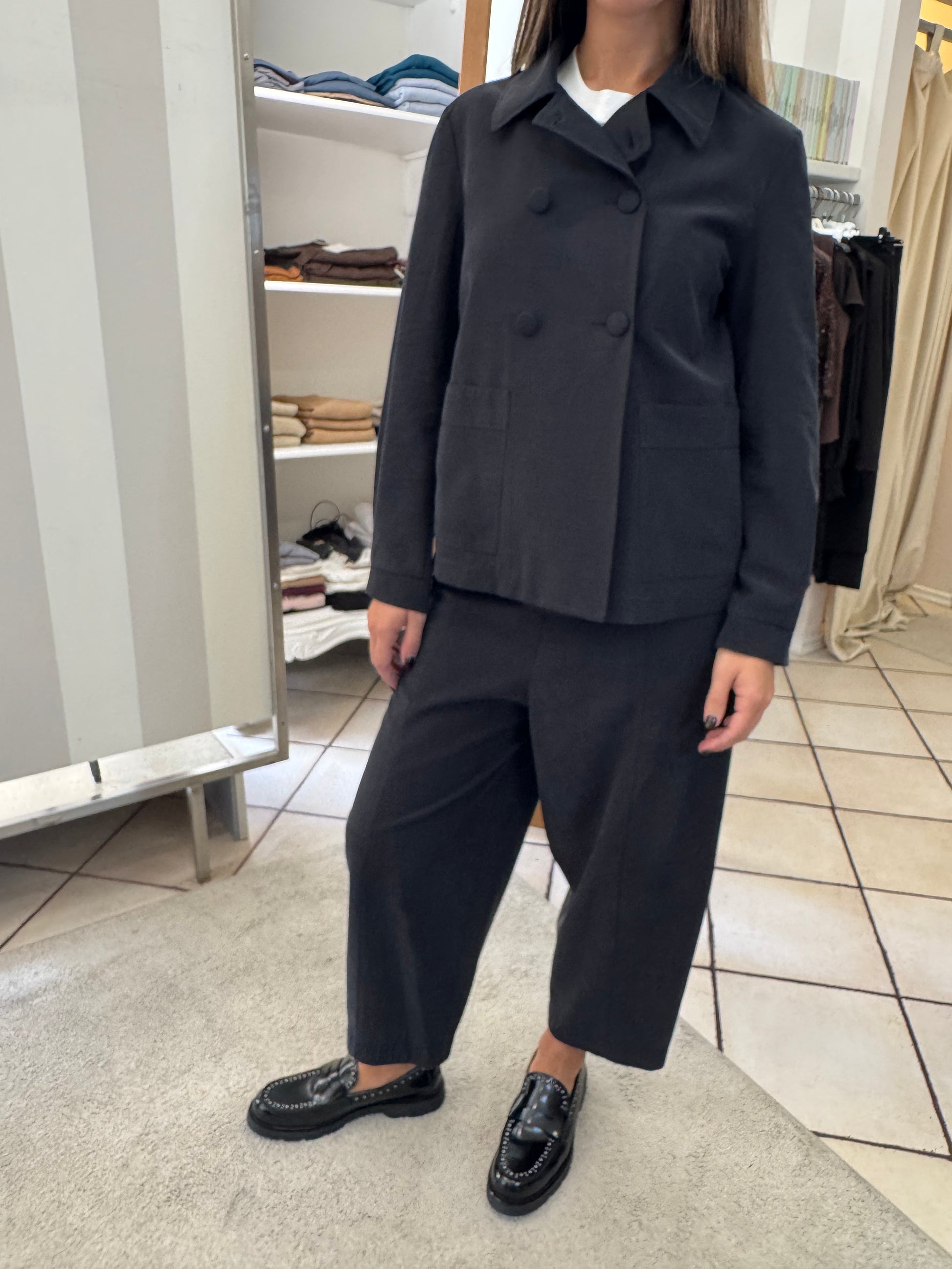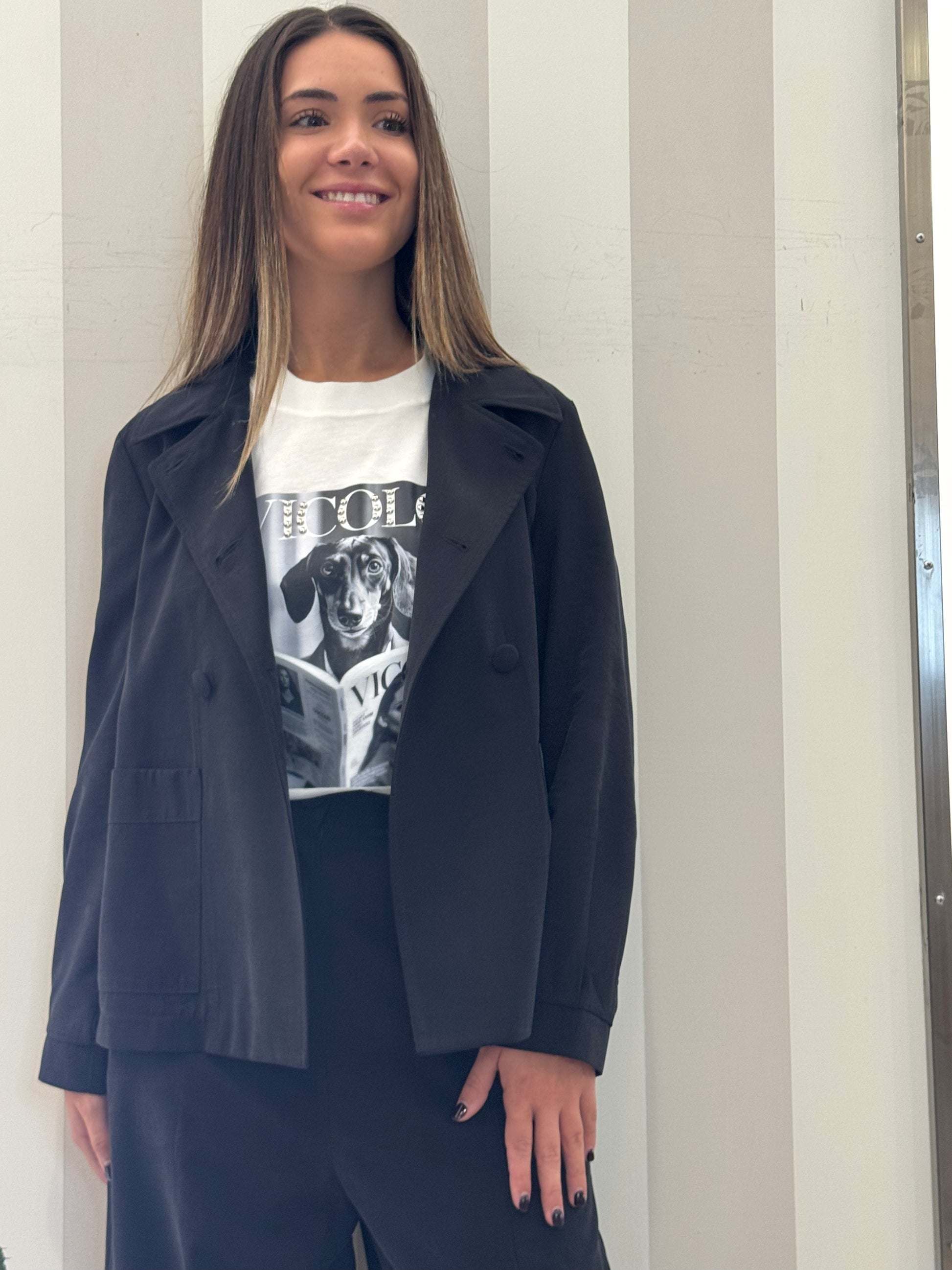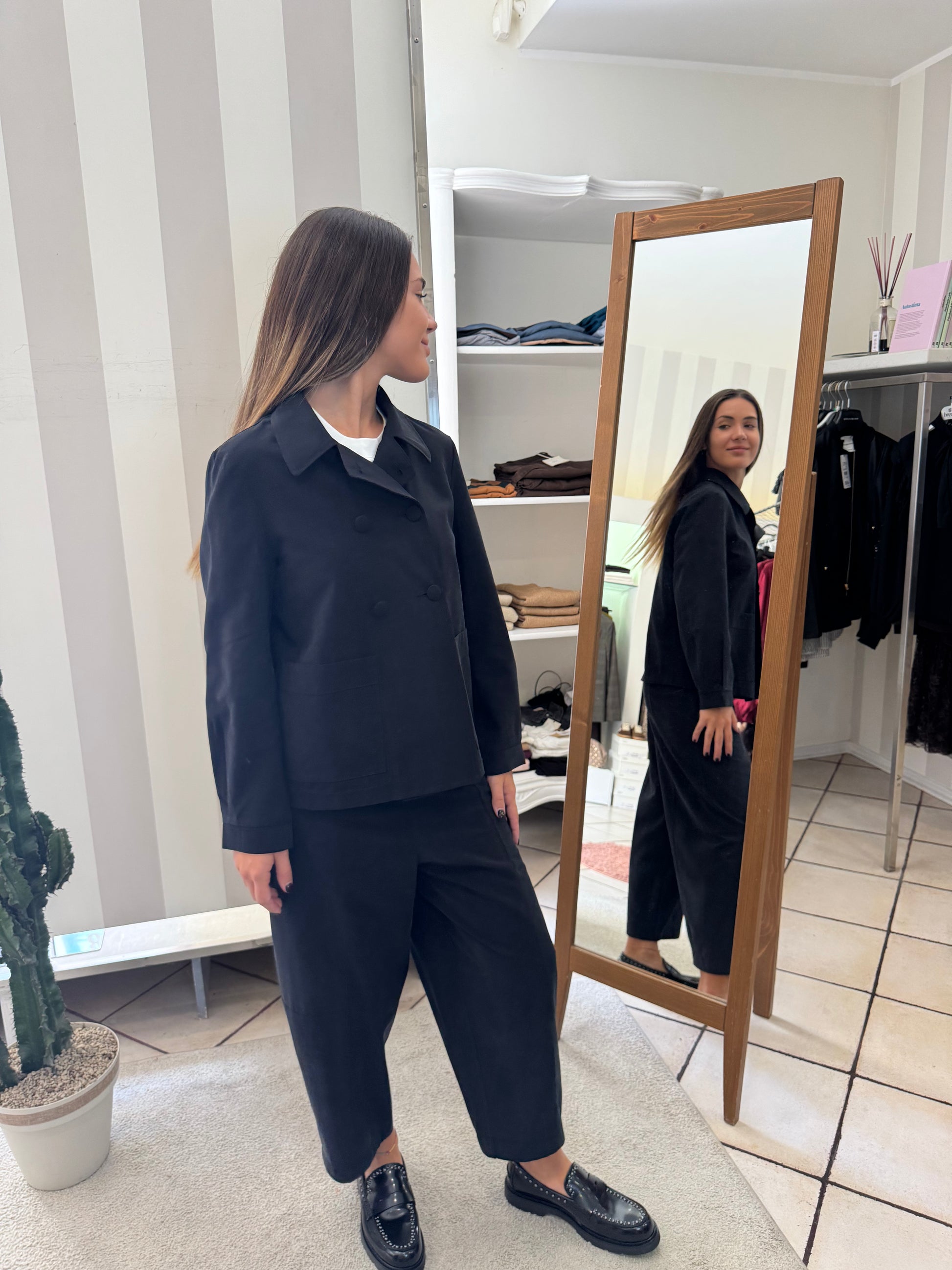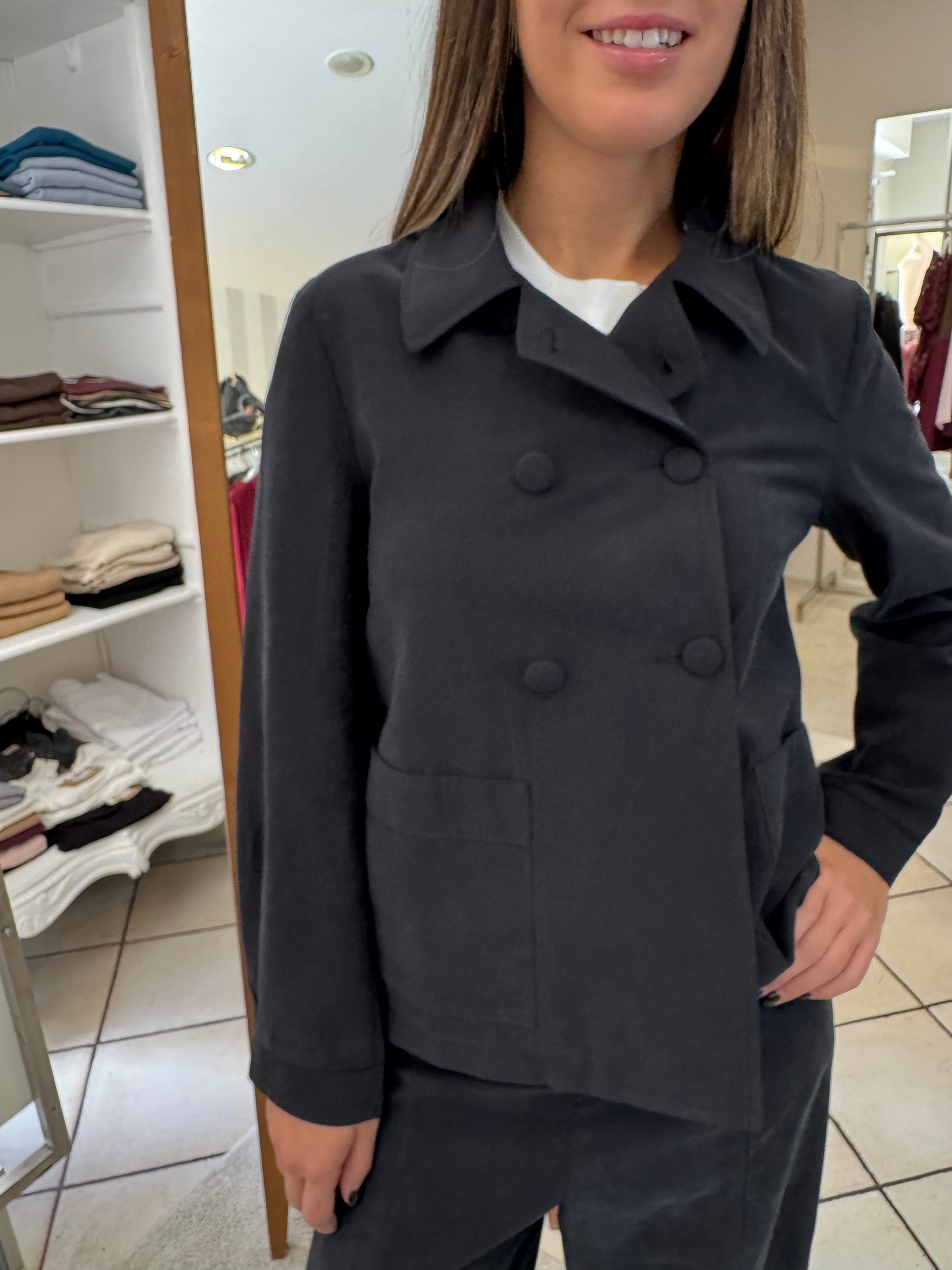 Descrizione: giacchina corta a doppiopetto, due taschini frontali. Taglio over.