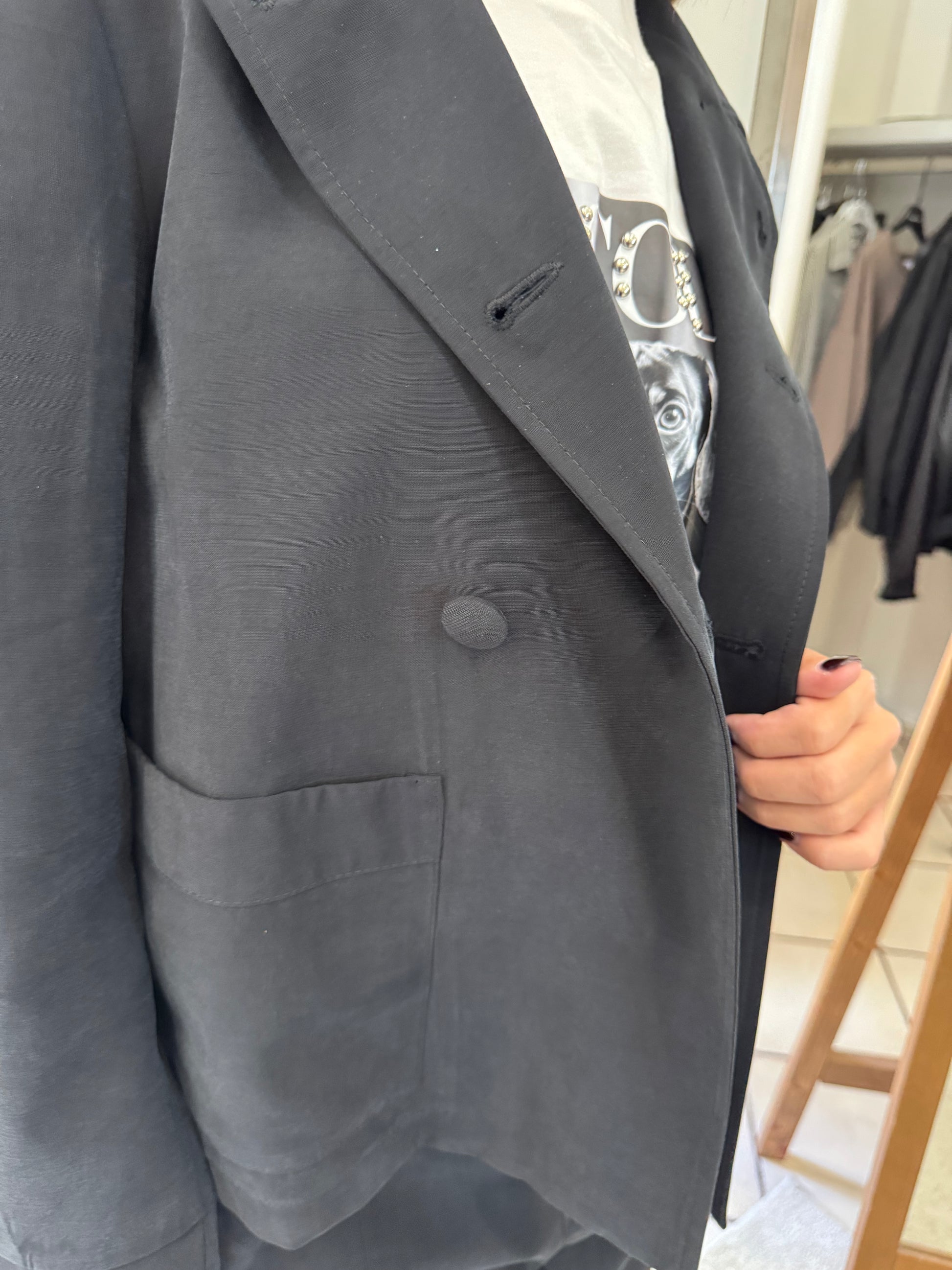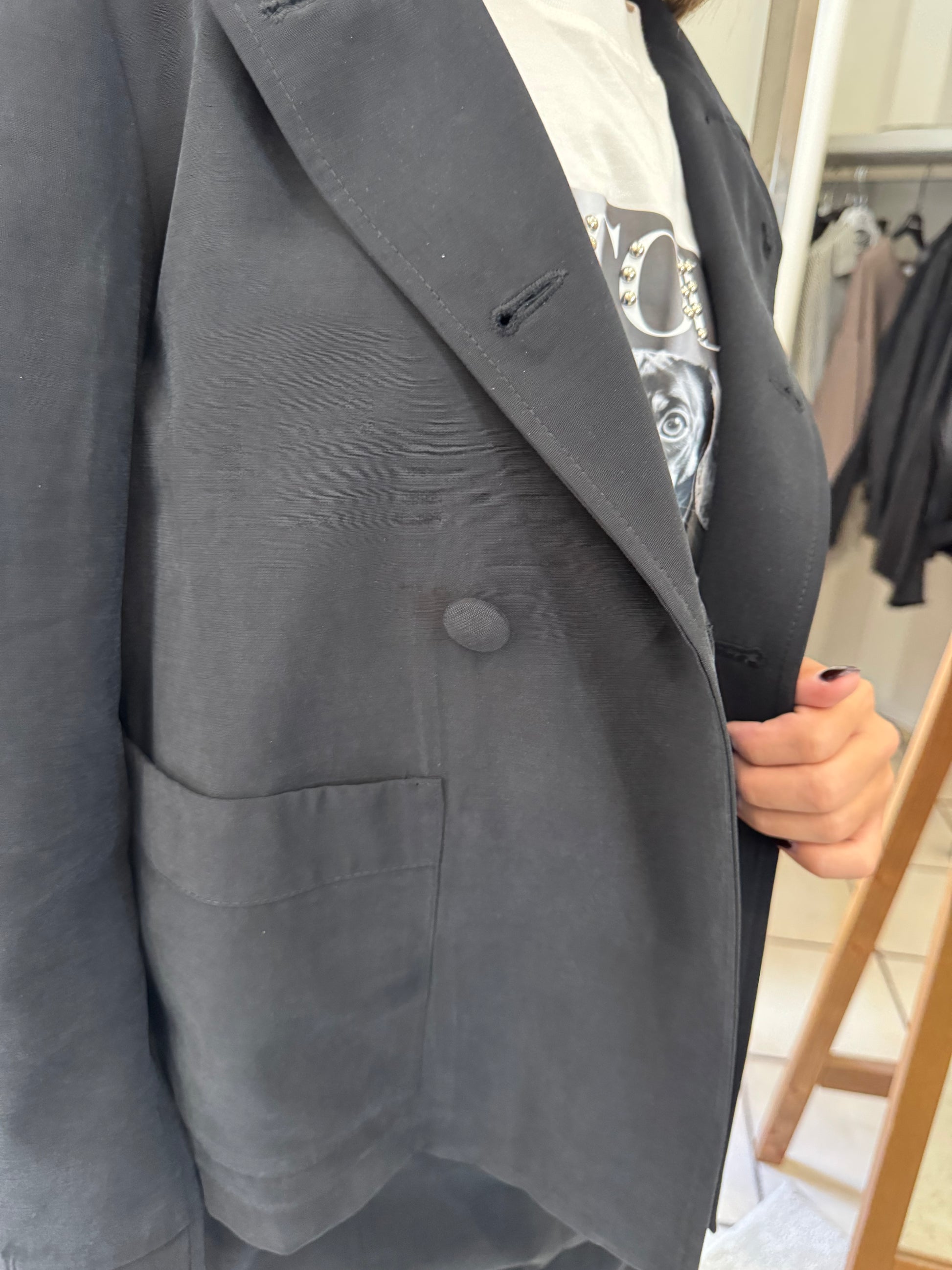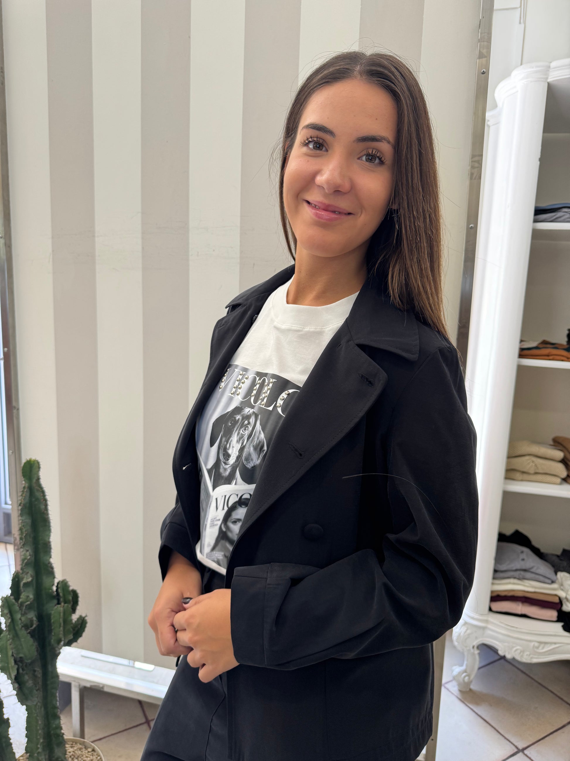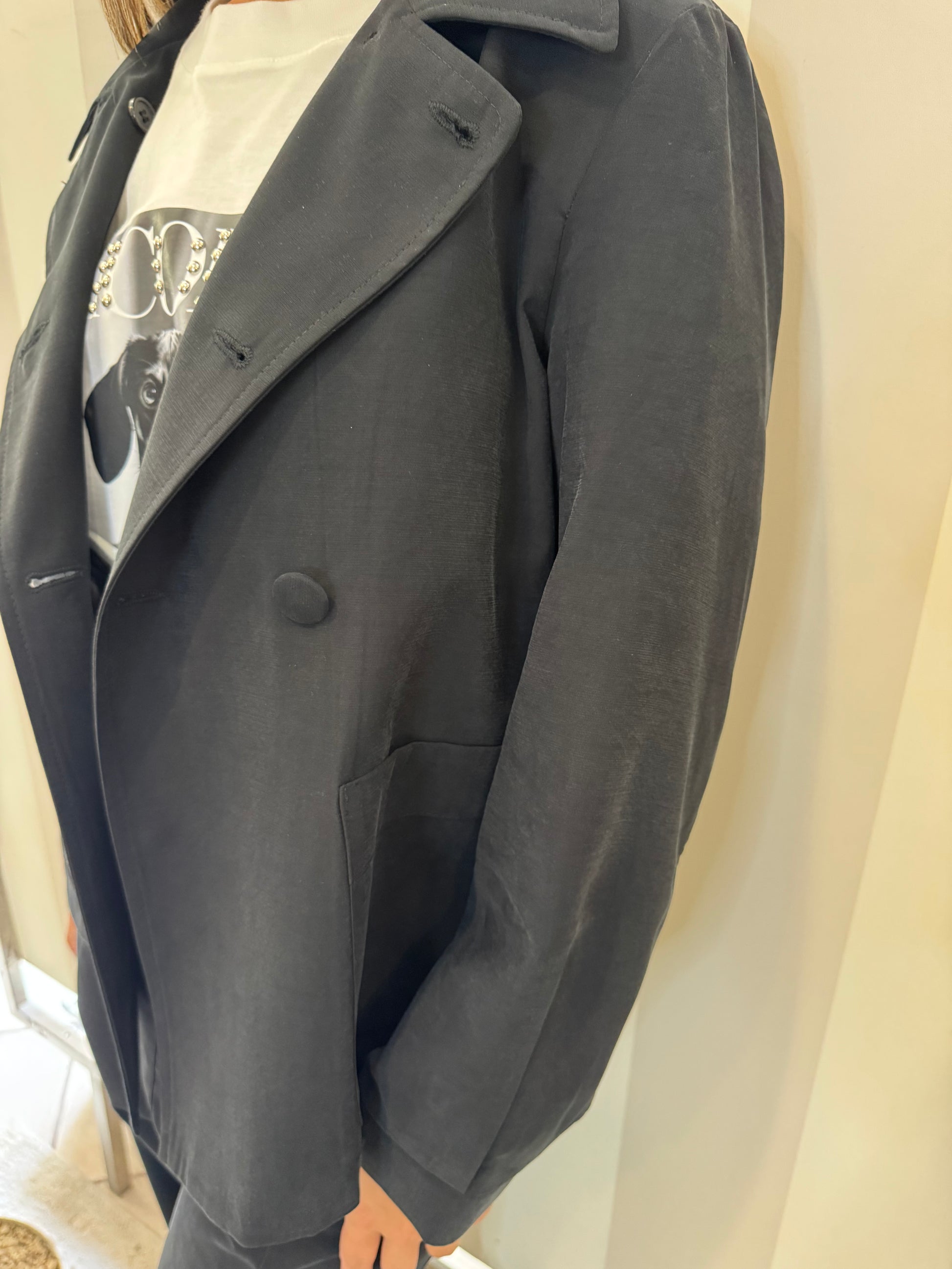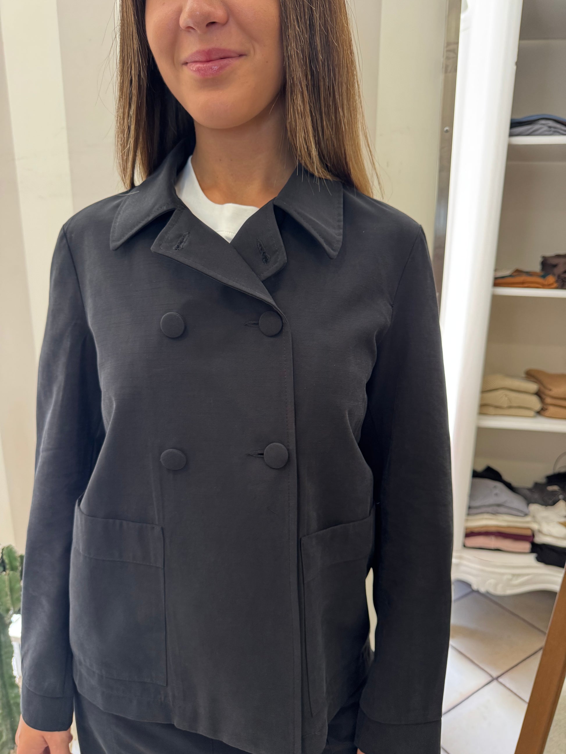 Descrizione: giacchina corta a doppiopetto, due taschini frontali. Taglio over.