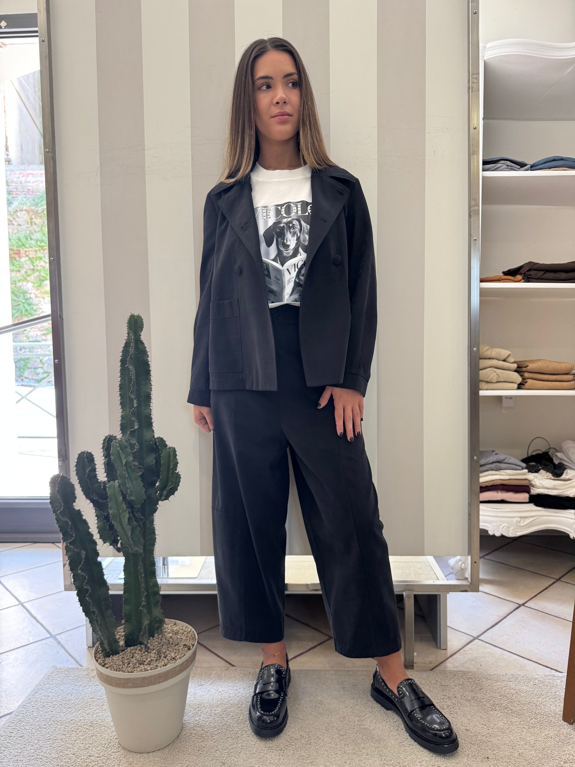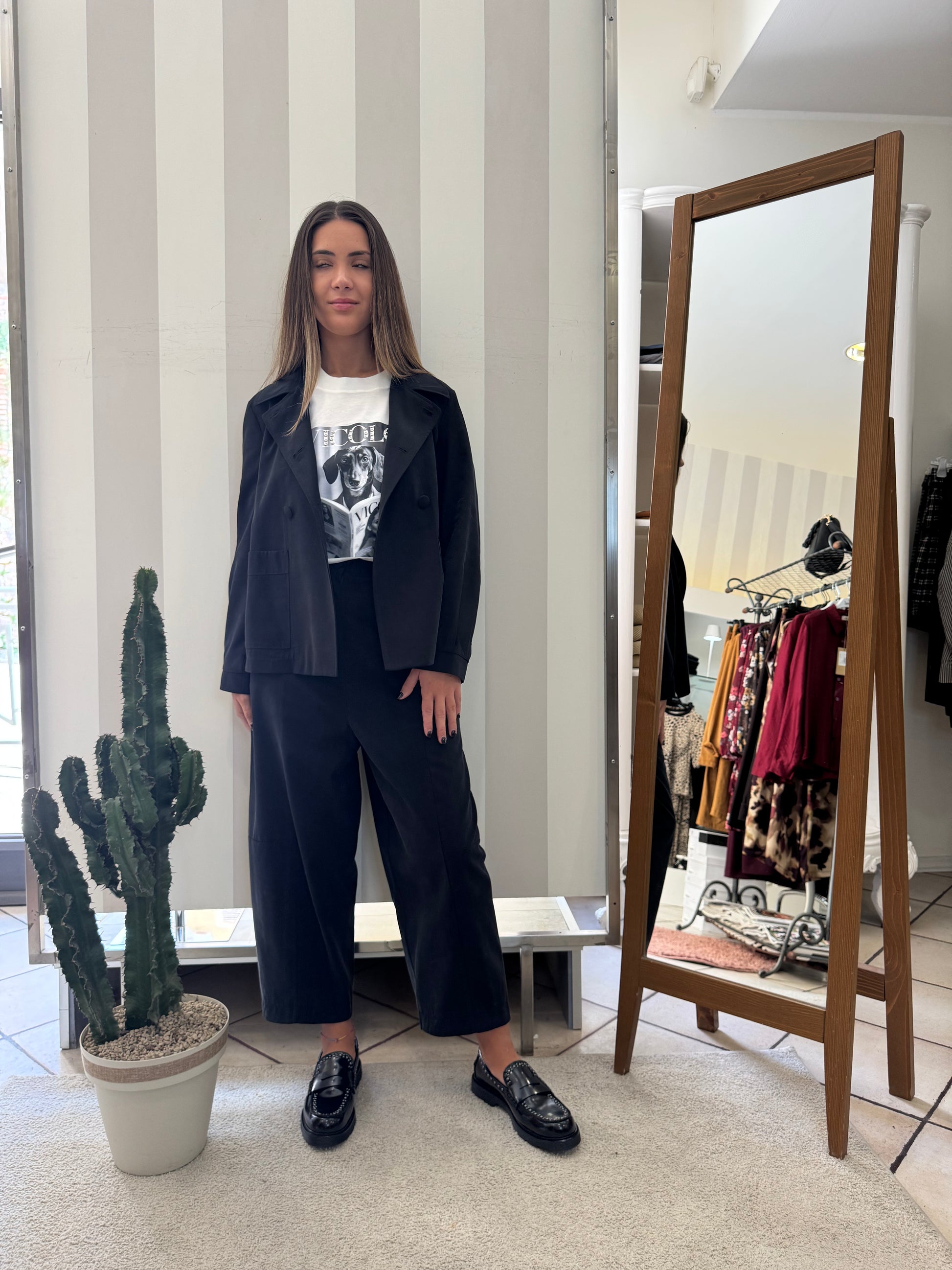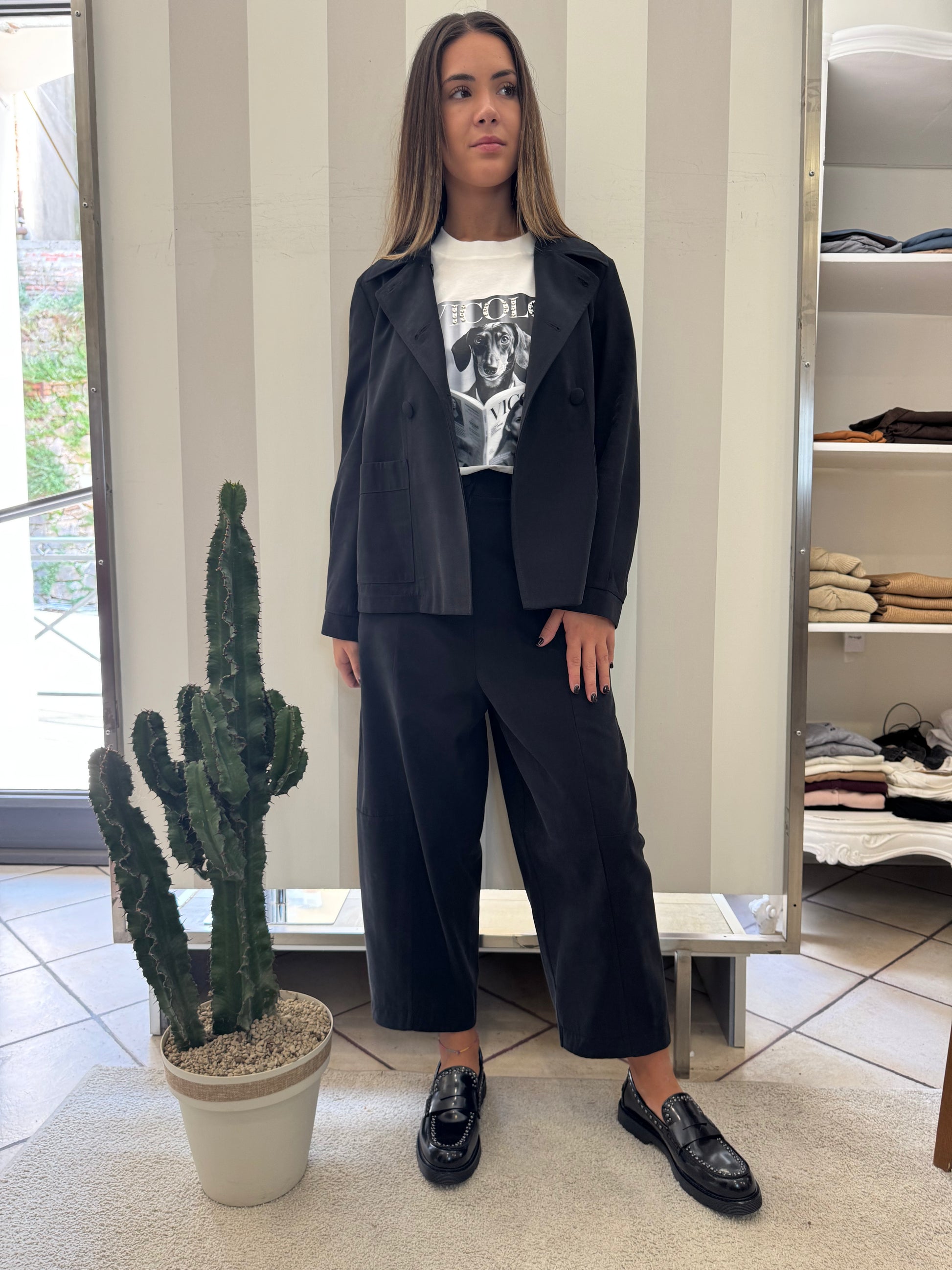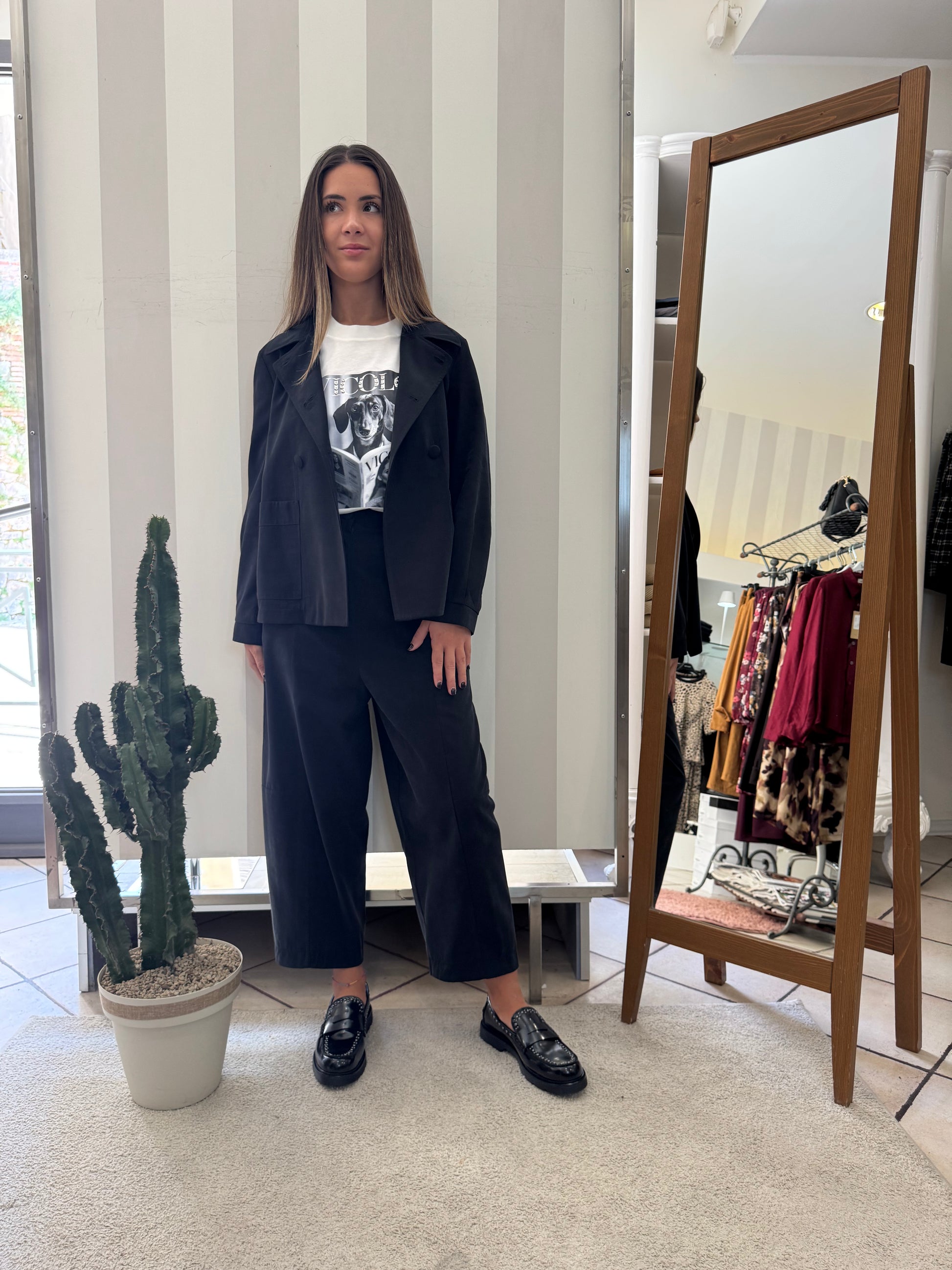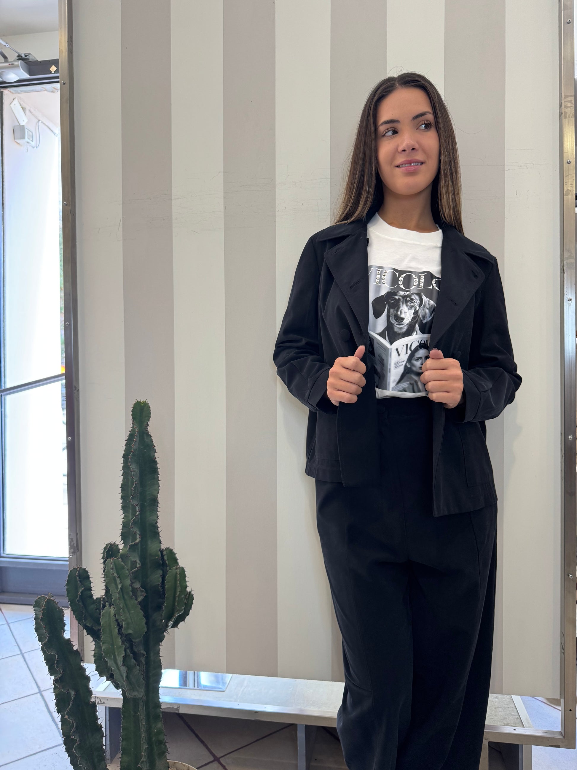 Descrizione: giacchina corta a doppiopetto, due taschini frontali. Taglio over.
