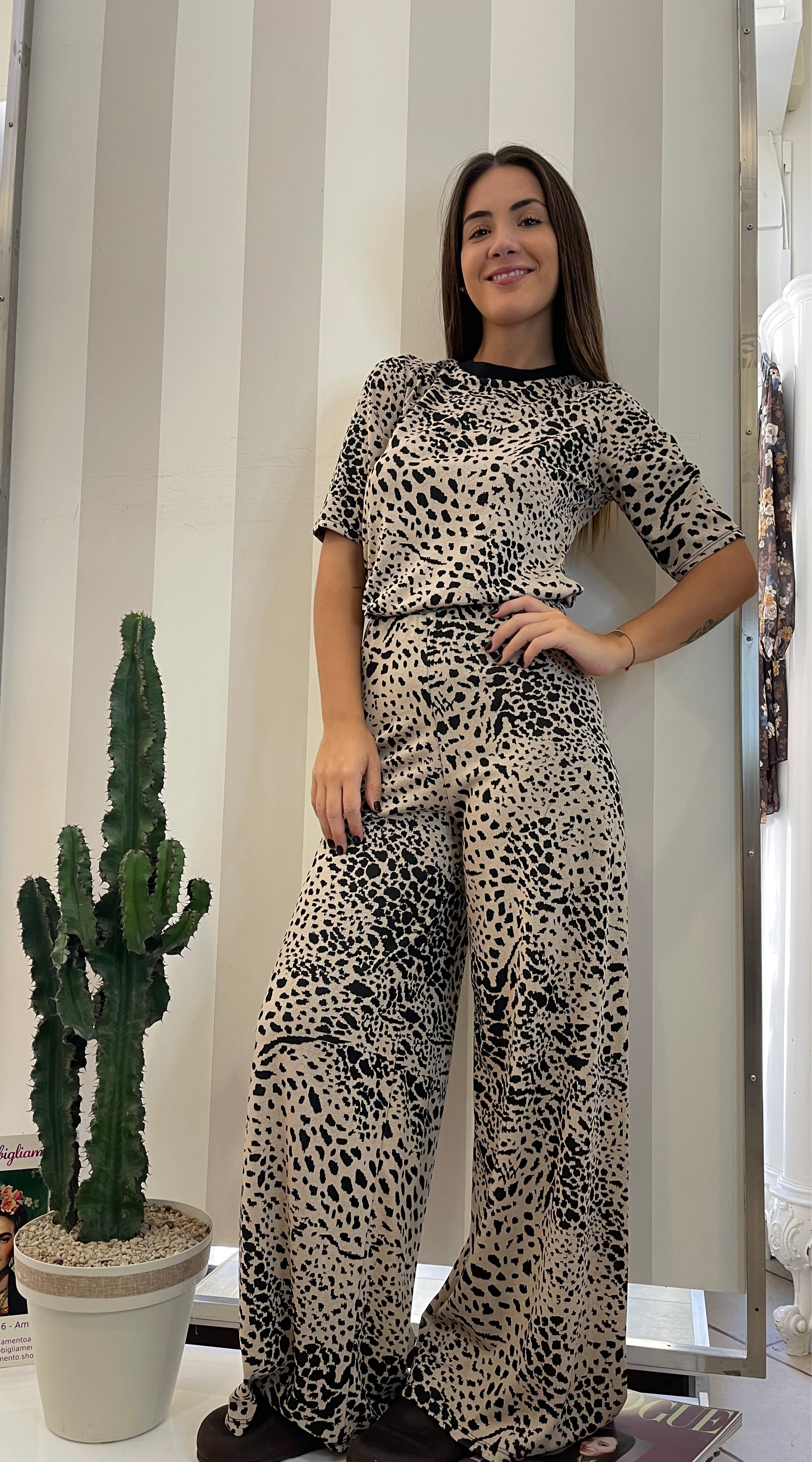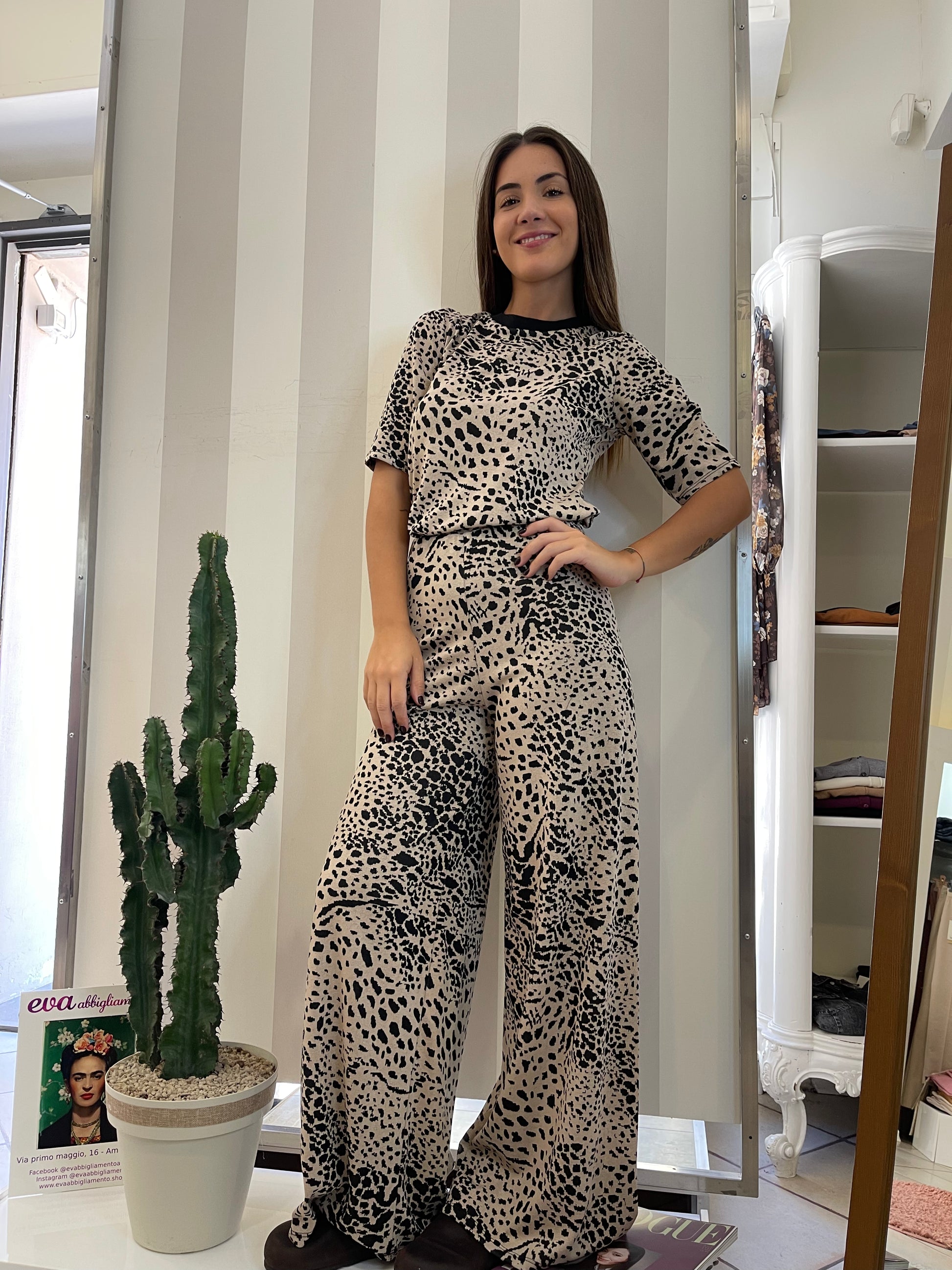Descrizione: Completo in maglia jacquard, colore beige, pantalone gamba ampia con elastico in vita e maglia manica corta , colletto a contrasto.