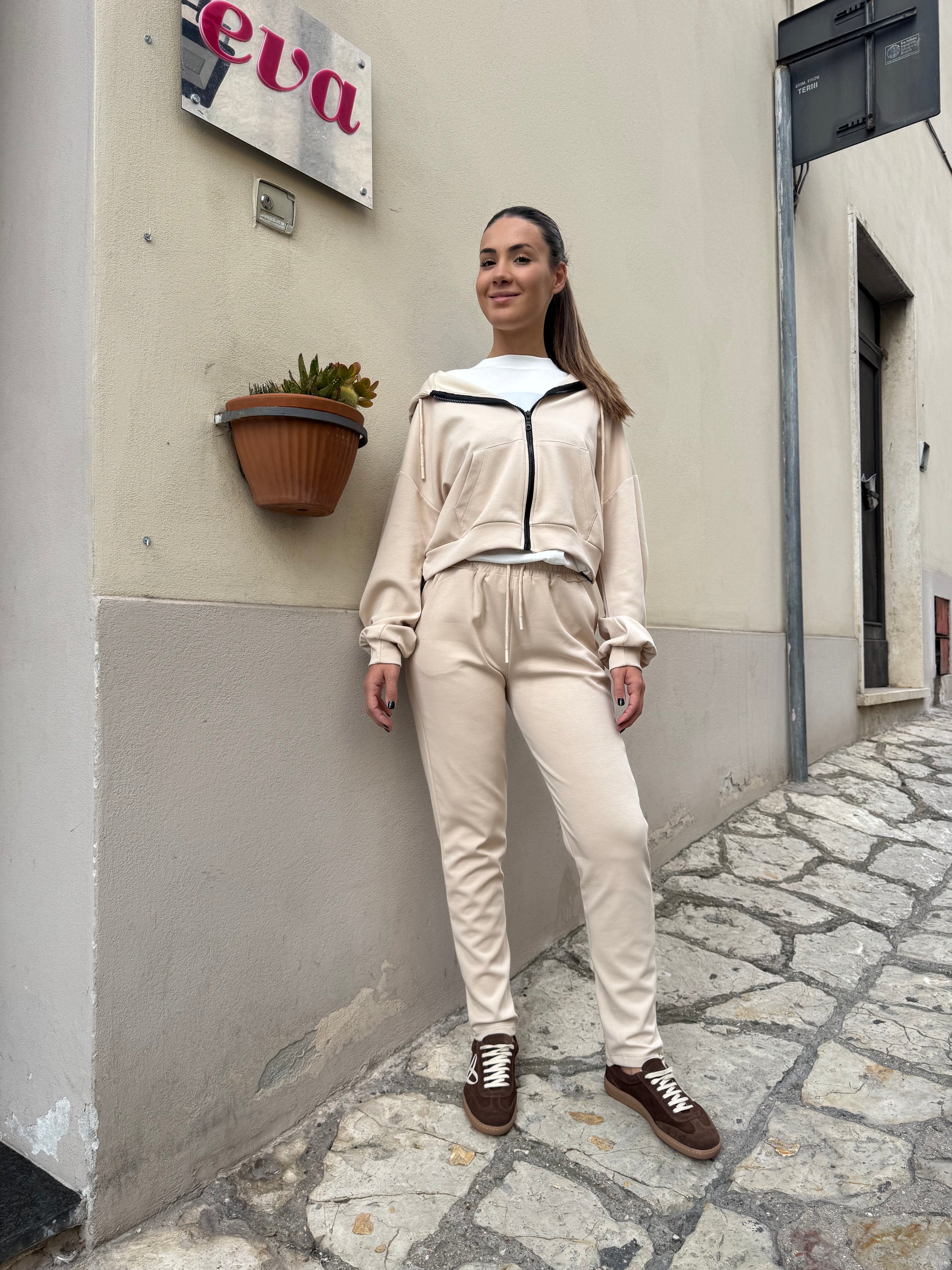 Descrizione: Completo in neoprene composto da felpa con cappuccio e zip, pantalone con elastico in vita e laccetto regolabile, gamba stretta