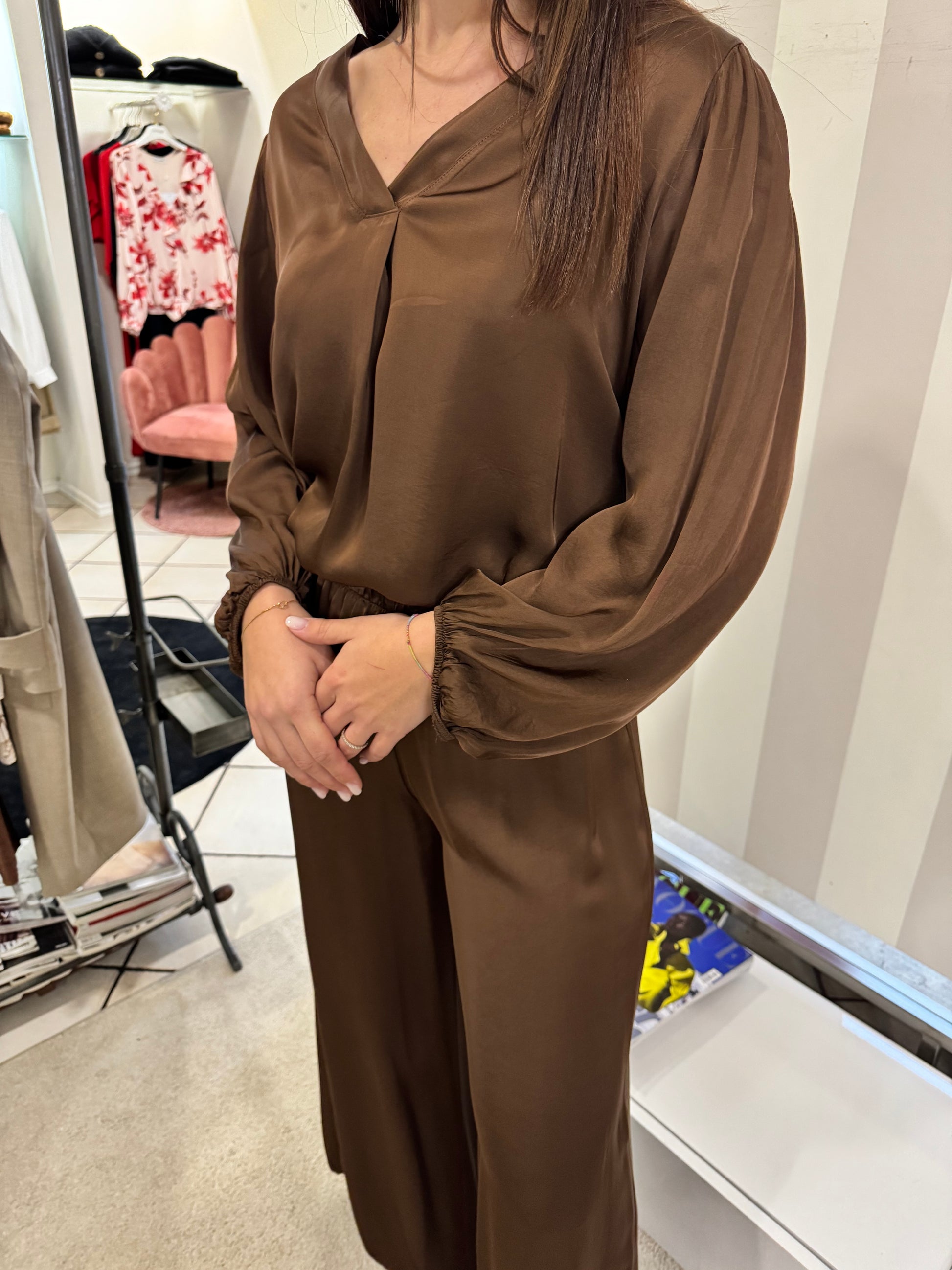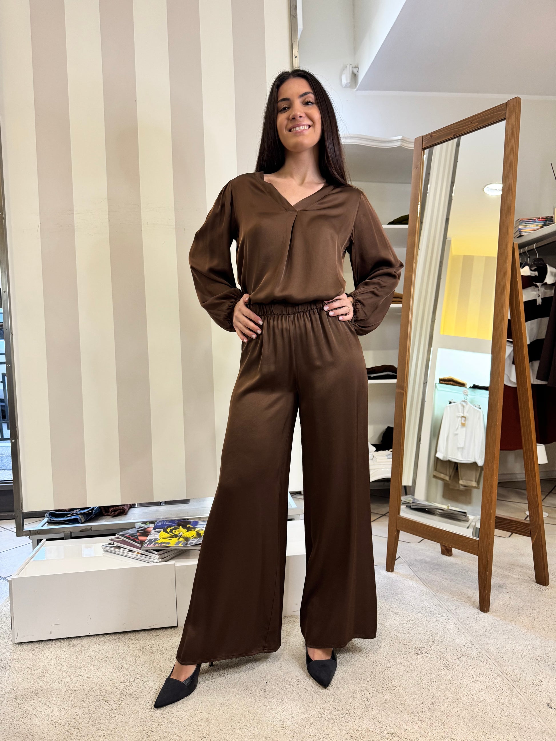 Descrizione: Set composto da blusa scollo a V e pantalone gamba ampia io satin-