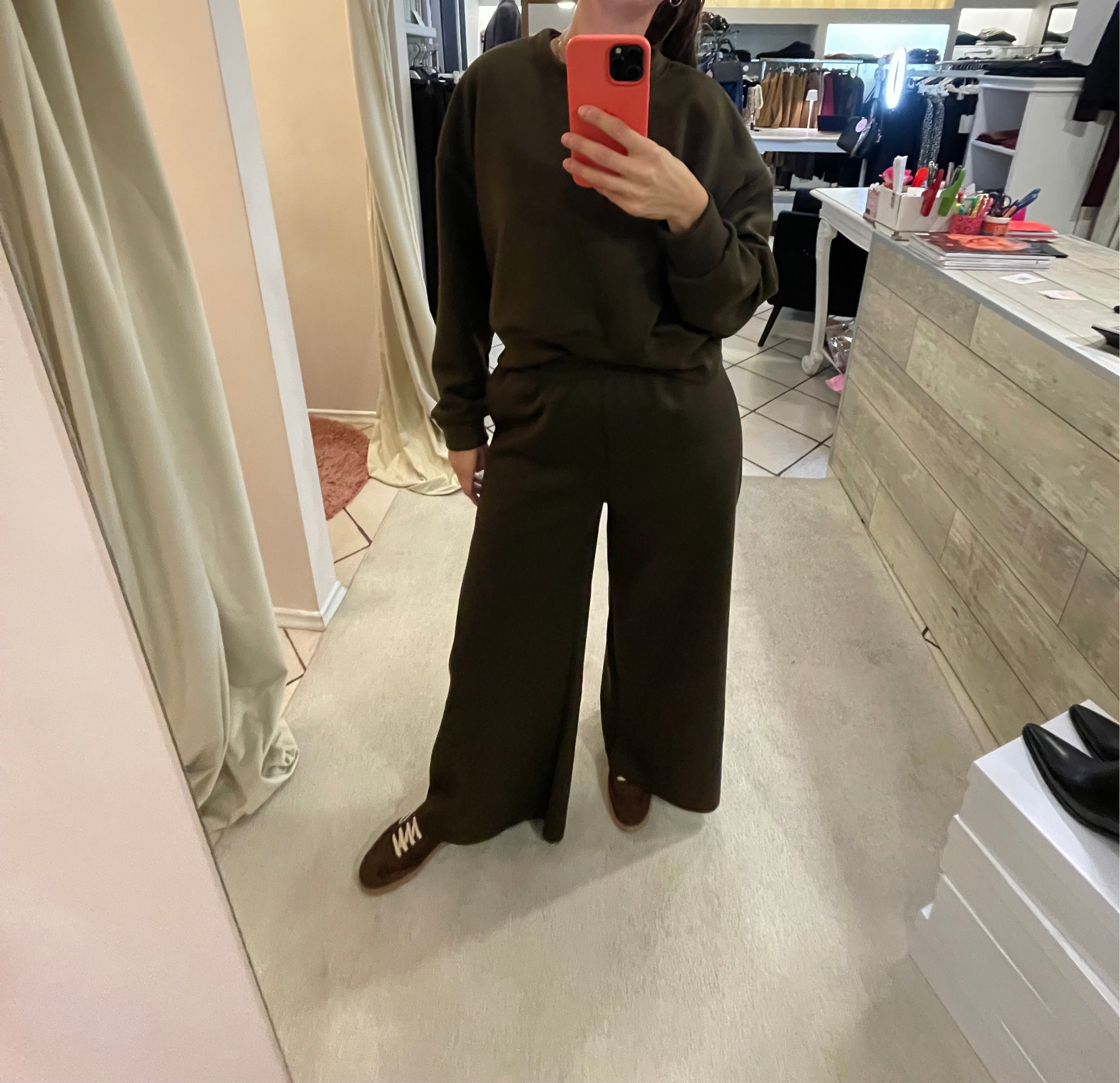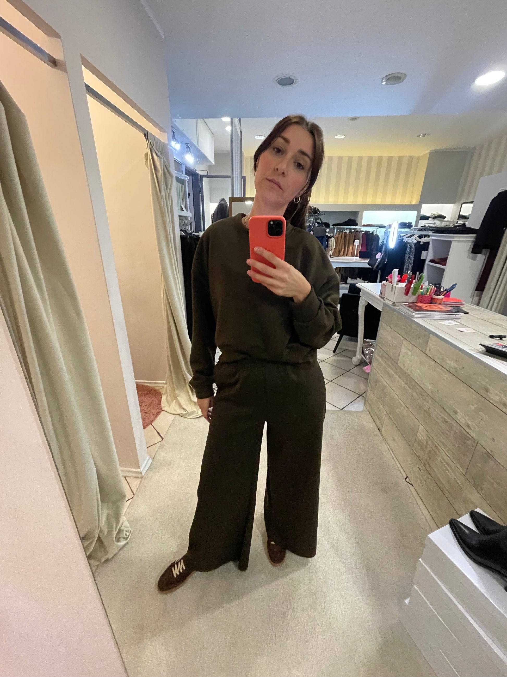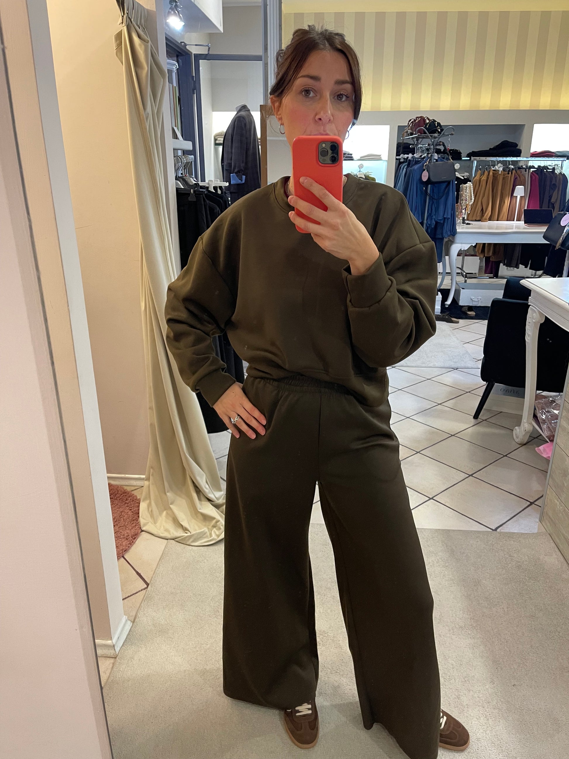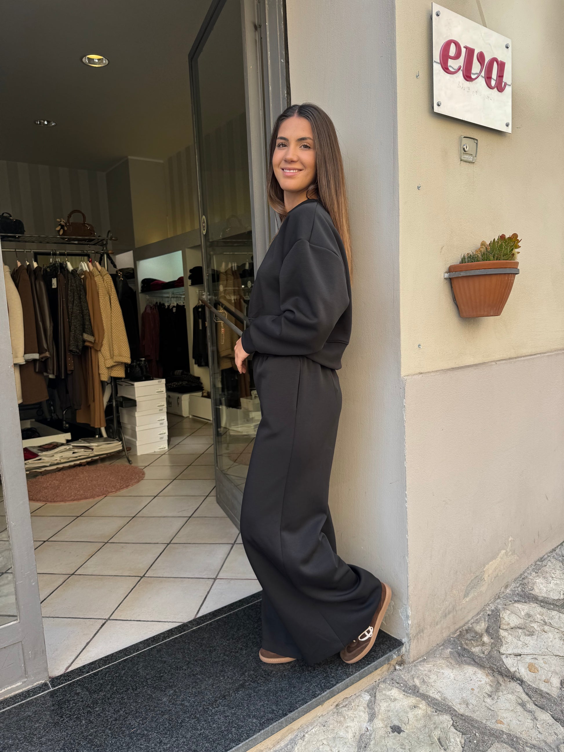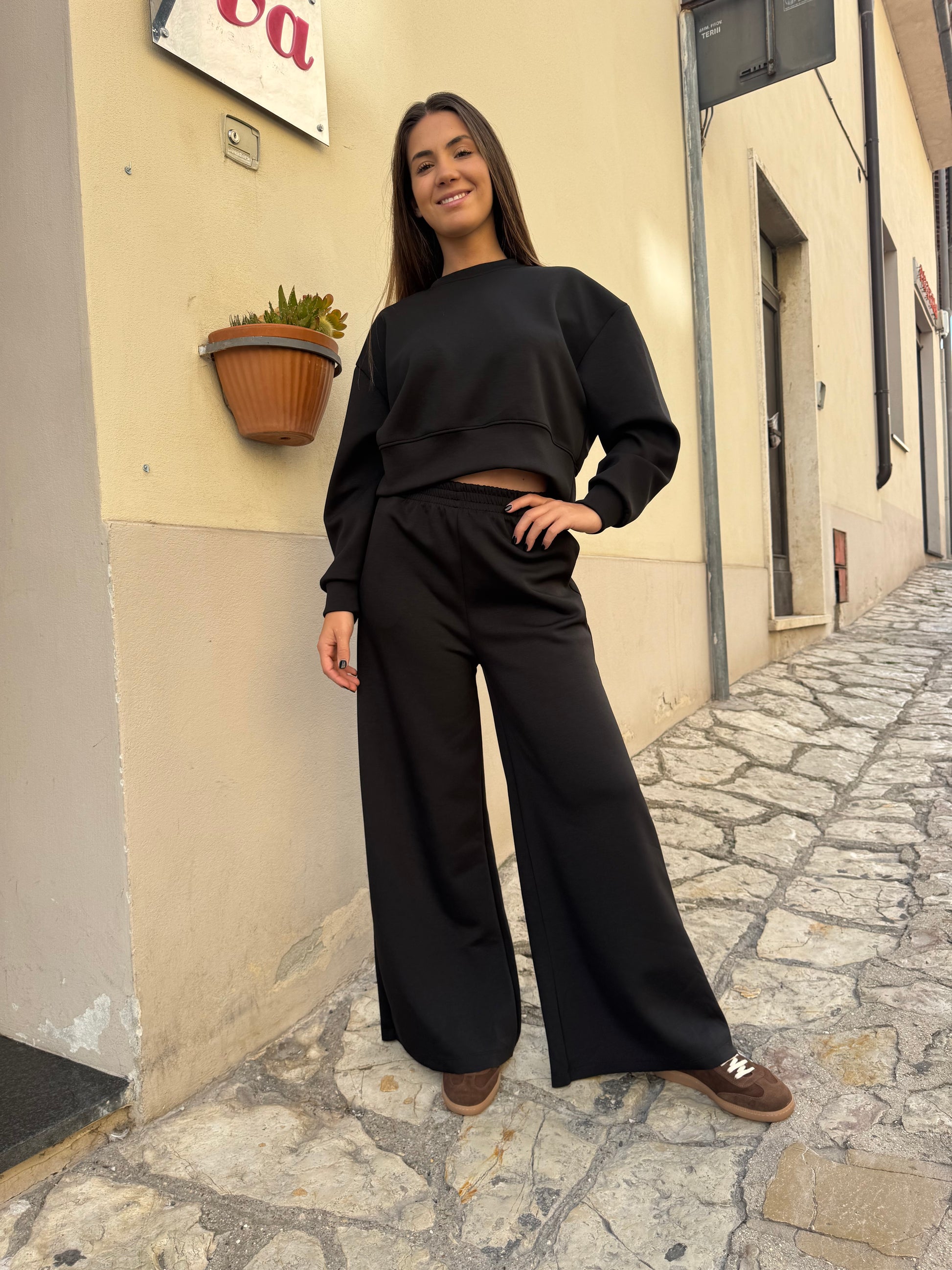 Descrizione: Completo in light neoprene con felpa taglio corto e pantalone palazzo,elastico in vita e gamba ampia,tasche laterali