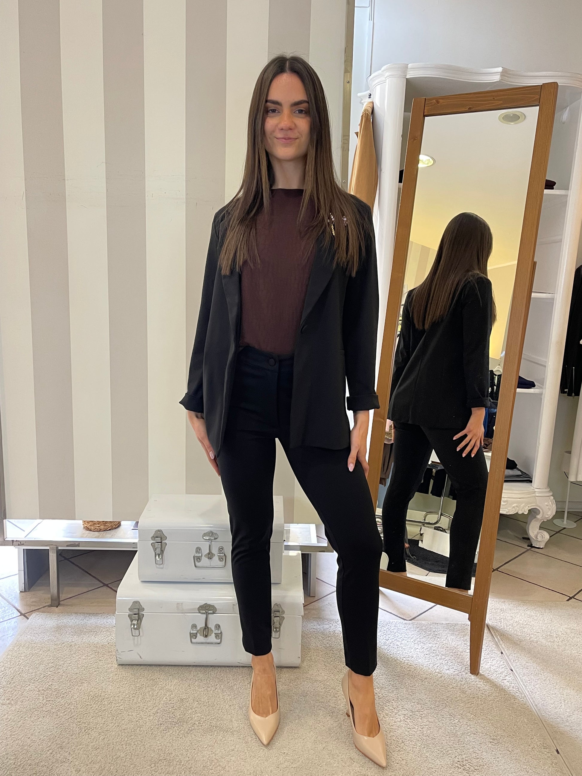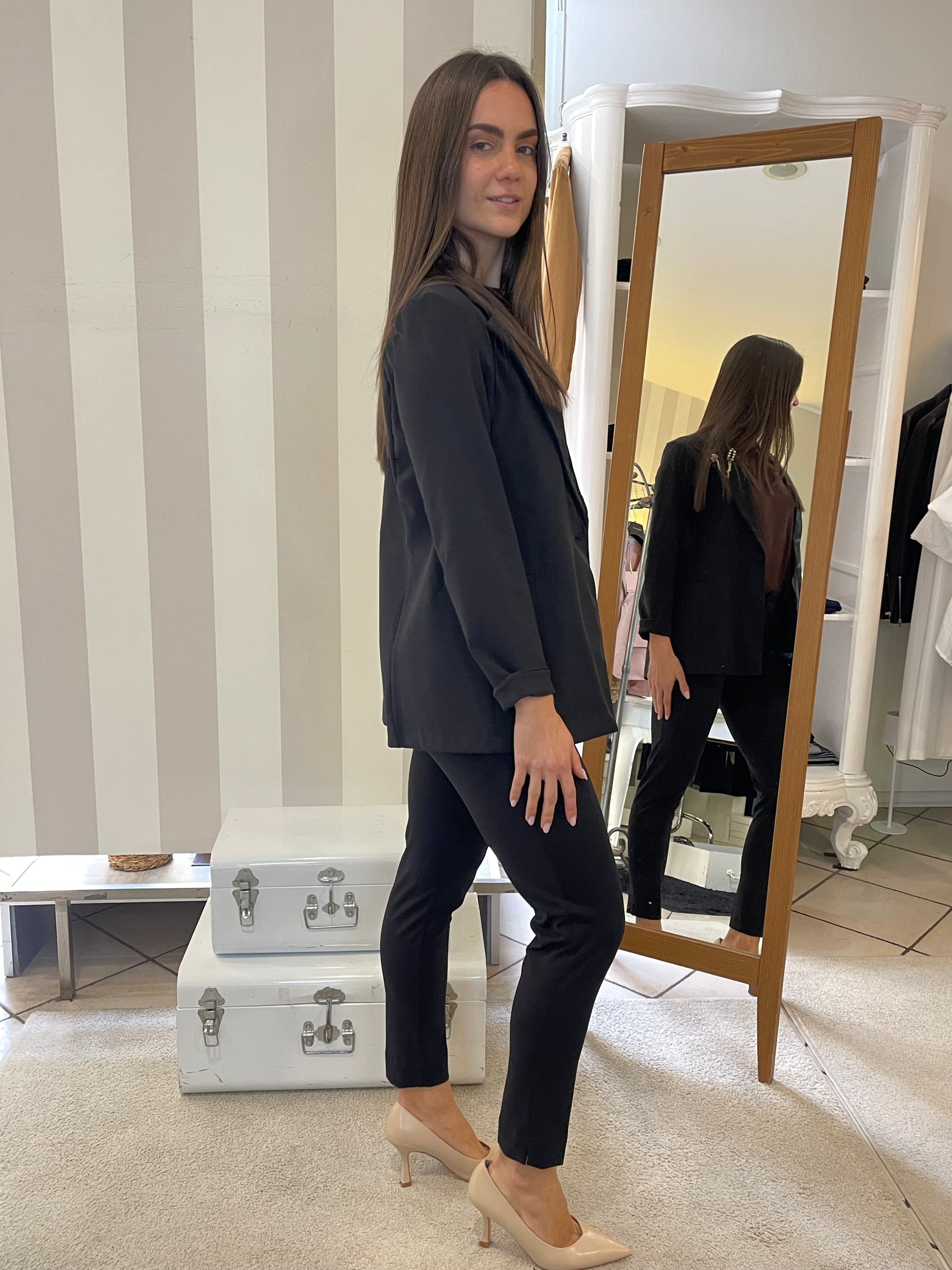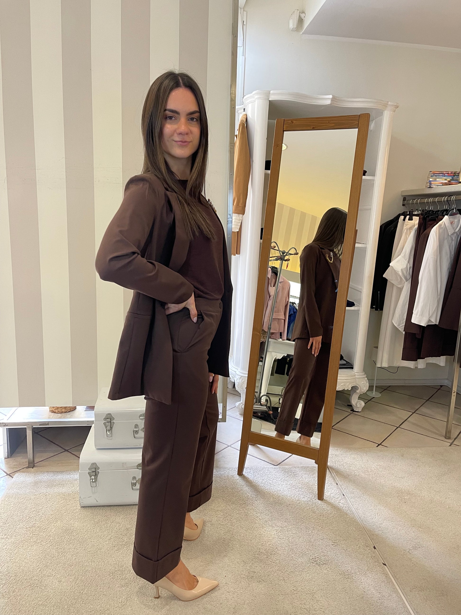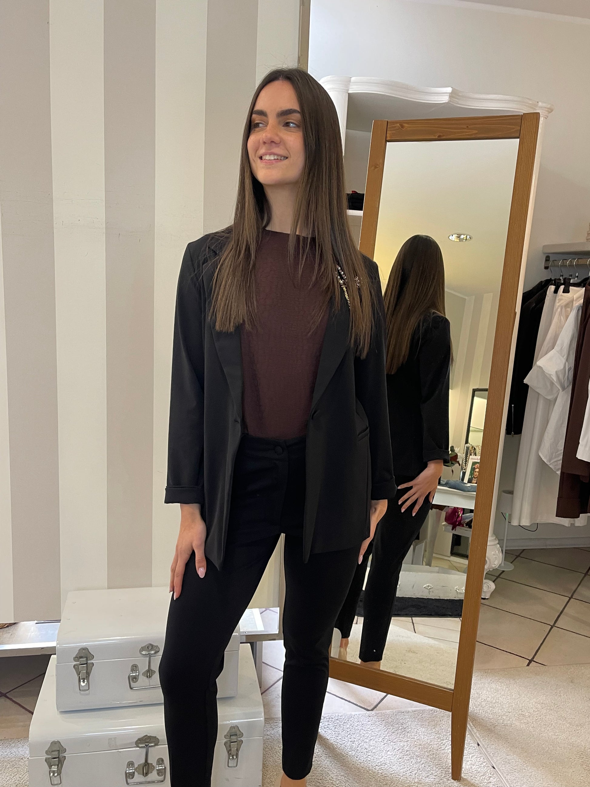 Descrizione: Completo in punto Milano con giacca taglio blazer lungo e pantalone in due modelli,taglio Wide leg con risvolto sul finale e modello sigaretta,stretto sulla gamba e sul fondo-entrambi i colori hanno pantalone sia modello wide sia modello sigaretta,scegli il tuo preferito.