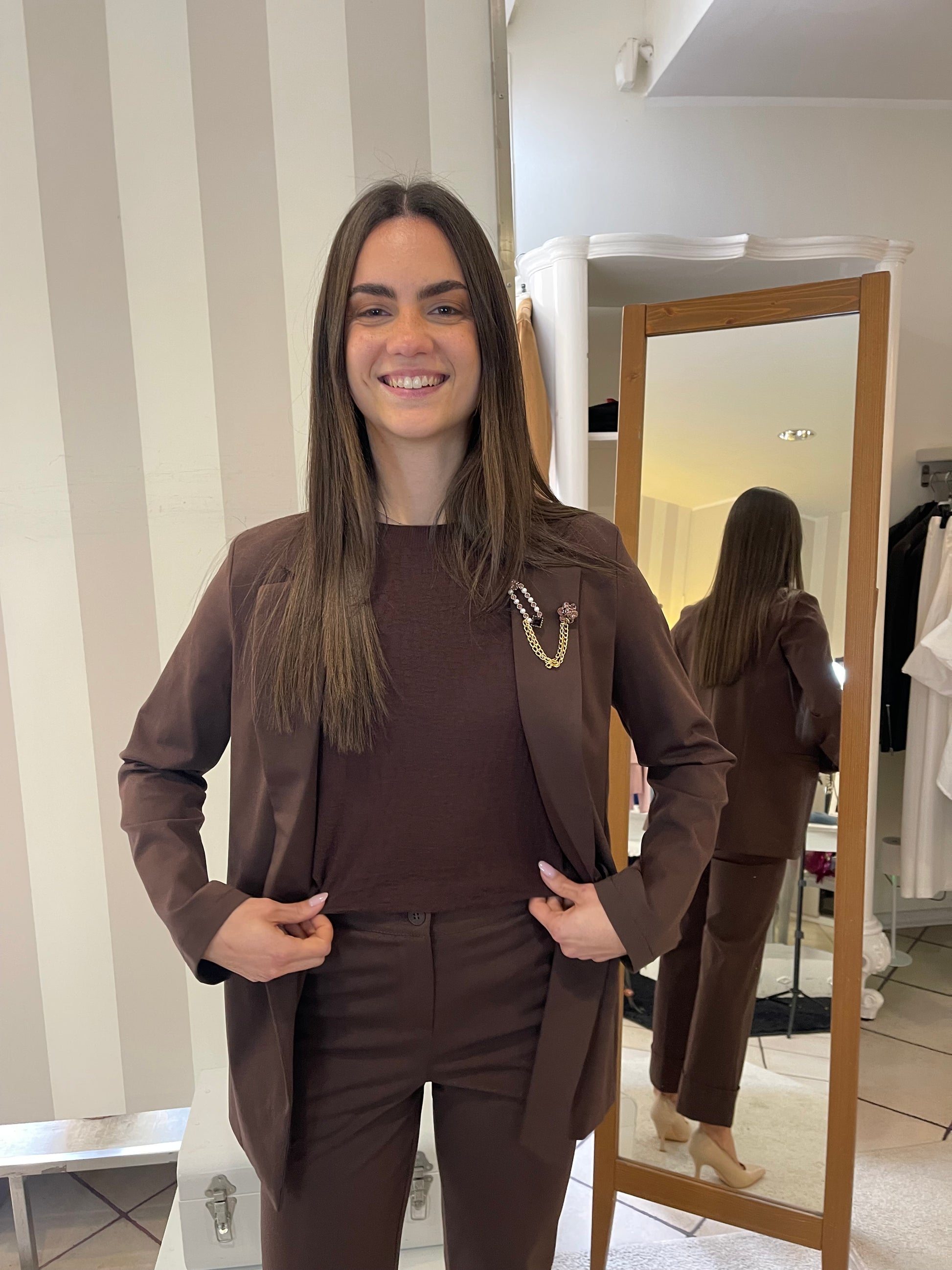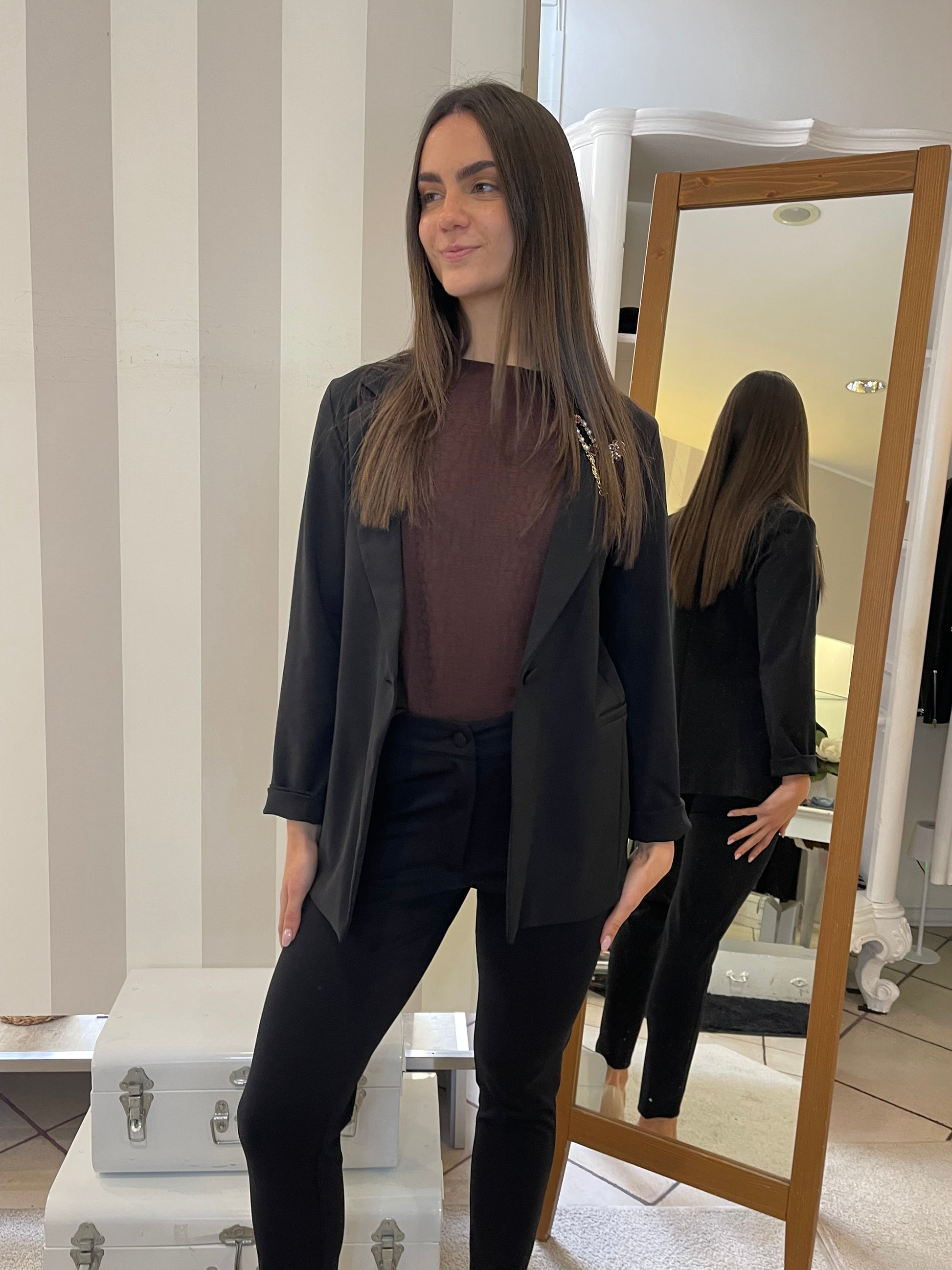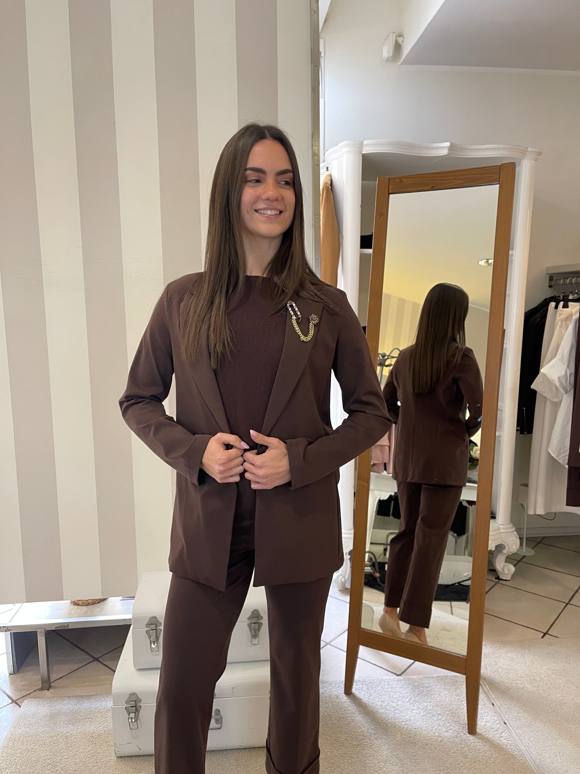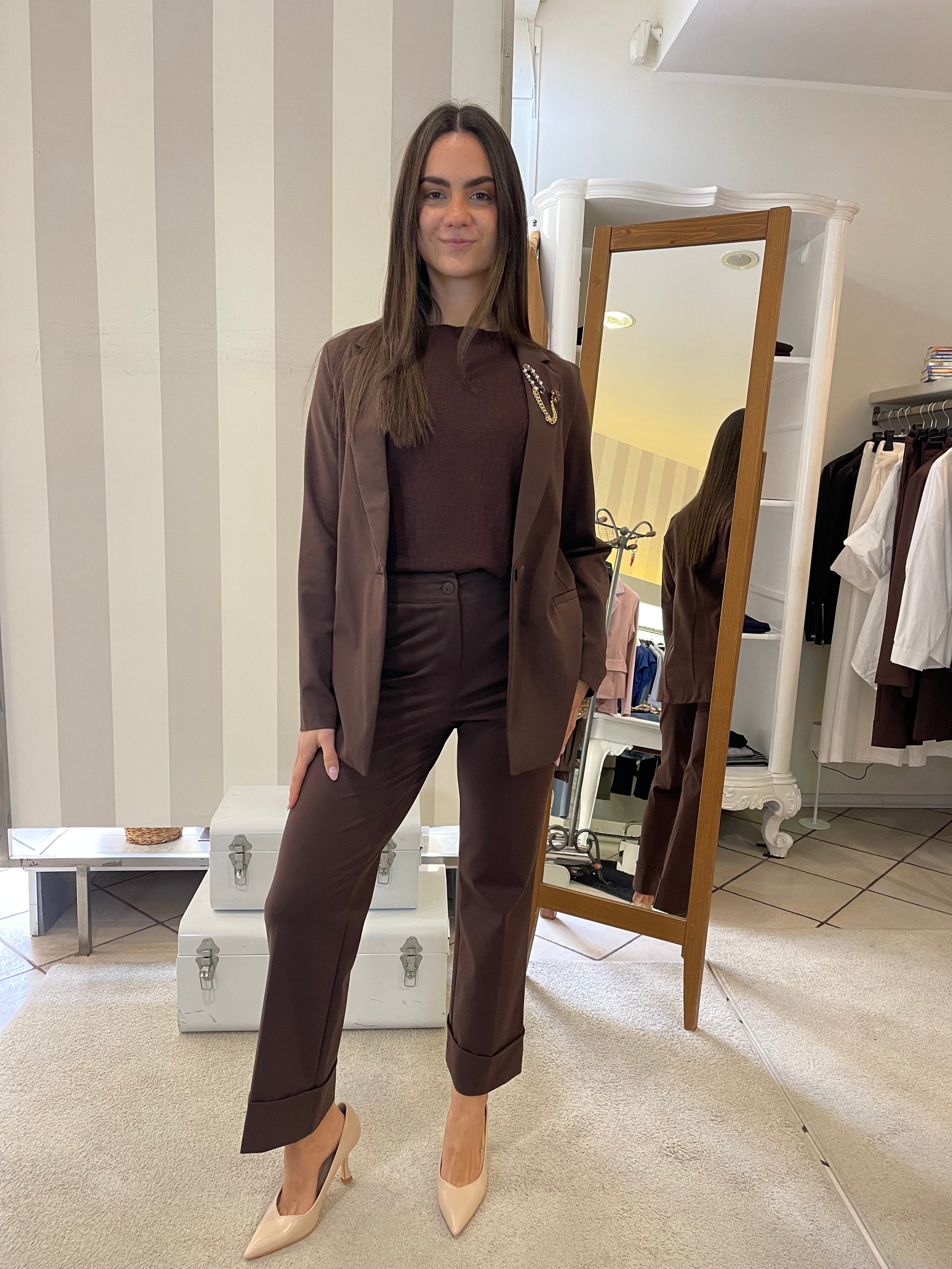 Descrizione: Completo in punto Milano con giacca taglio blazer lungo e pantalone in due modelli,taglio Wide leg con risvolto sul finale e modello sigaretta,stretto sulla gamba e sul fondo-entrambi i colori hanno pantalone sia modello wide sia modello sigaretta,scegli il tuo preferito.