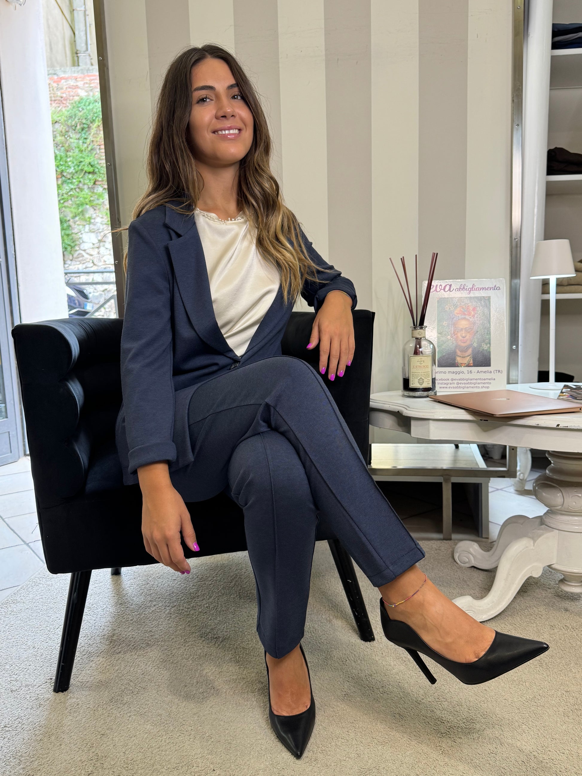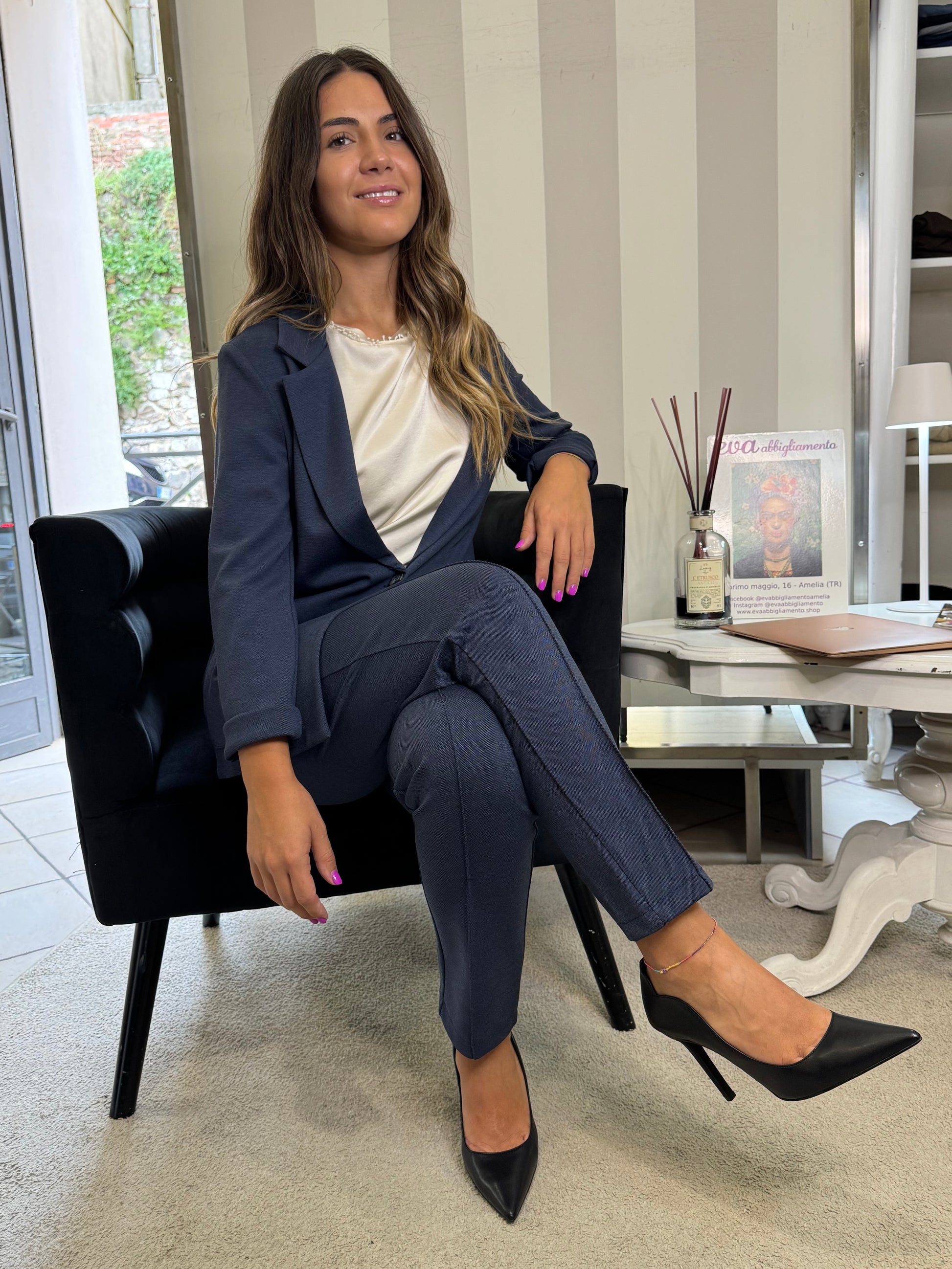 Descrizione: Completo composto da giacca effetto sartoriale, taglio lungo con due tasche frontali, pantalone Jogger con elastico in vita, ,costina sulla gambatessuto nelasticizzato tipo felpa