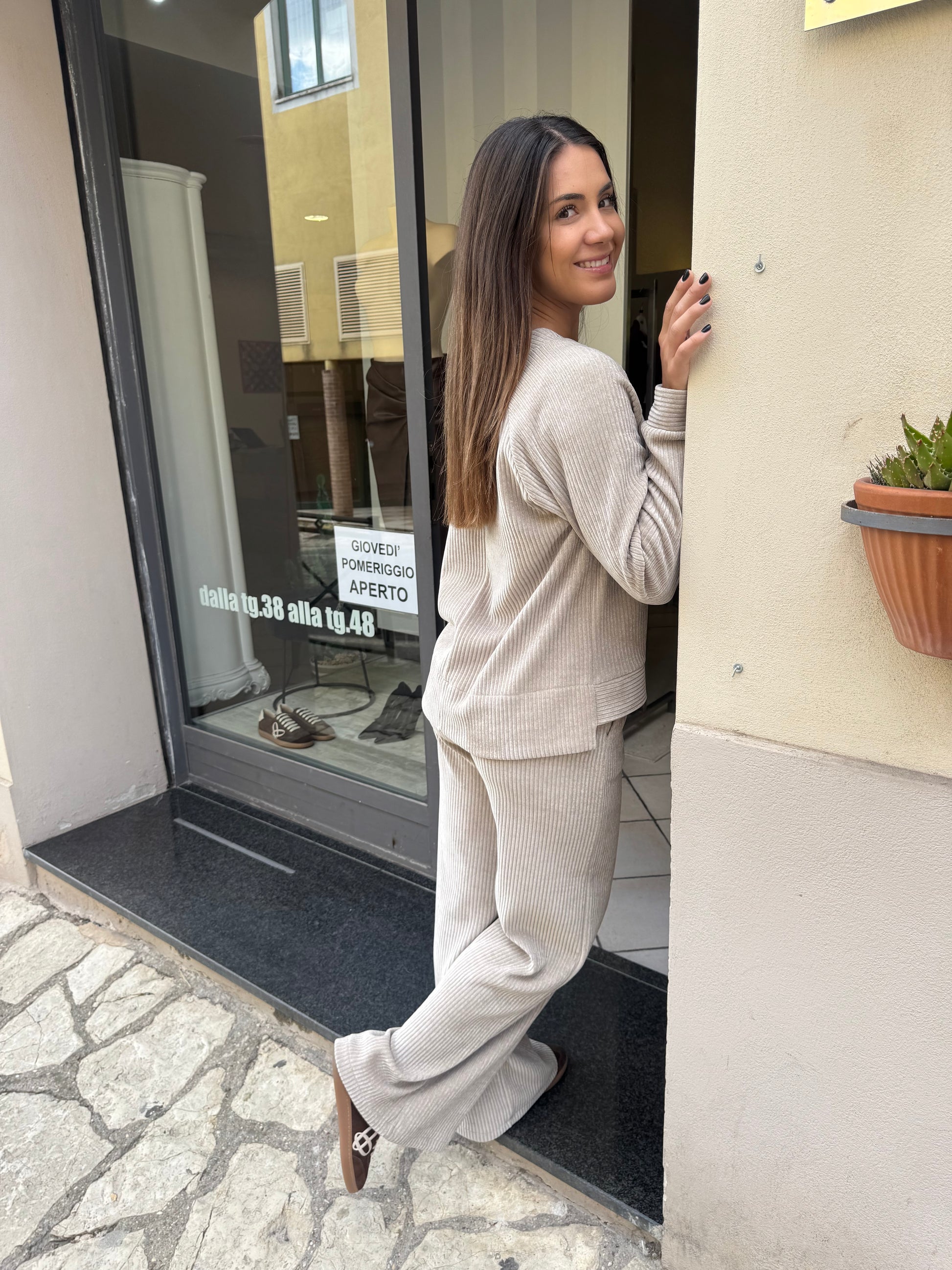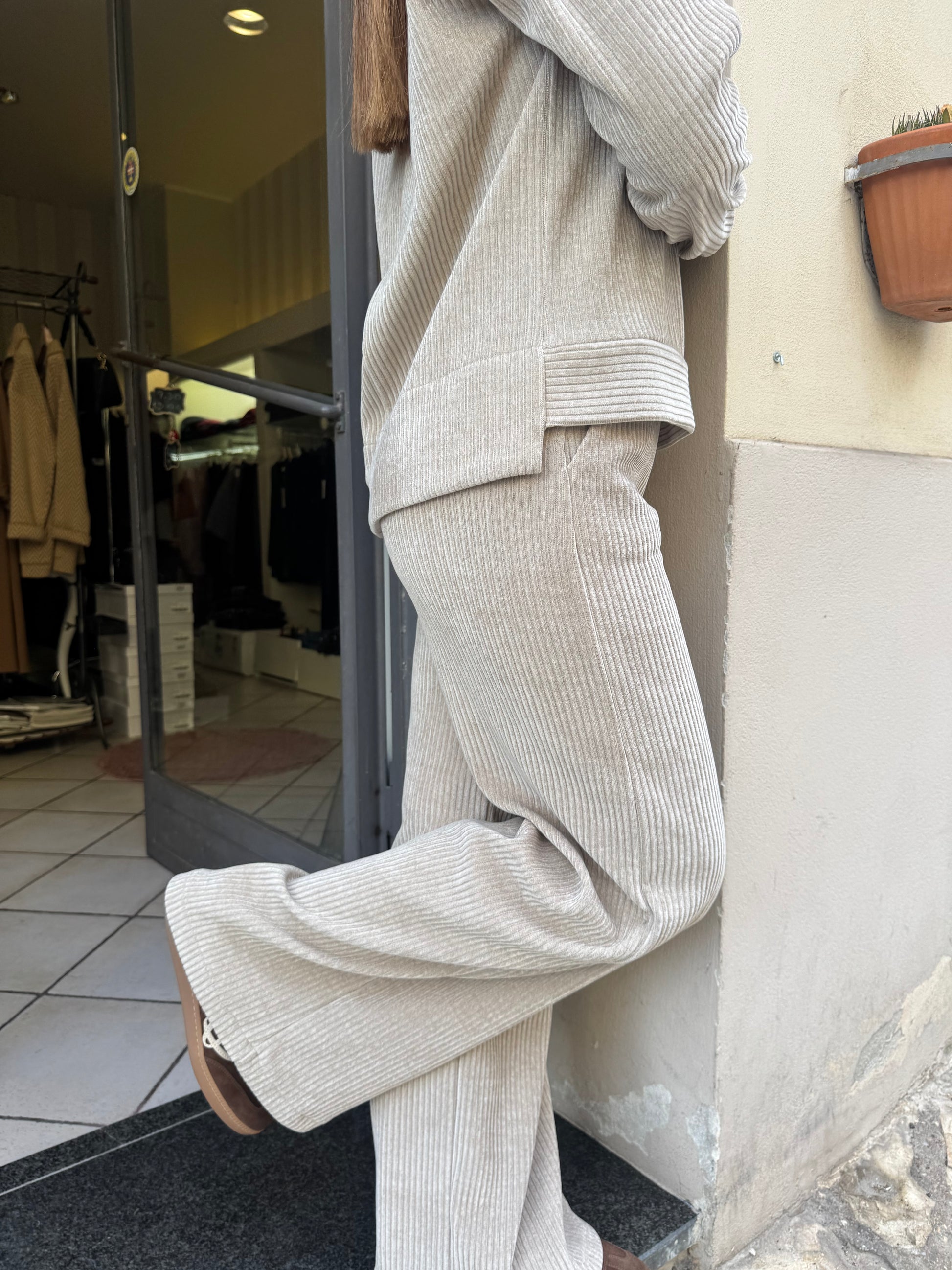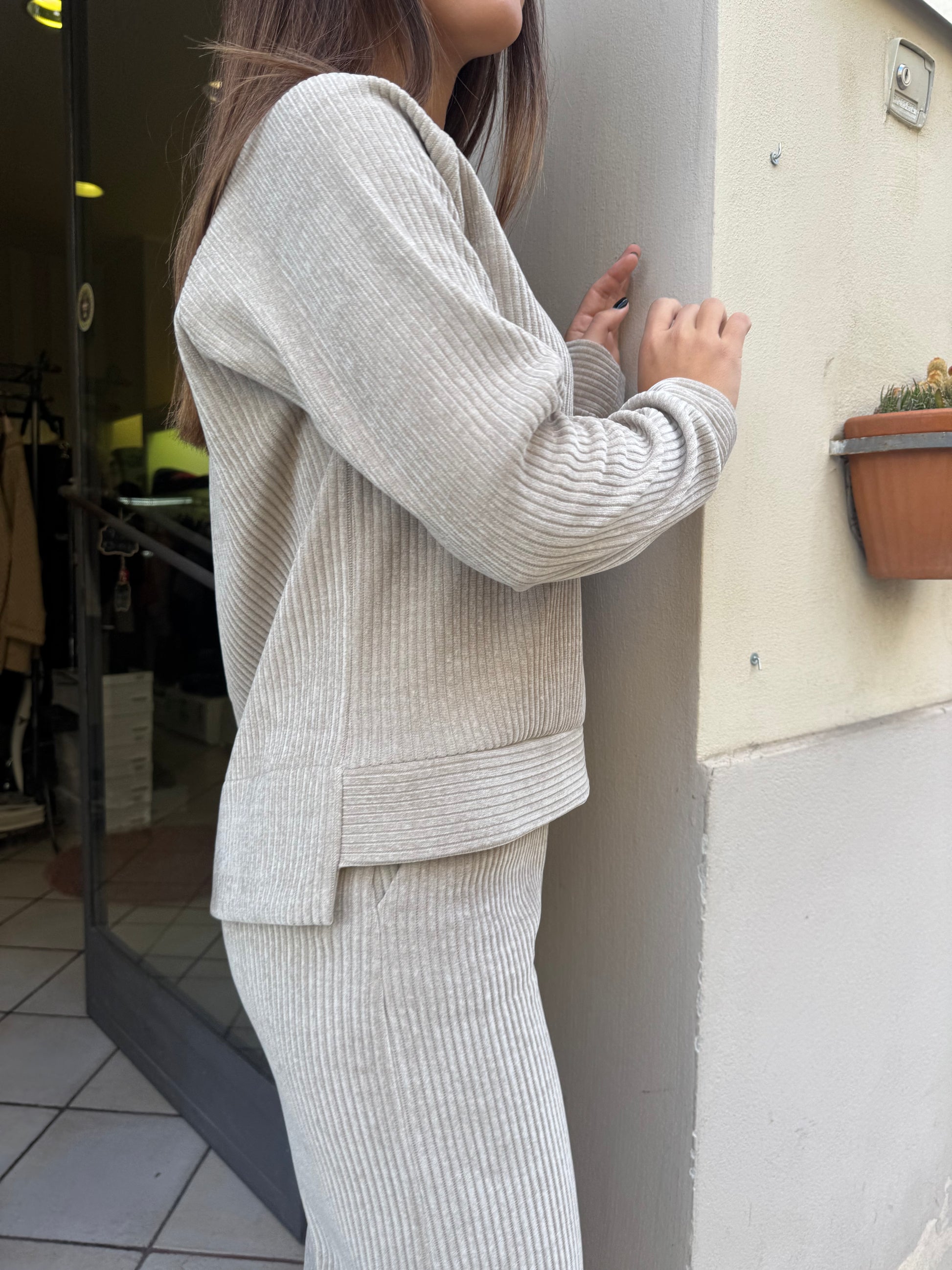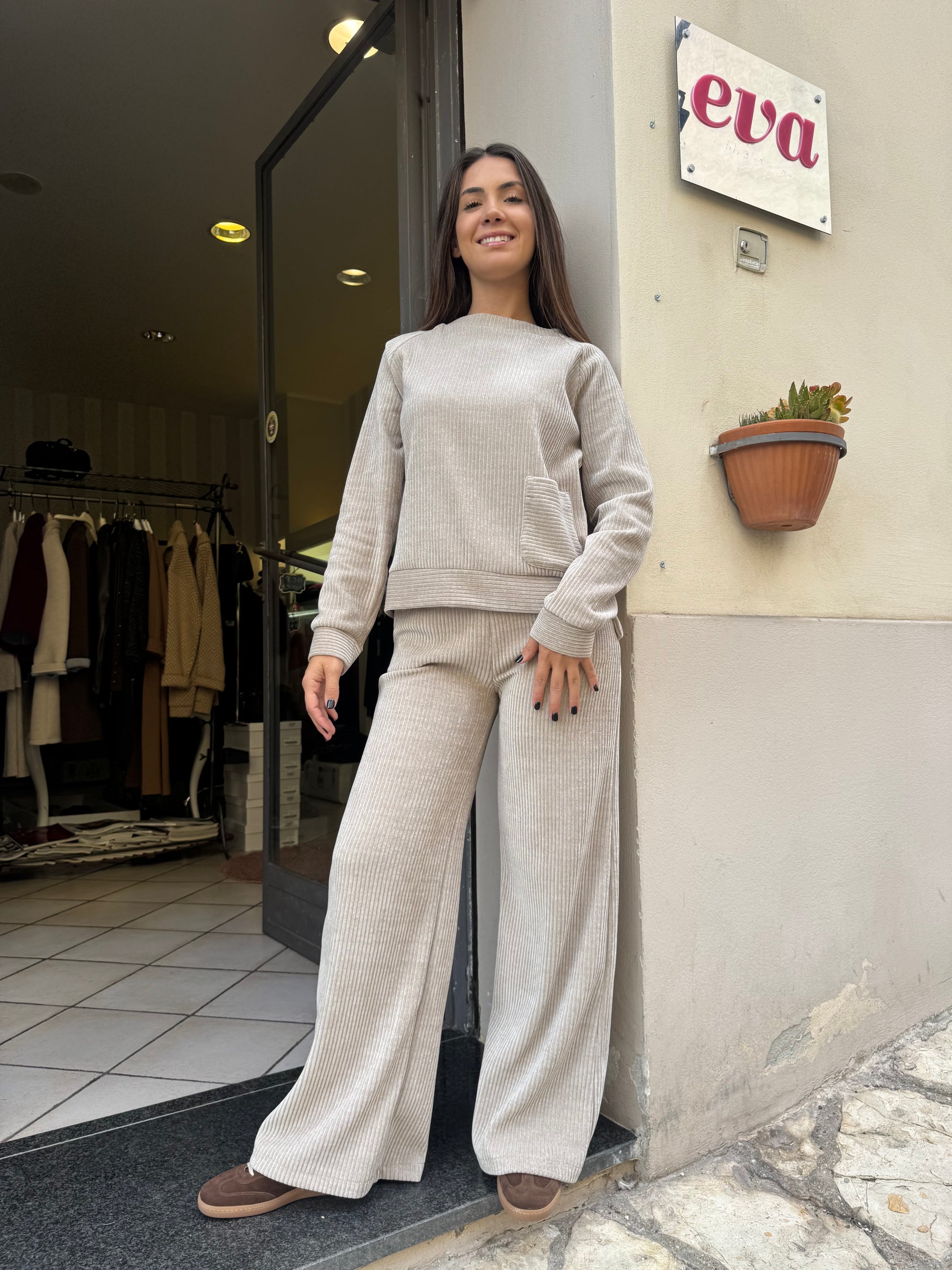 Descrizione: Completo in velluto conn felpa taglio quadrato ,una piccola taschina applicata sul davanti, girocollo, polsino sulla manica