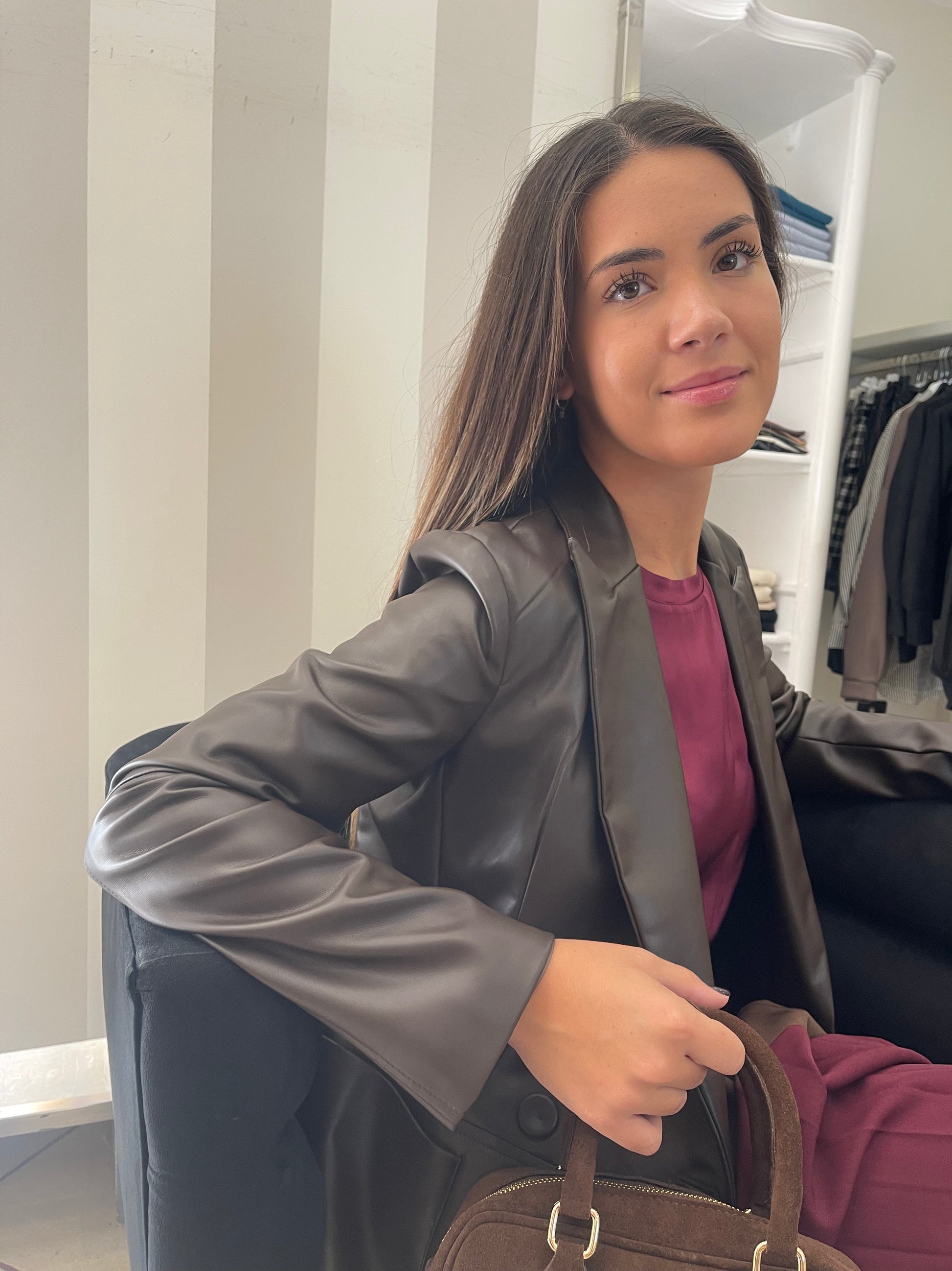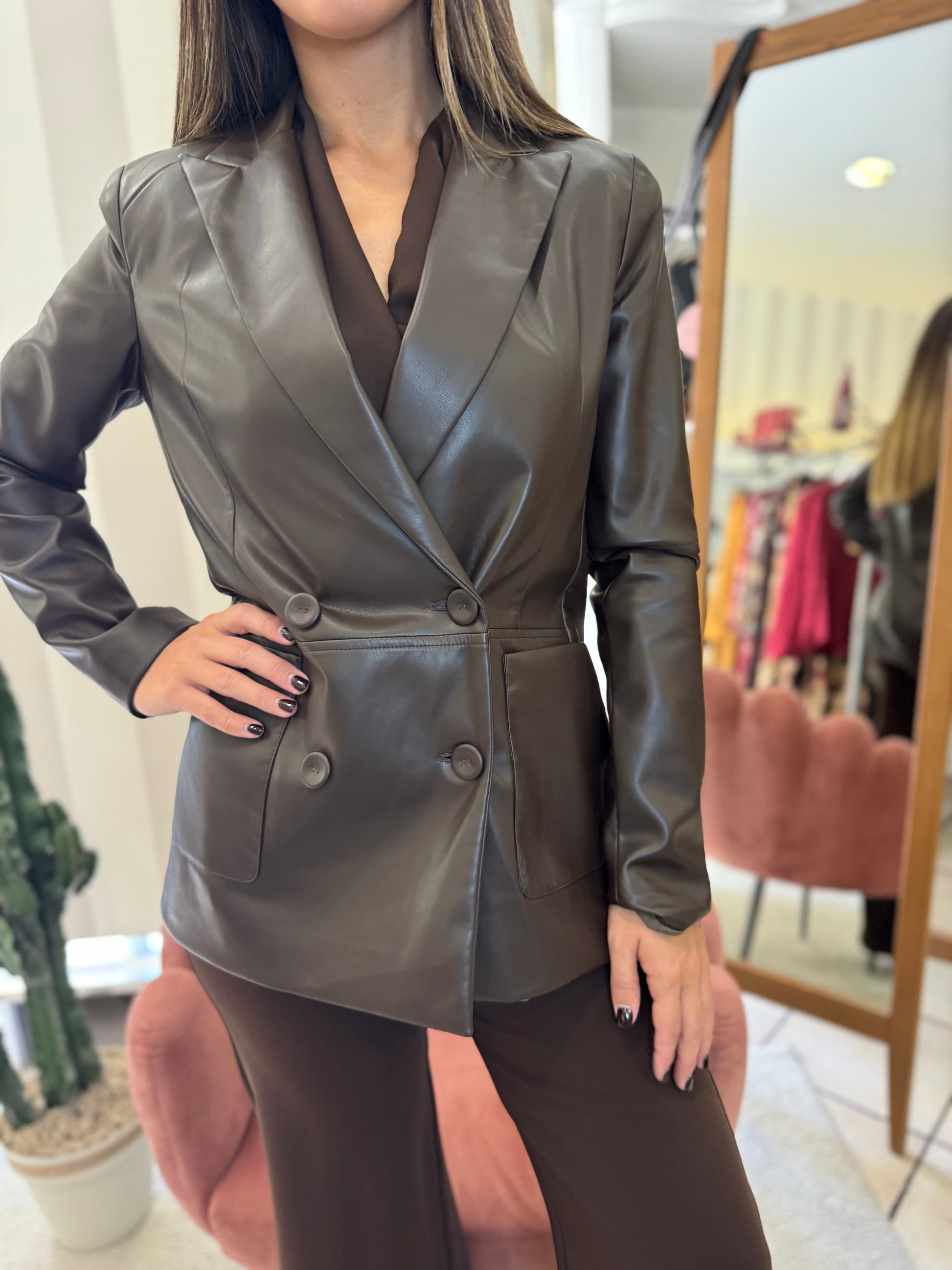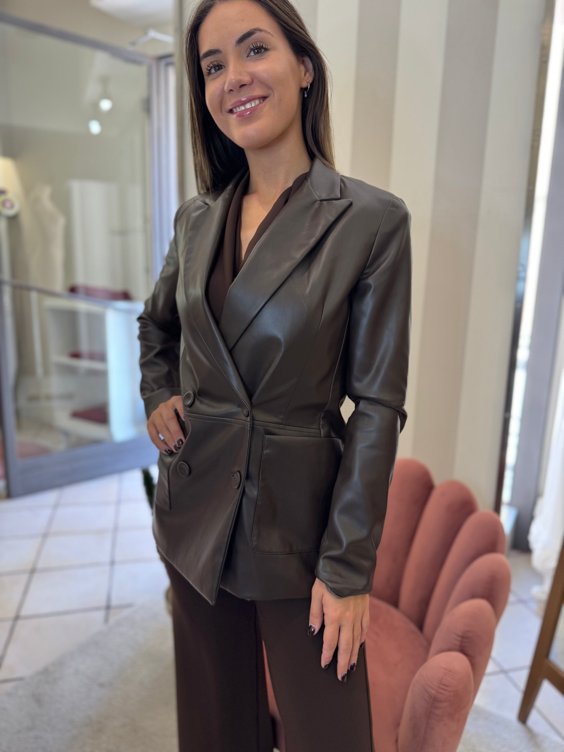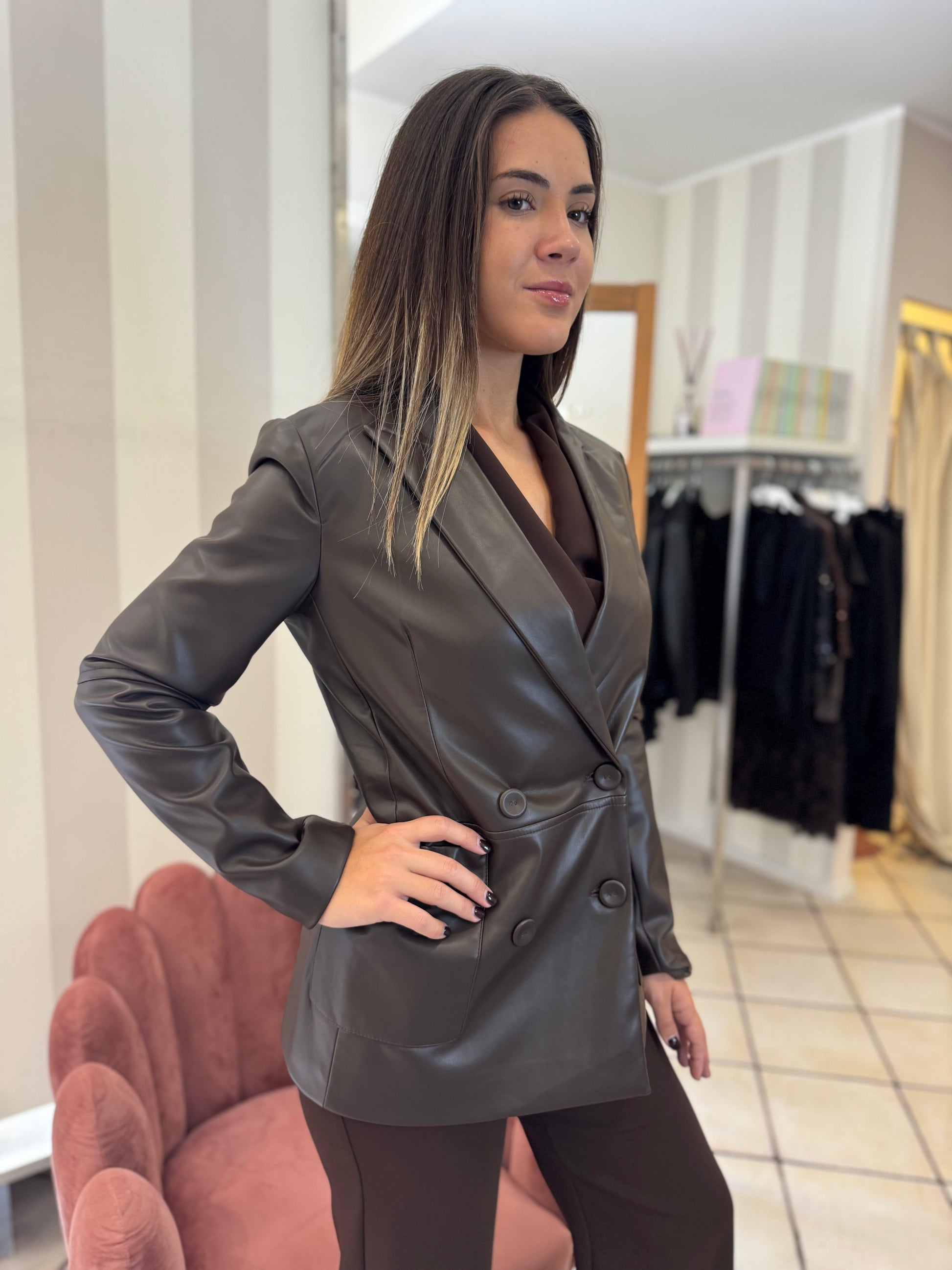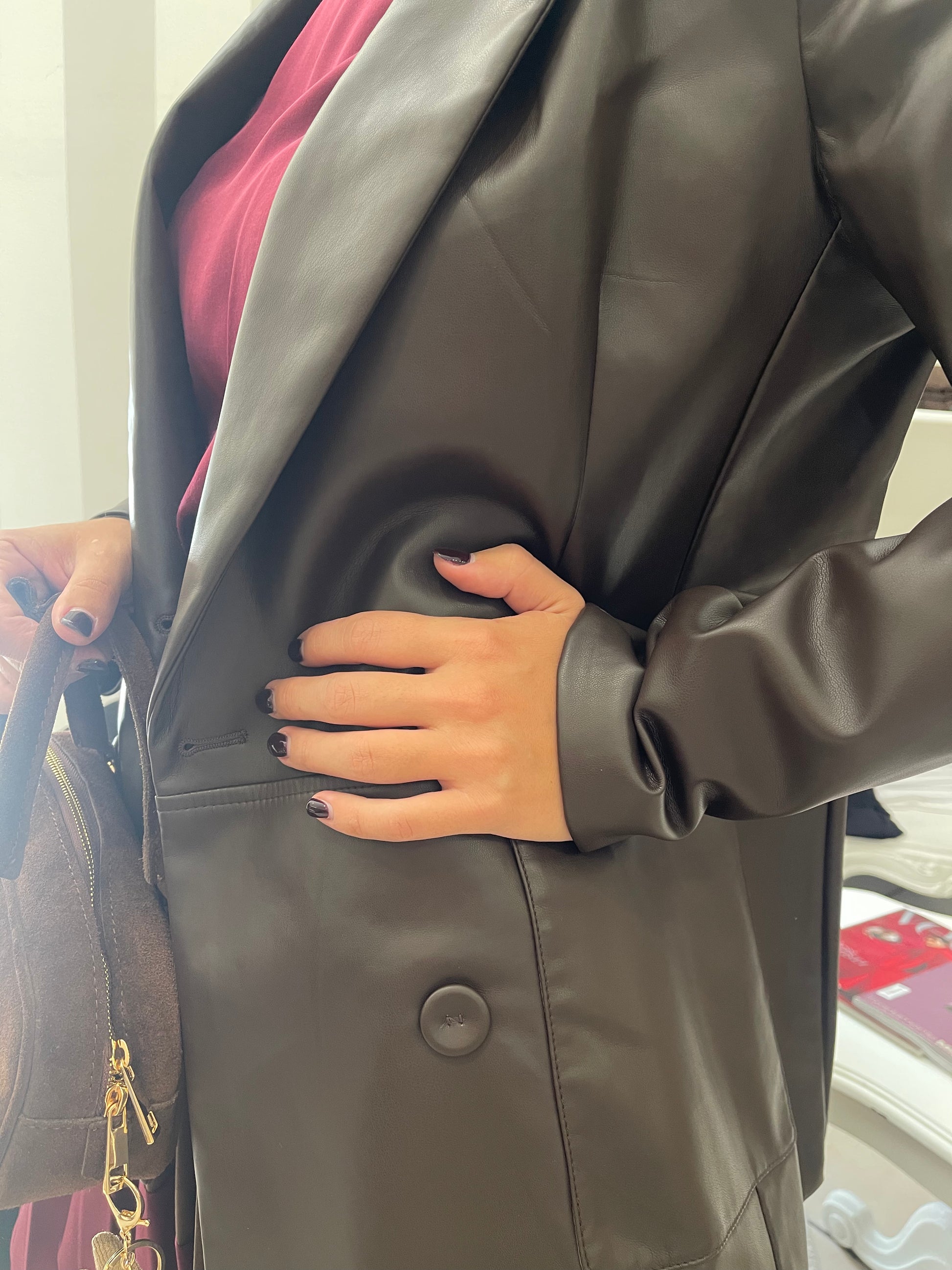 Descrizione: Giacca taglio Blazer in ecopelle doppiopetto marrone, taglio lungo, tasche frontali, interno foderato.