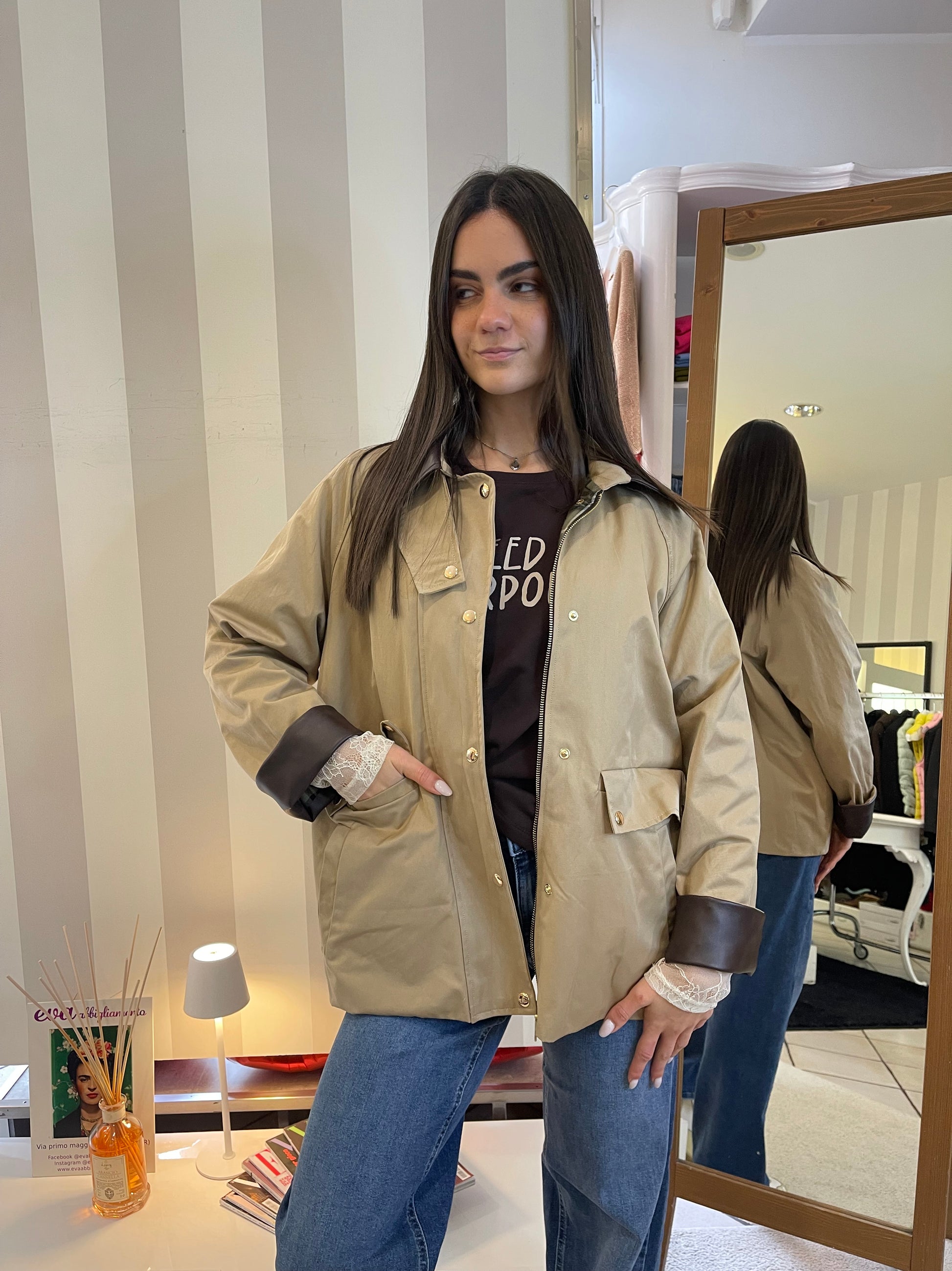 Descrizione: Giacca utility Vicolo,tasche con bottoni oro,chiusura con zip e bottoni,dettaglio in ecopelle marrone su polsini e colletto,fodera a quadri verde