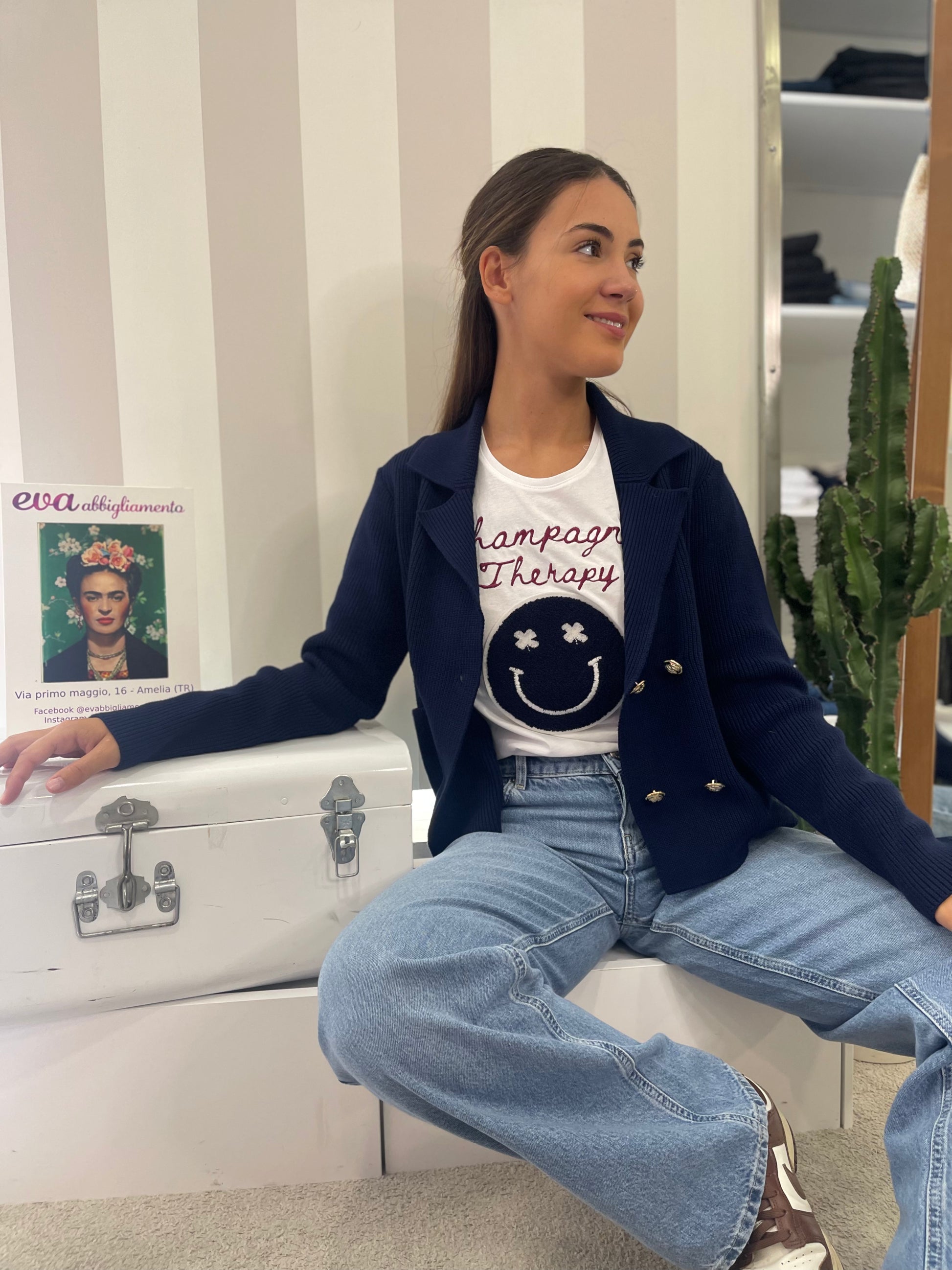 Descrizione: Giacchina in maglia doppiopetto con 4 bottoni oro e due taschine.