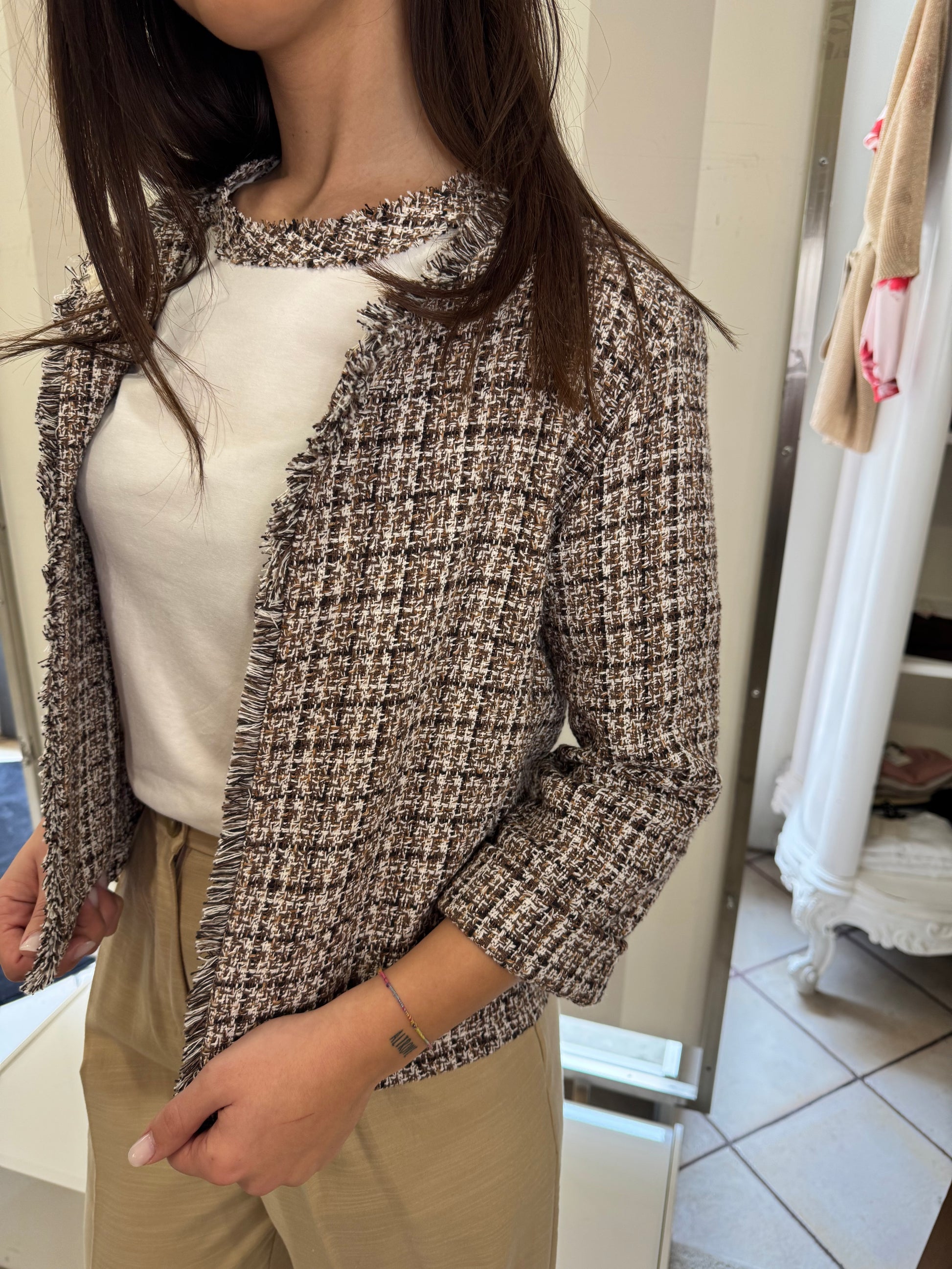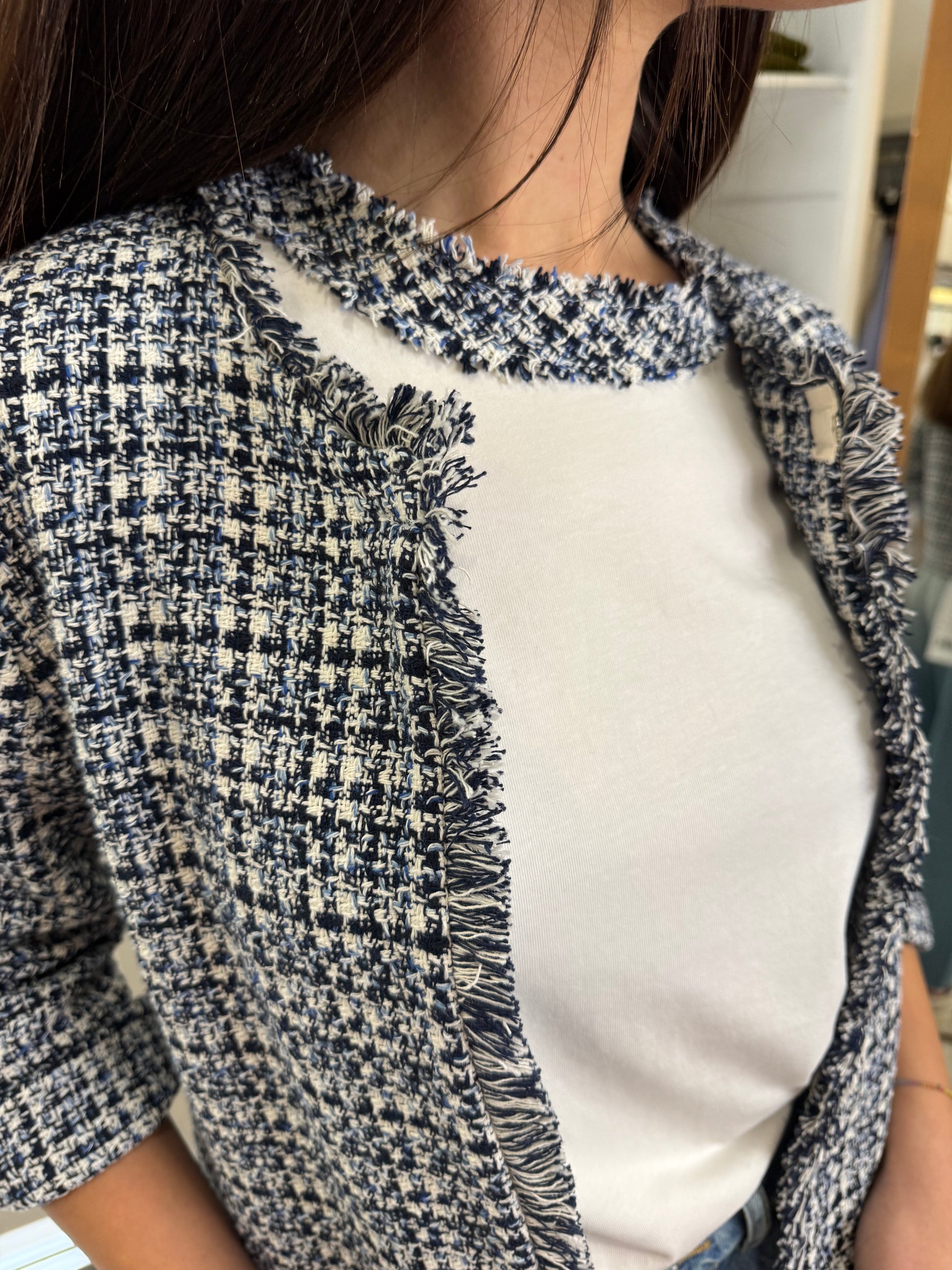 Descrizione: Giacchina corta modello "Chanel", trama intrecciata,chiusura al collo con gancetto metallico