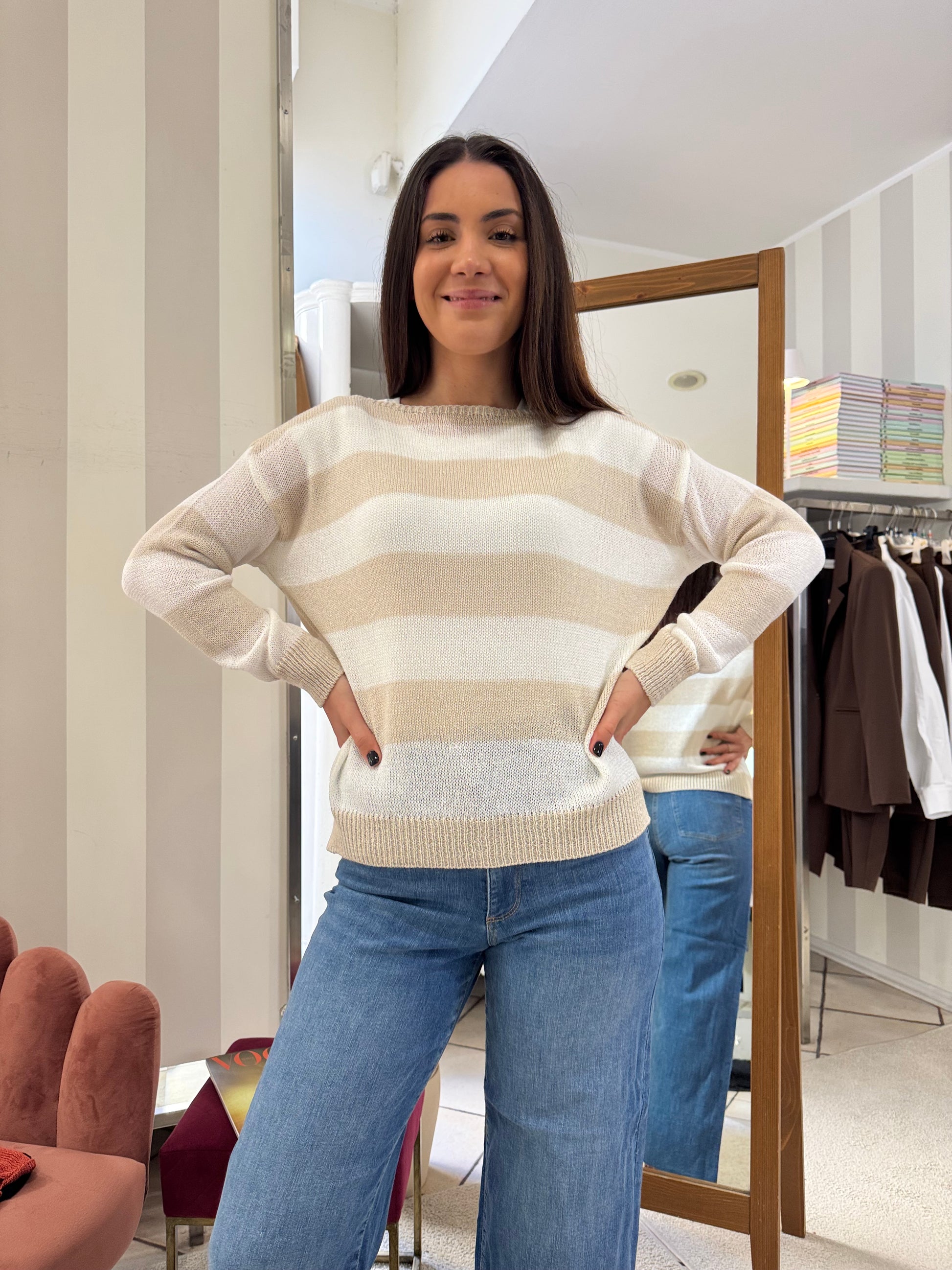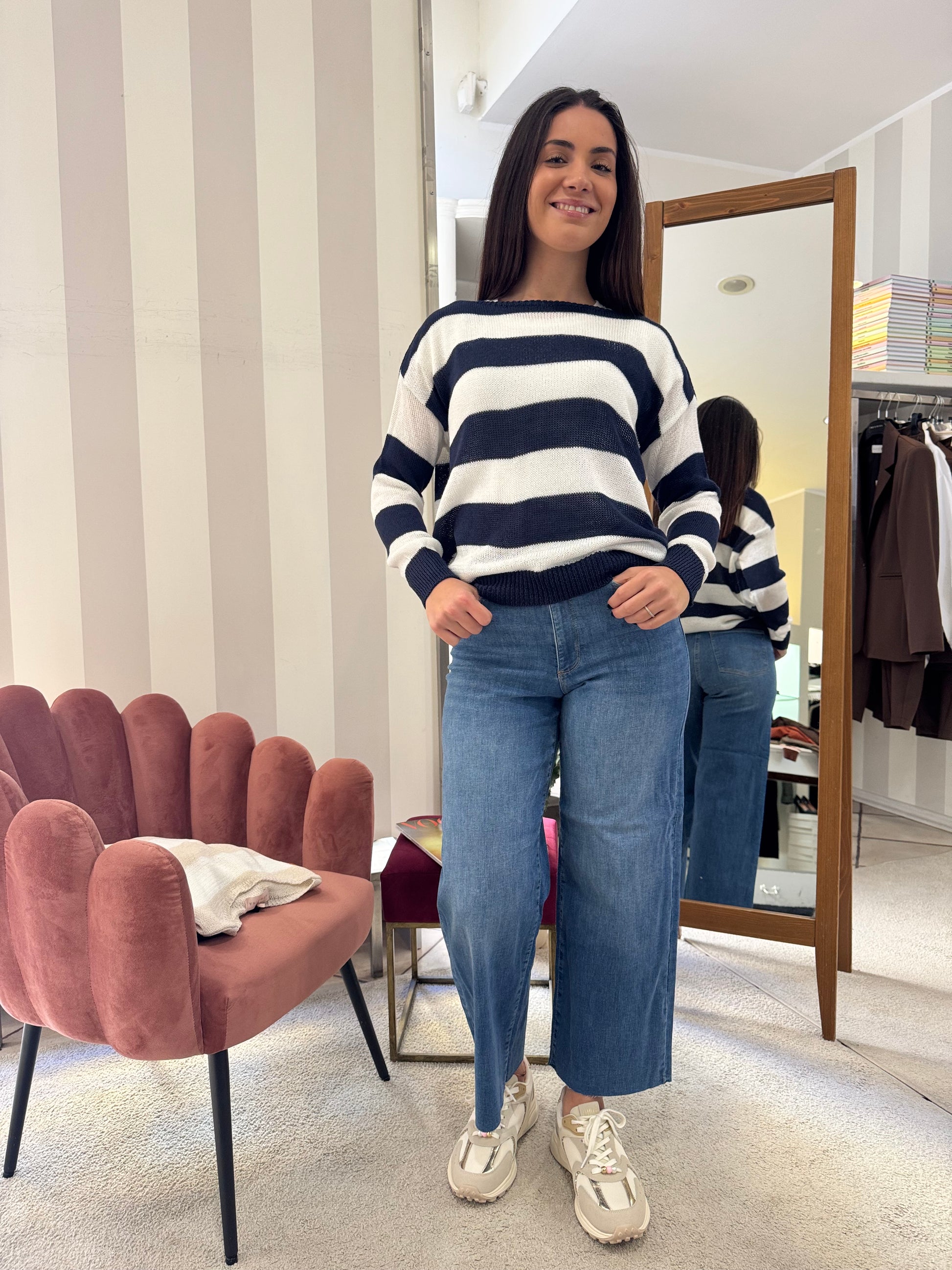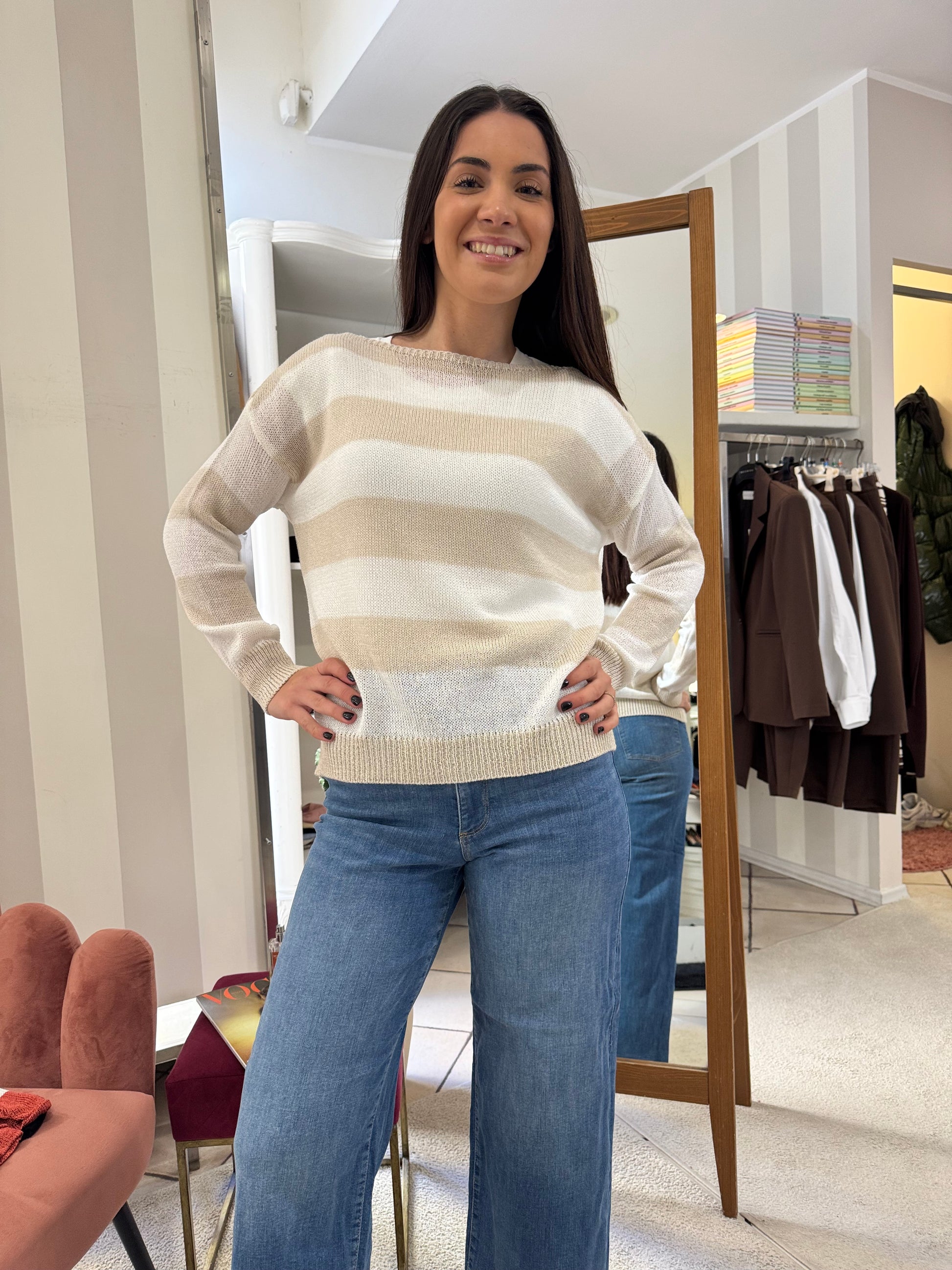 Descrizionme: Maglia a righe larghe in filo, scollo a barca,manica lunga