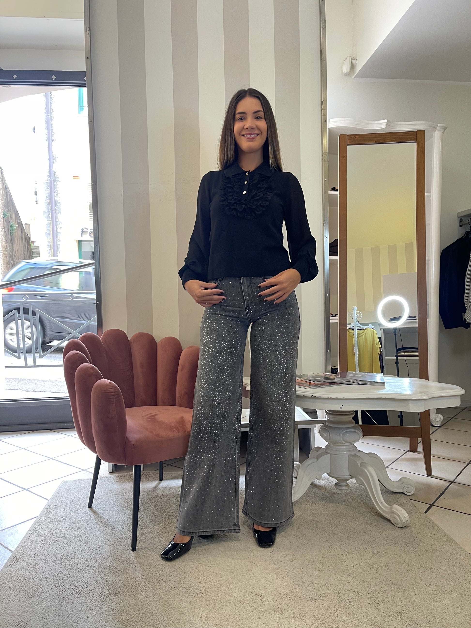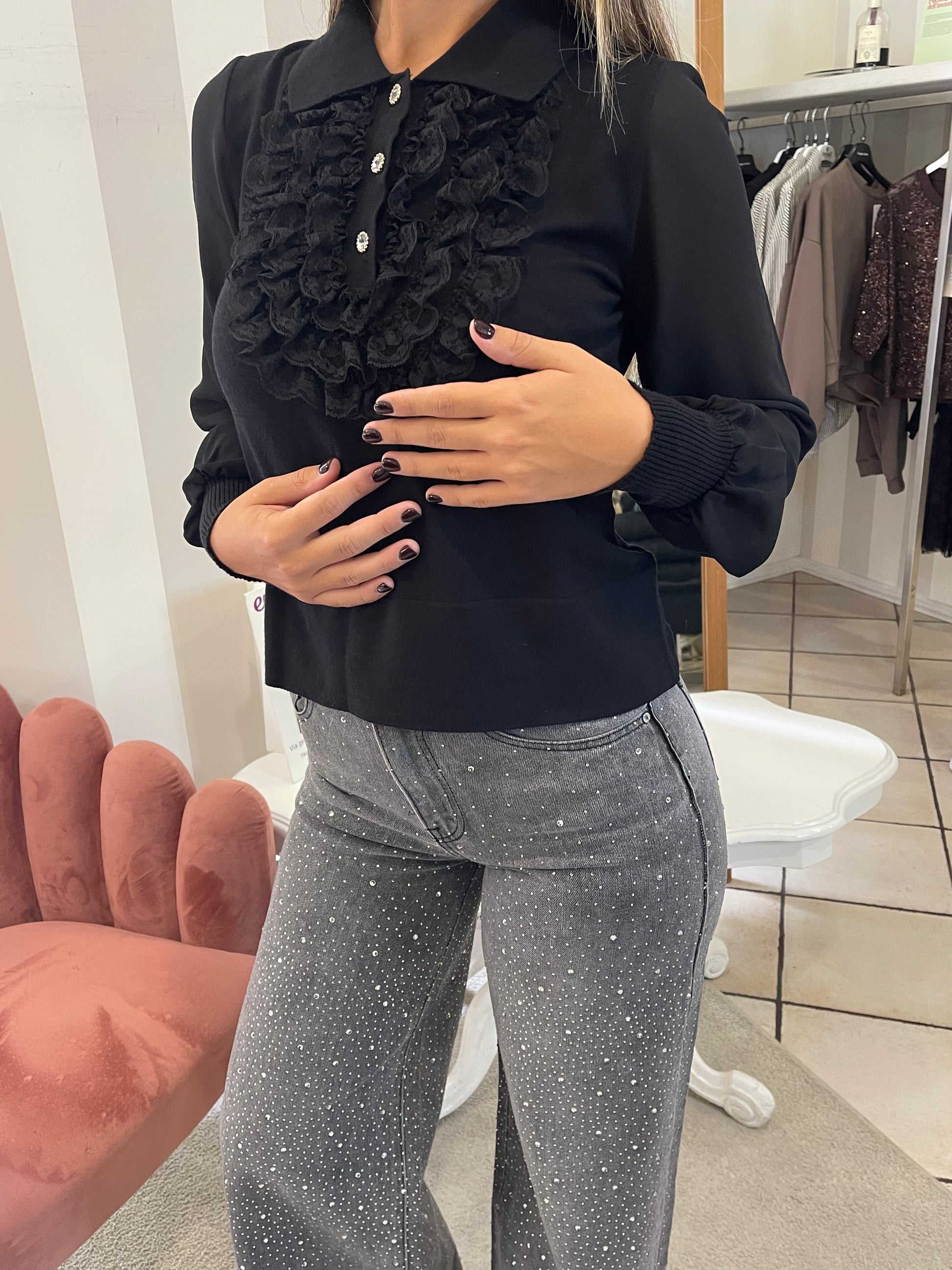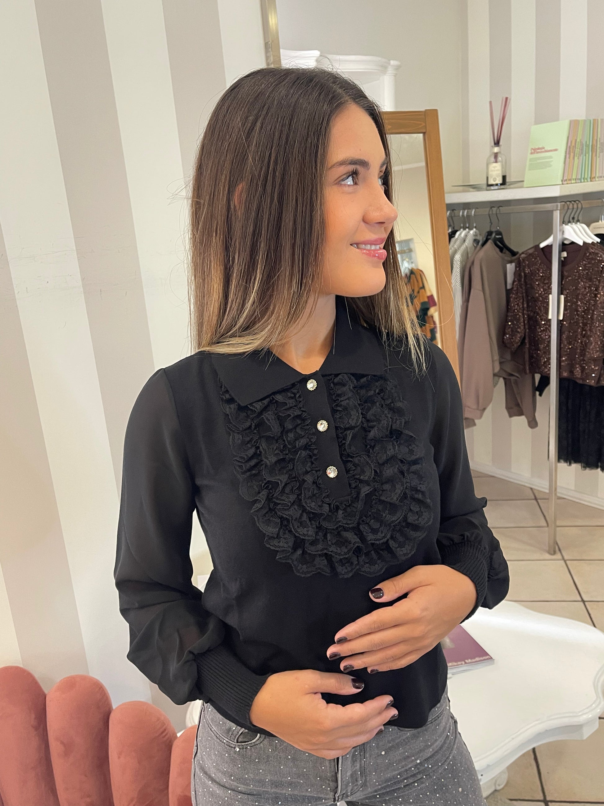 Descrizione: Maglia polo in filo e dettaglio manica in georgette, tre bottoni gioiello e colletto.