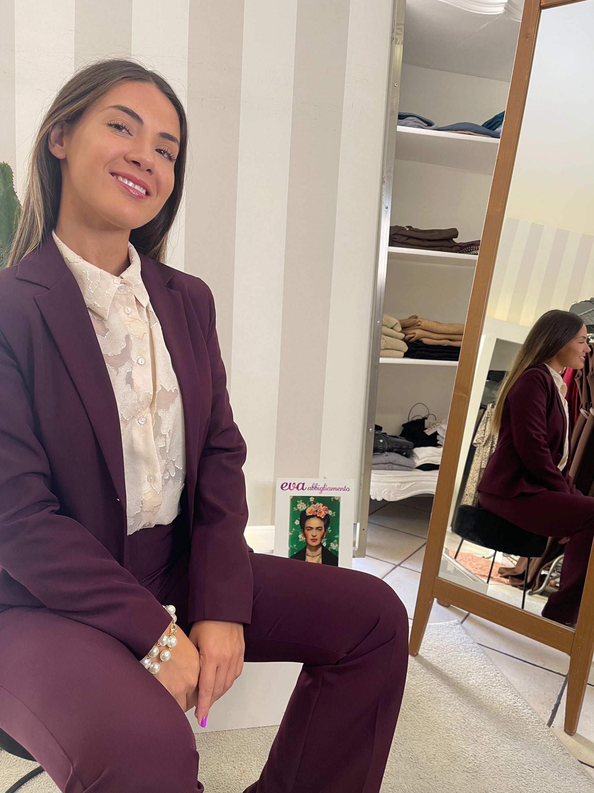 Descrizione: Completo Brend colore Burgundy composto da giacca con un bottone e pantalone gamba flare a zampa