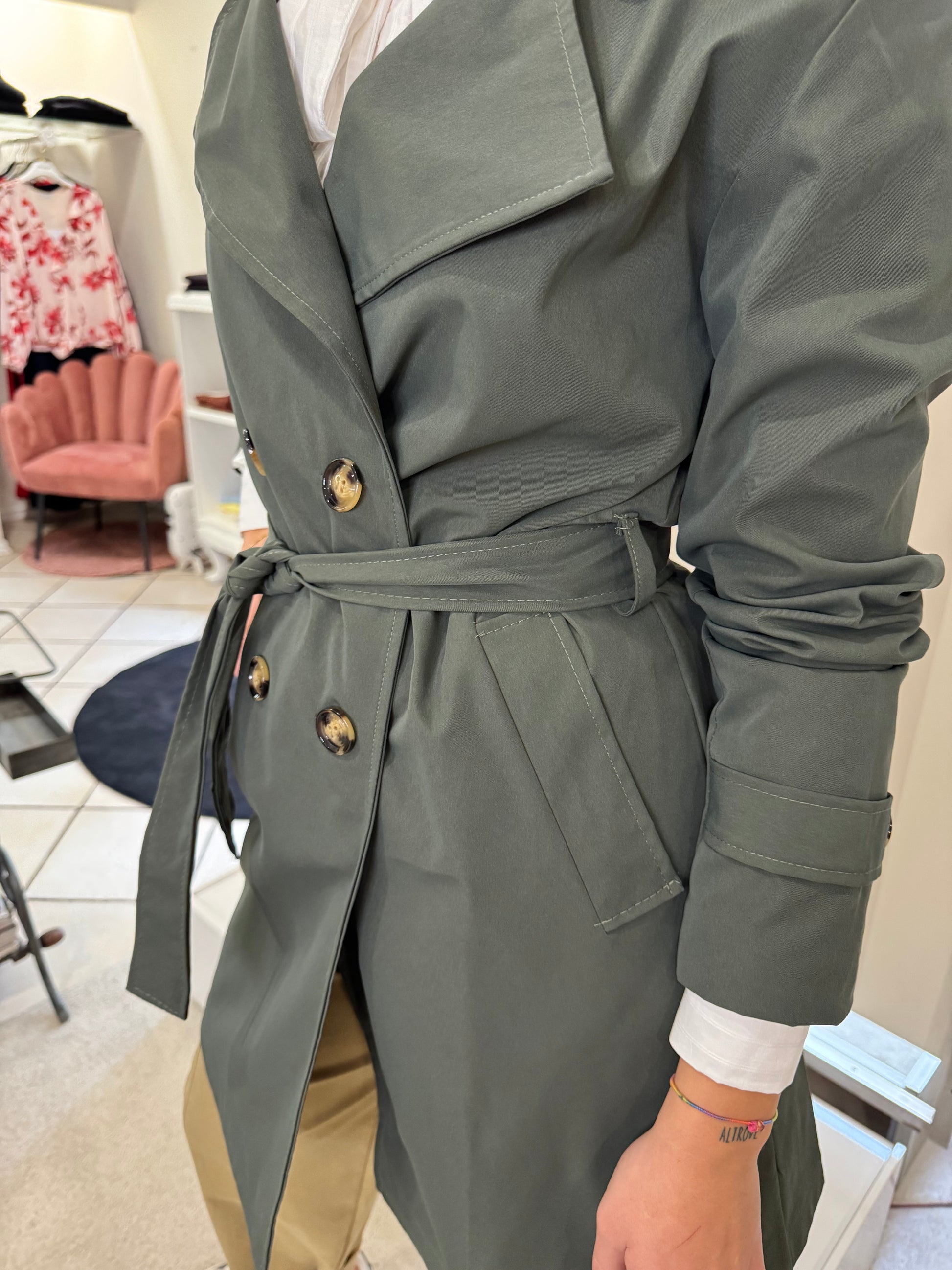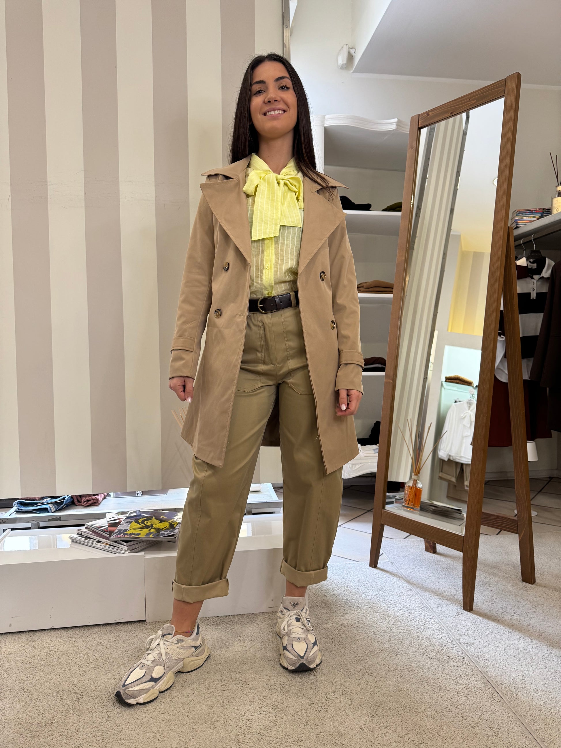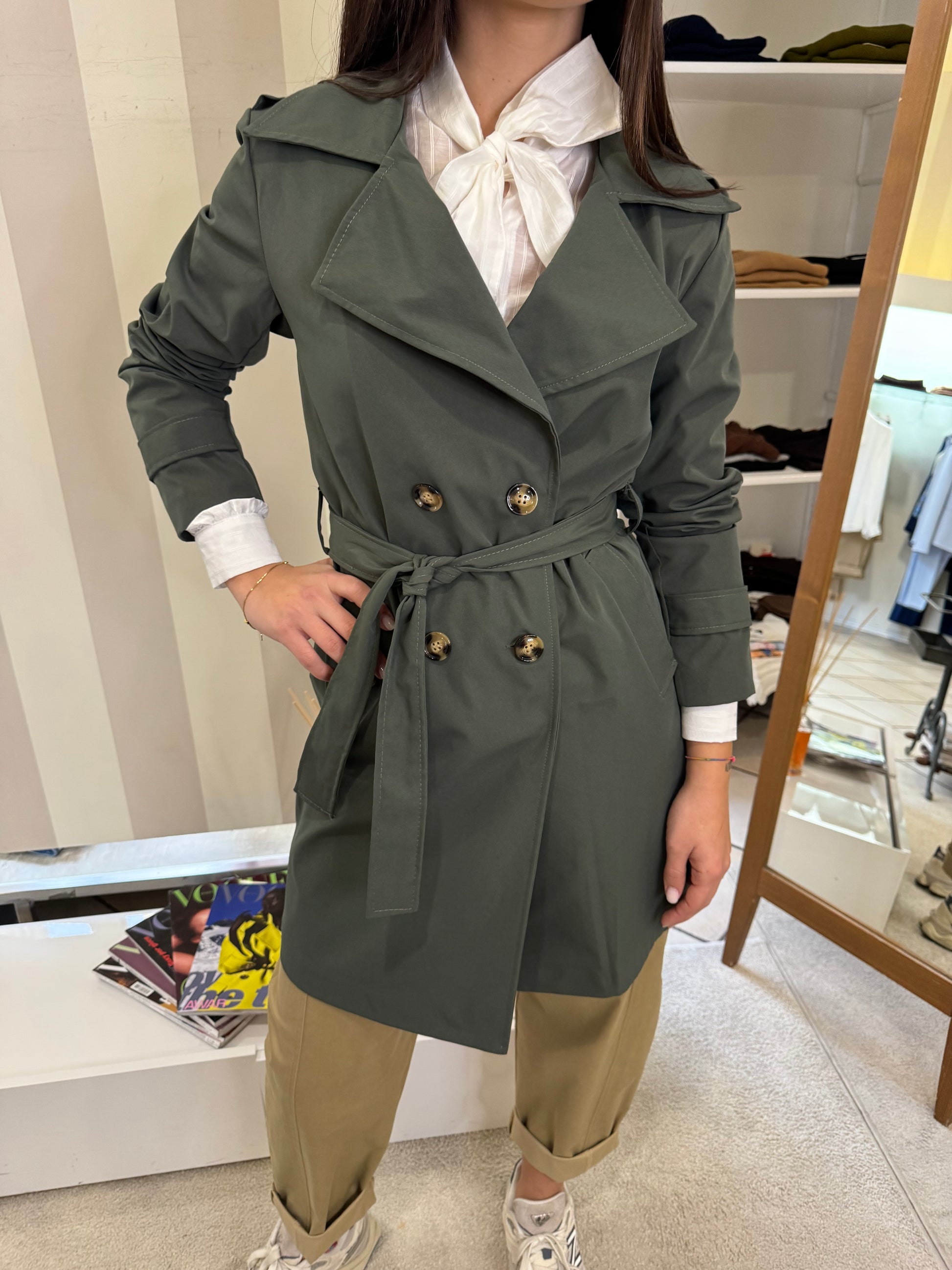 Descrizione: Trench media lunghezza, sopra al ginocchio, chiusura doppiopetto con cintura, tasche,foderato internamente.