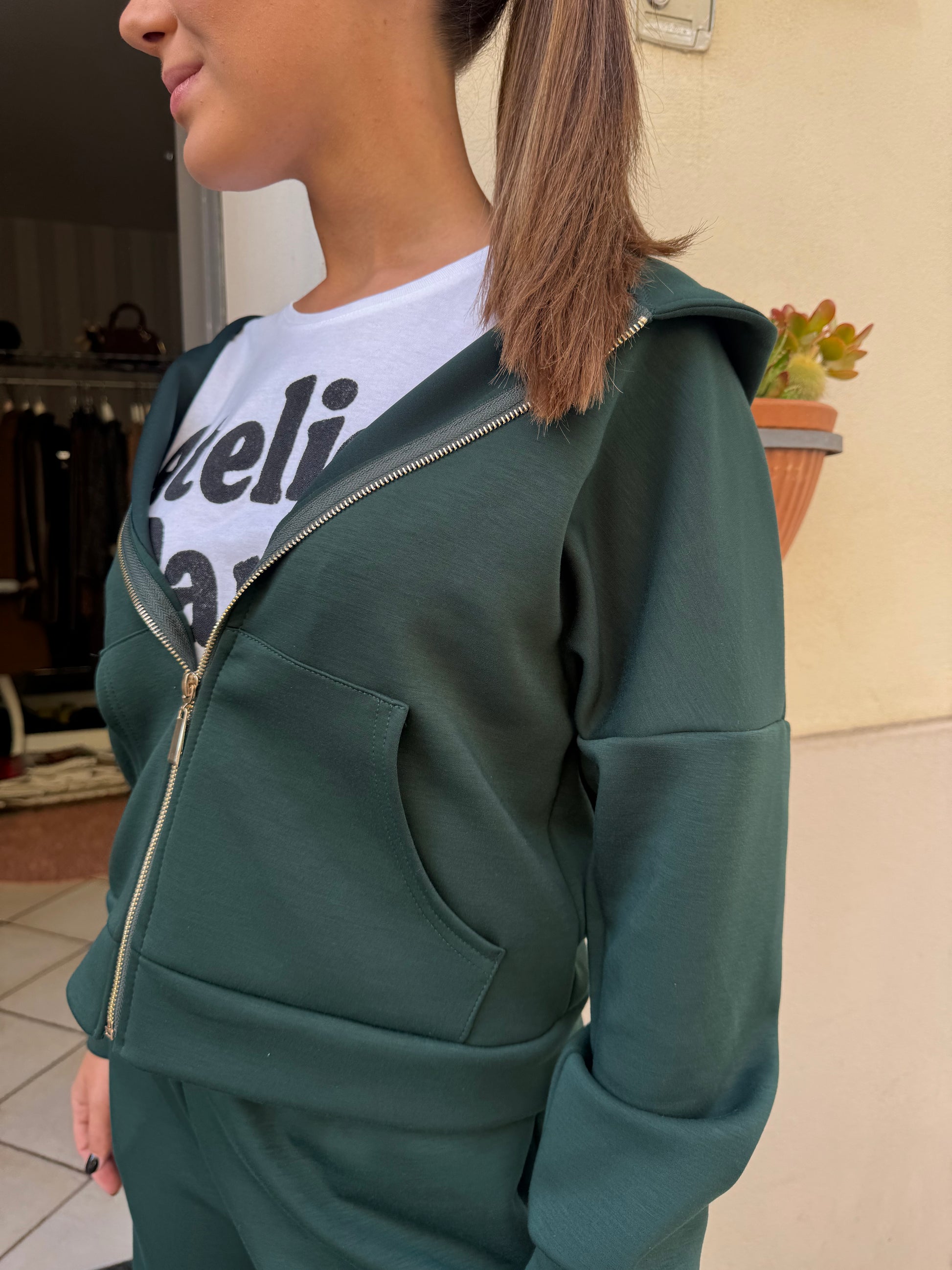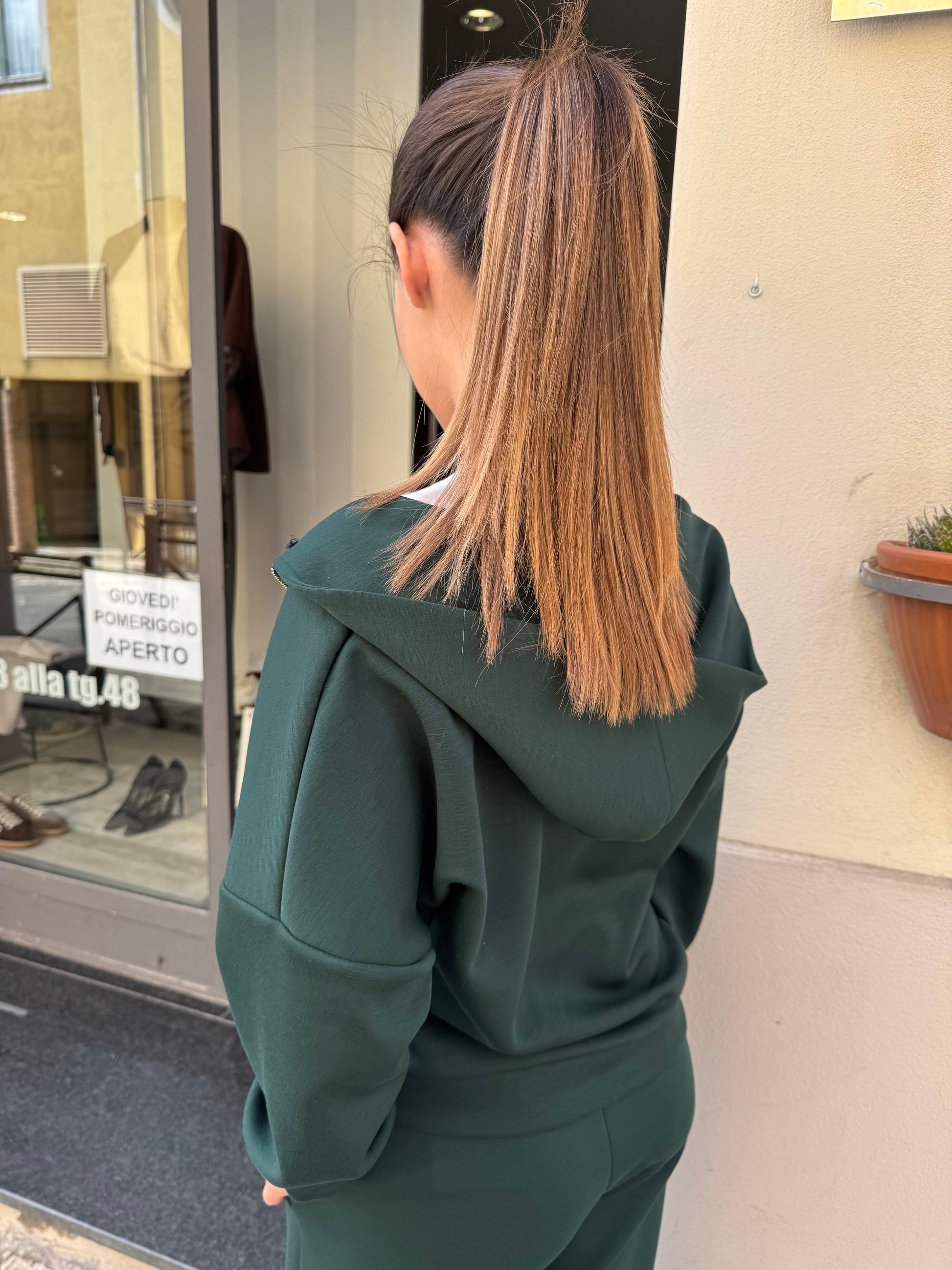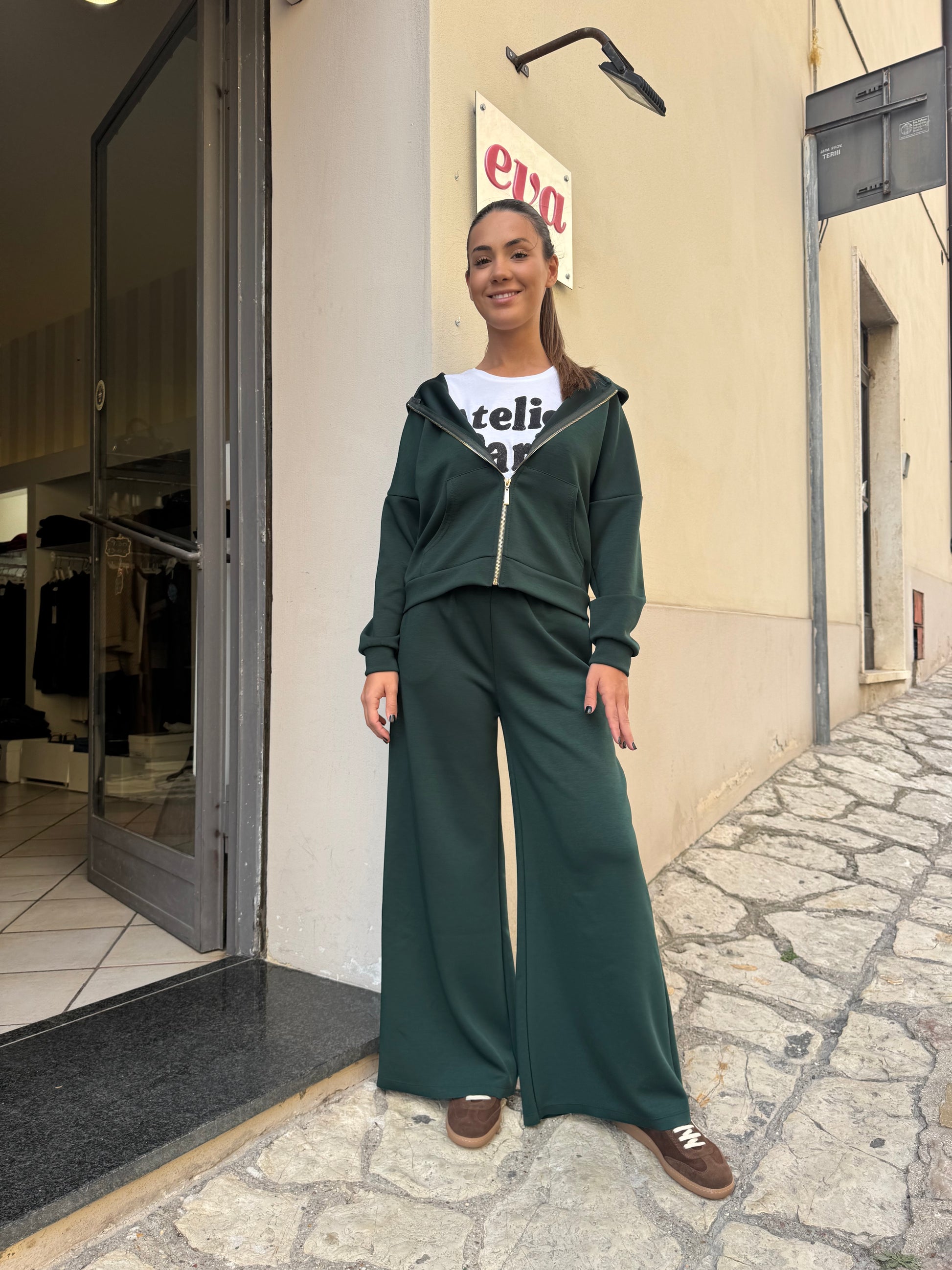 Descrizione: Completo in light neoprene, composto da felpa con zip e cappuccio e pantalone gamba ampia, elastico in vita e due tasche